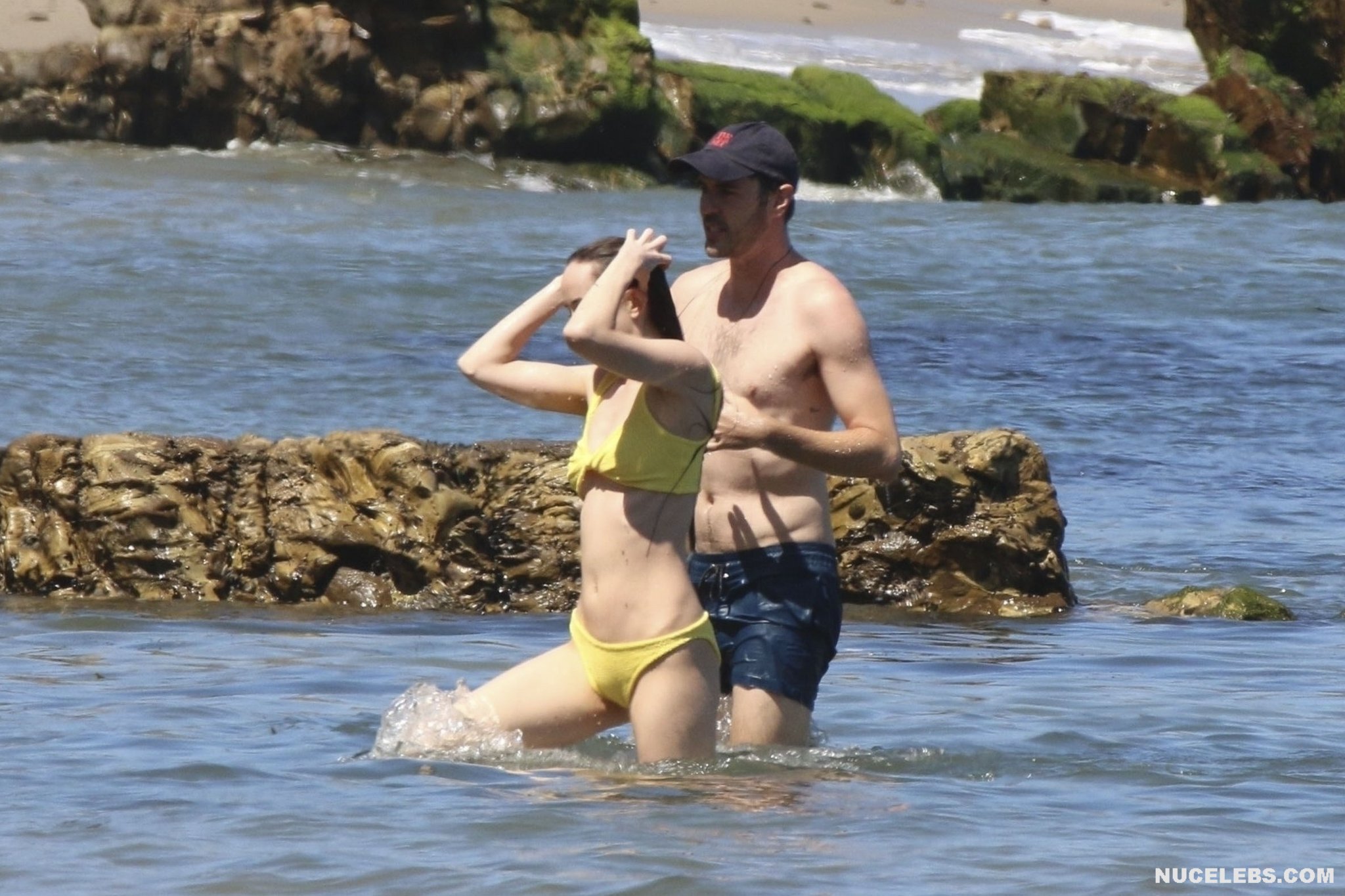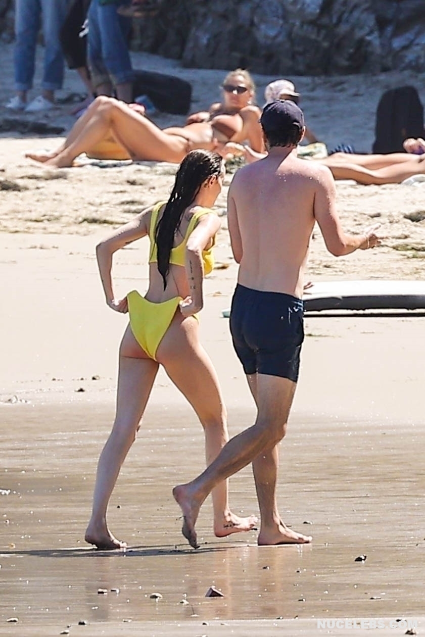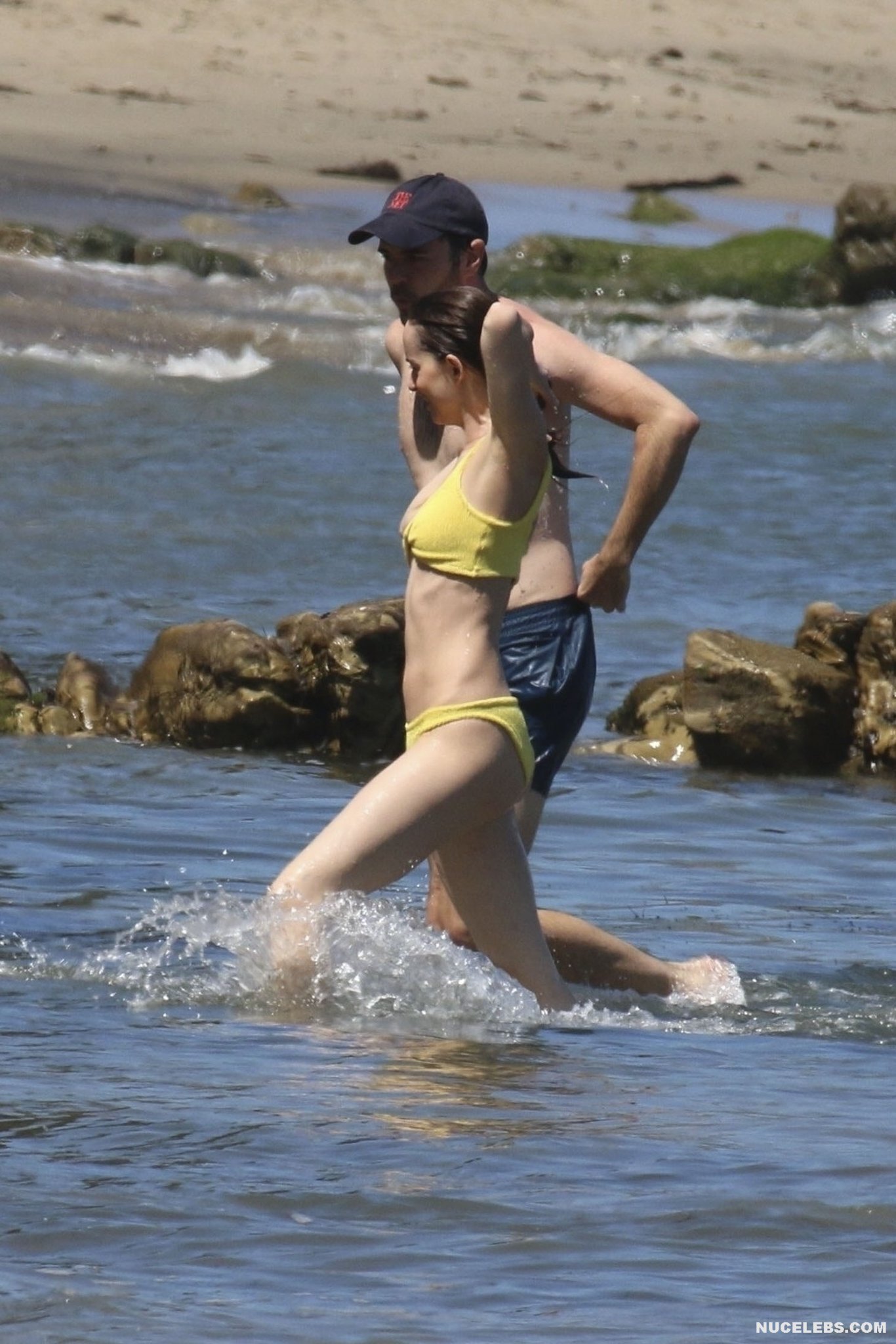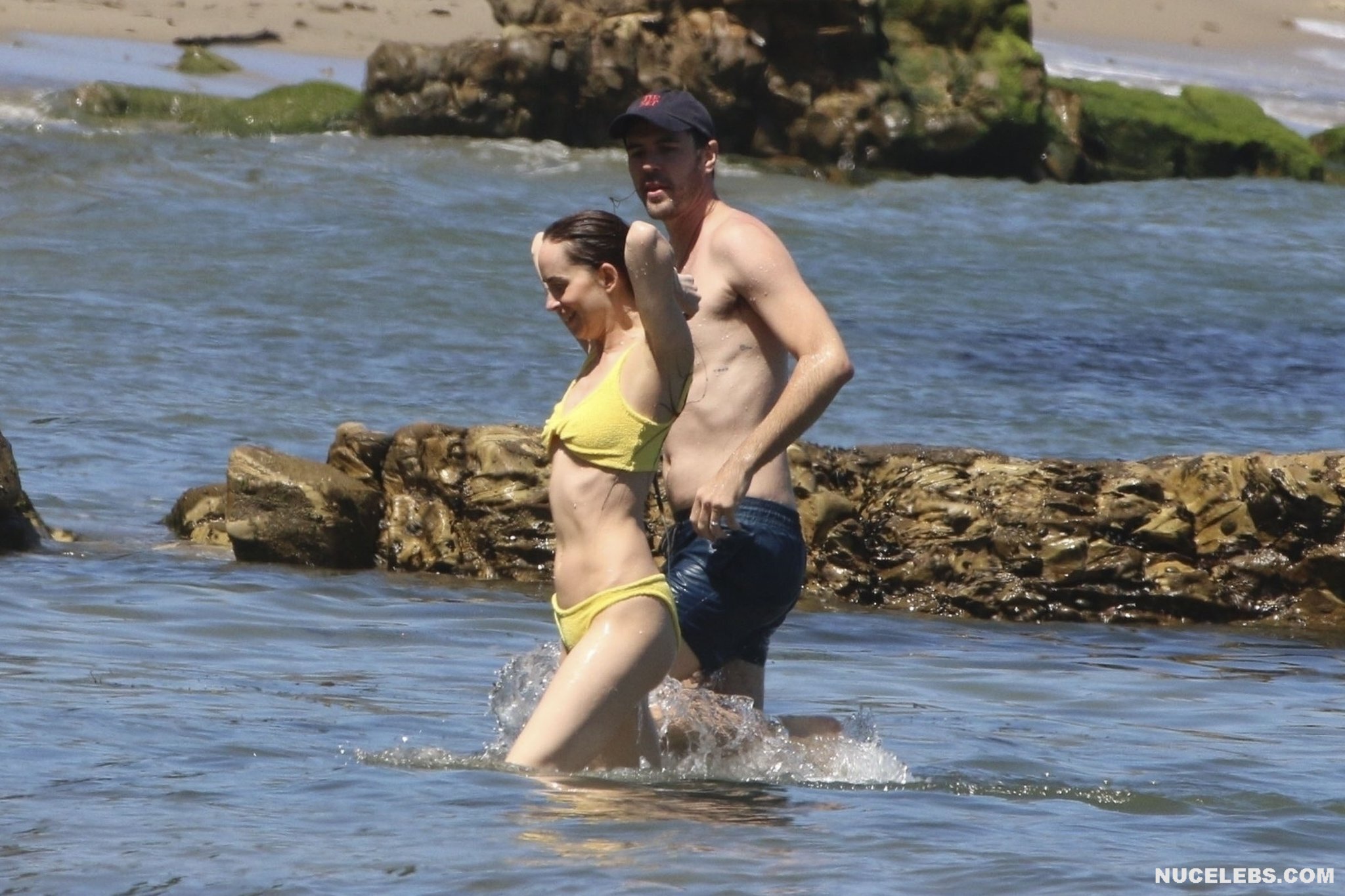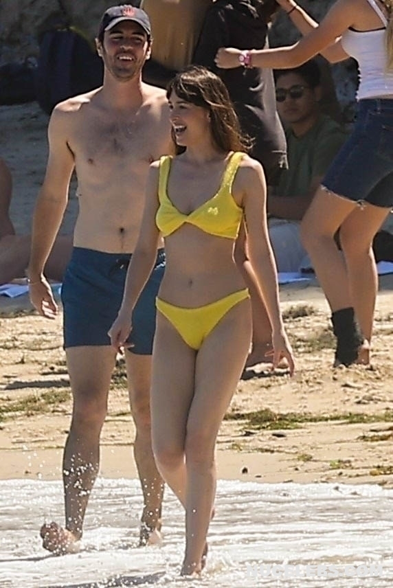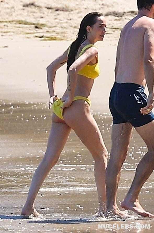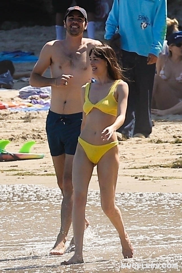 Dakota Johnson is exceptionally skilled as an actress and has a magnificent figure to boot. You’ll be captivated when you see her stunning beach photos. Paparazzi photographed her as she emerged from the water. The wet yellow bikini seemed to be sliding a little off her slender figure. So Dakota Johnson periodically pulled up her miniature panties, which were trying to slide down her sweet booty!