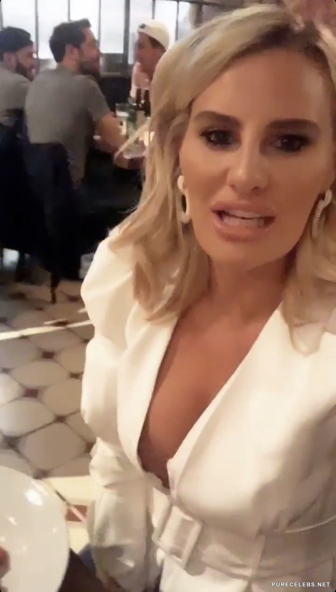 TV star Danielle Armstrong is sure to share with you her good mood when you see which video she recorded recently. The charming blonde was broadcasting from the restaurant, and the camera was focused on her white low-cut jacket. As you can see, the celebrity did not wear a bra, and therefore periodically her awesome boobs with areola nipples were visible from her jacket when the girl moved.