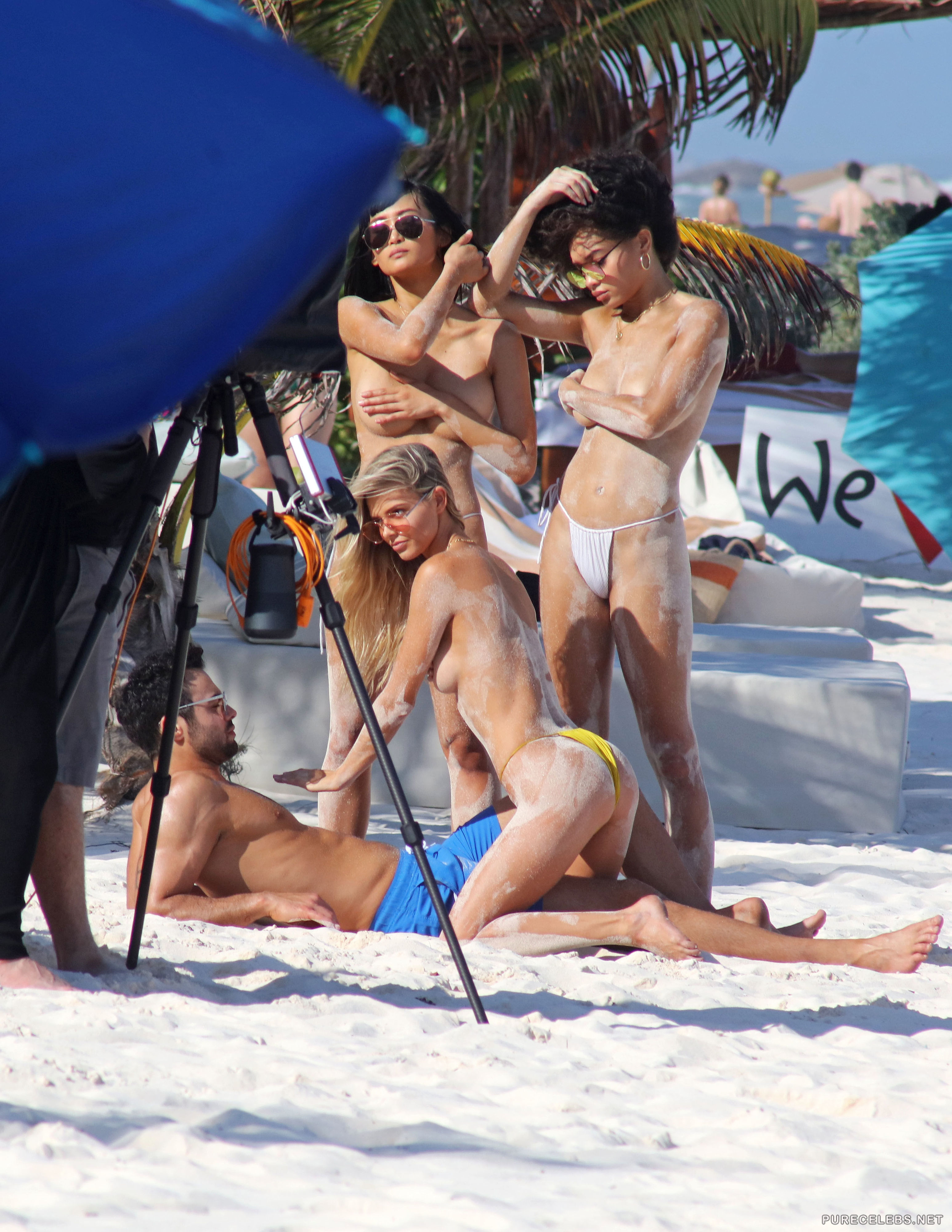 Paparazzi took photos of Danielle Knudson during a photo shoot on the beach. She is posing straddling a guy while two other girls are standing beside them touching themselves. All girls are wearing only skimpy bikini bottoms, that are barely covering their smooth shaven pussies. As things get hotter she lays down on the sand and starts touching herself, and photographers took pictures of that as well.