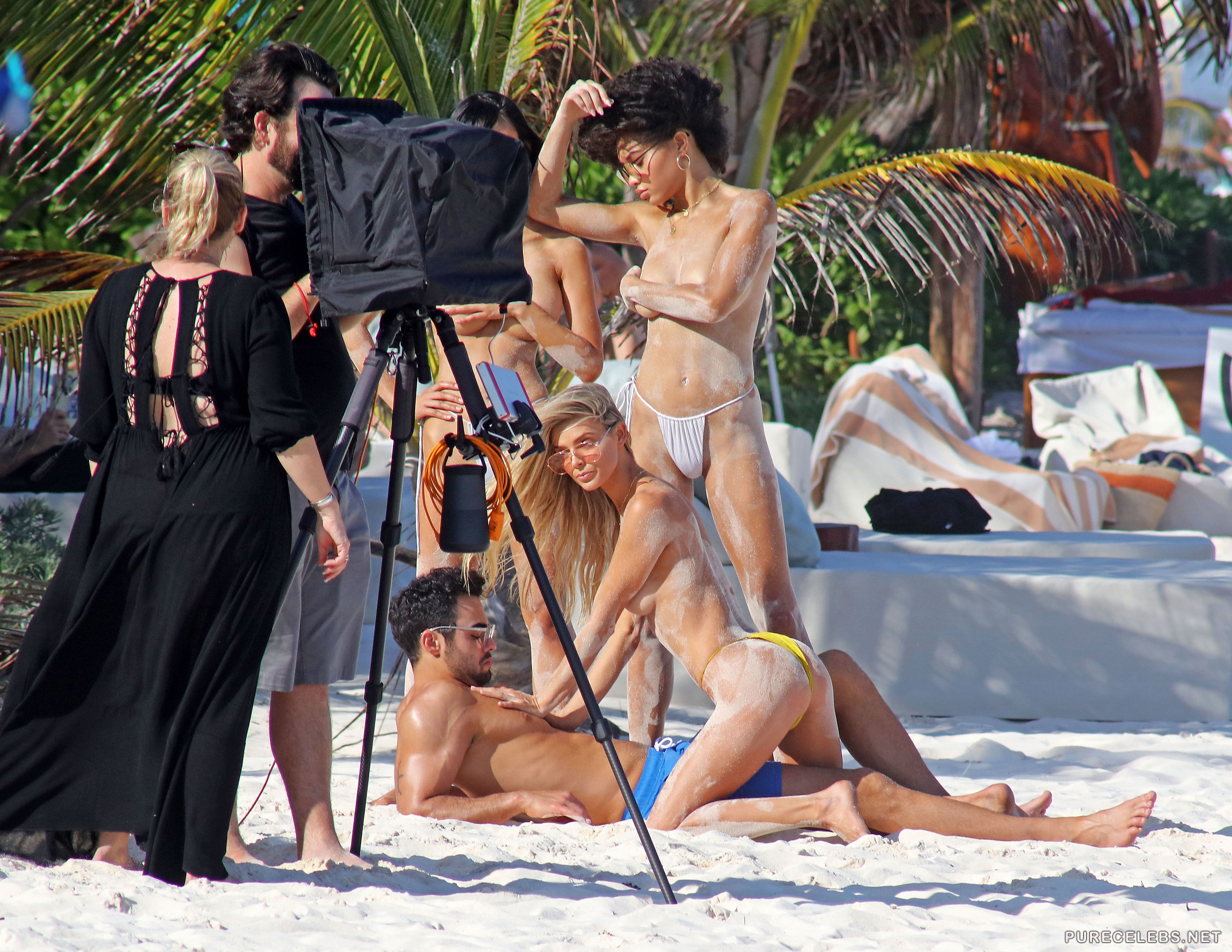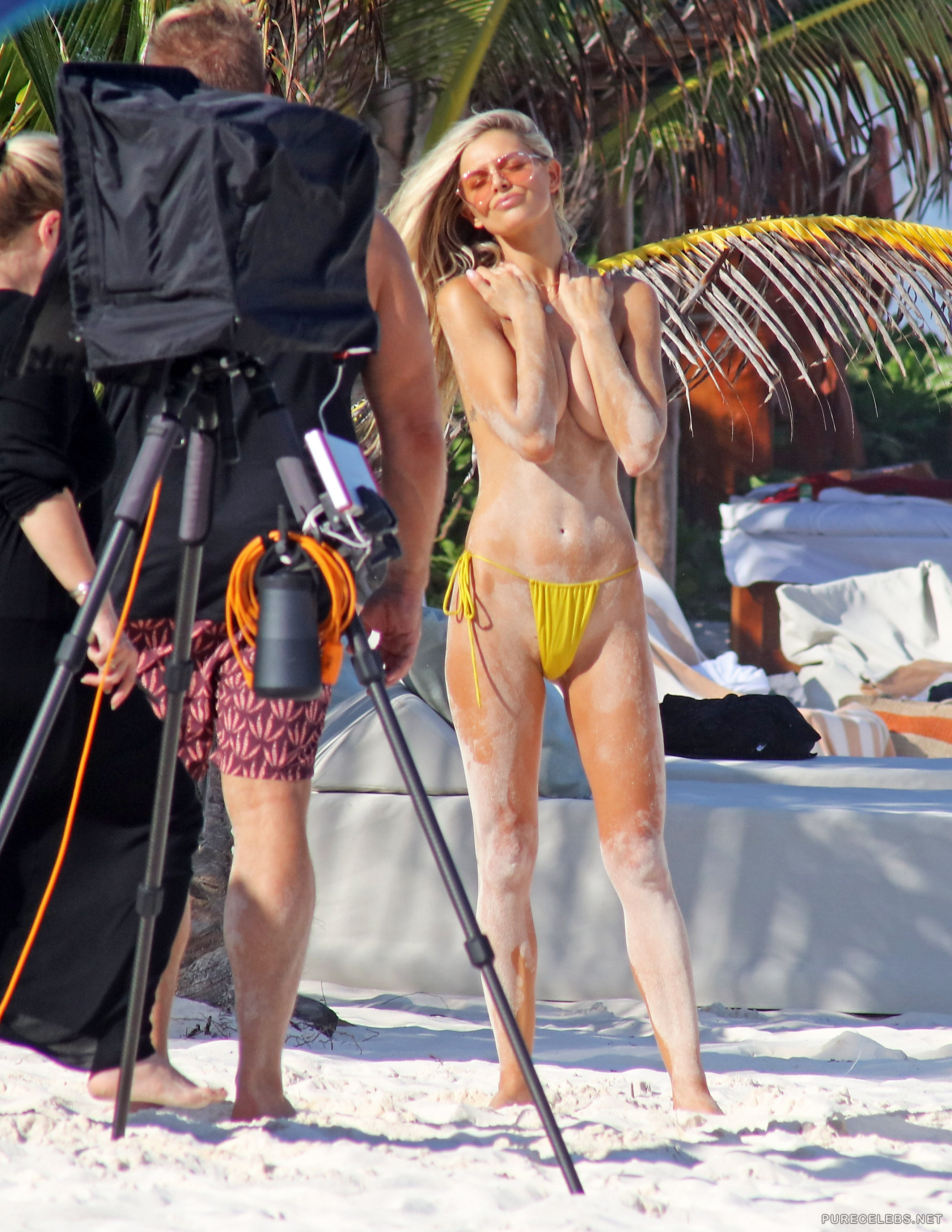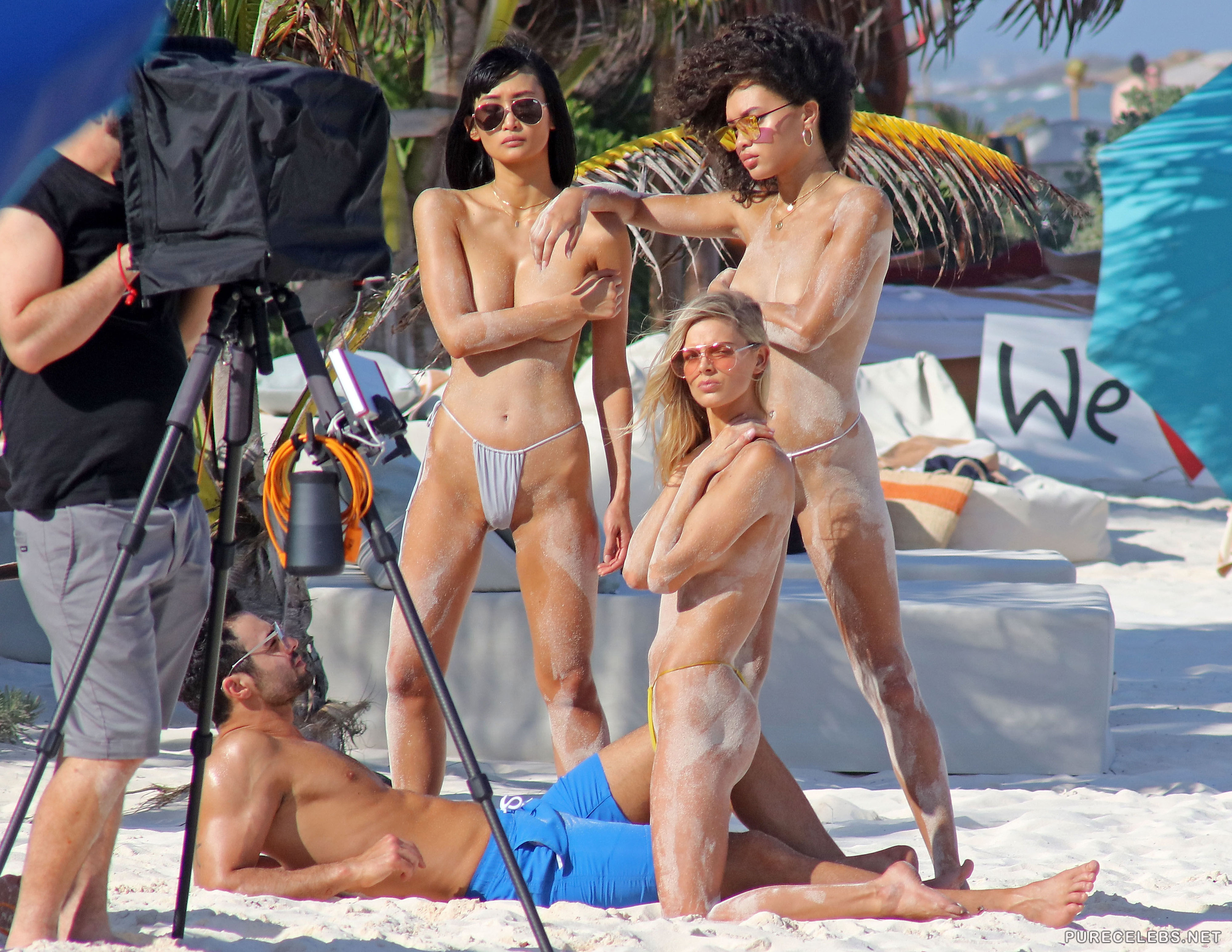 Paparazzi took photos of Danielle Knudson during a photo shoot on the beach. She is posing straddling a guy while two other girls are standing beside them touching themselves. All girls are wearing only skimpy bikini bottoms, that are barely covering their smooth shaven pussies. As things get hotter she lays down on the sand and starts touching herself, and photographers took pictures of that as well.