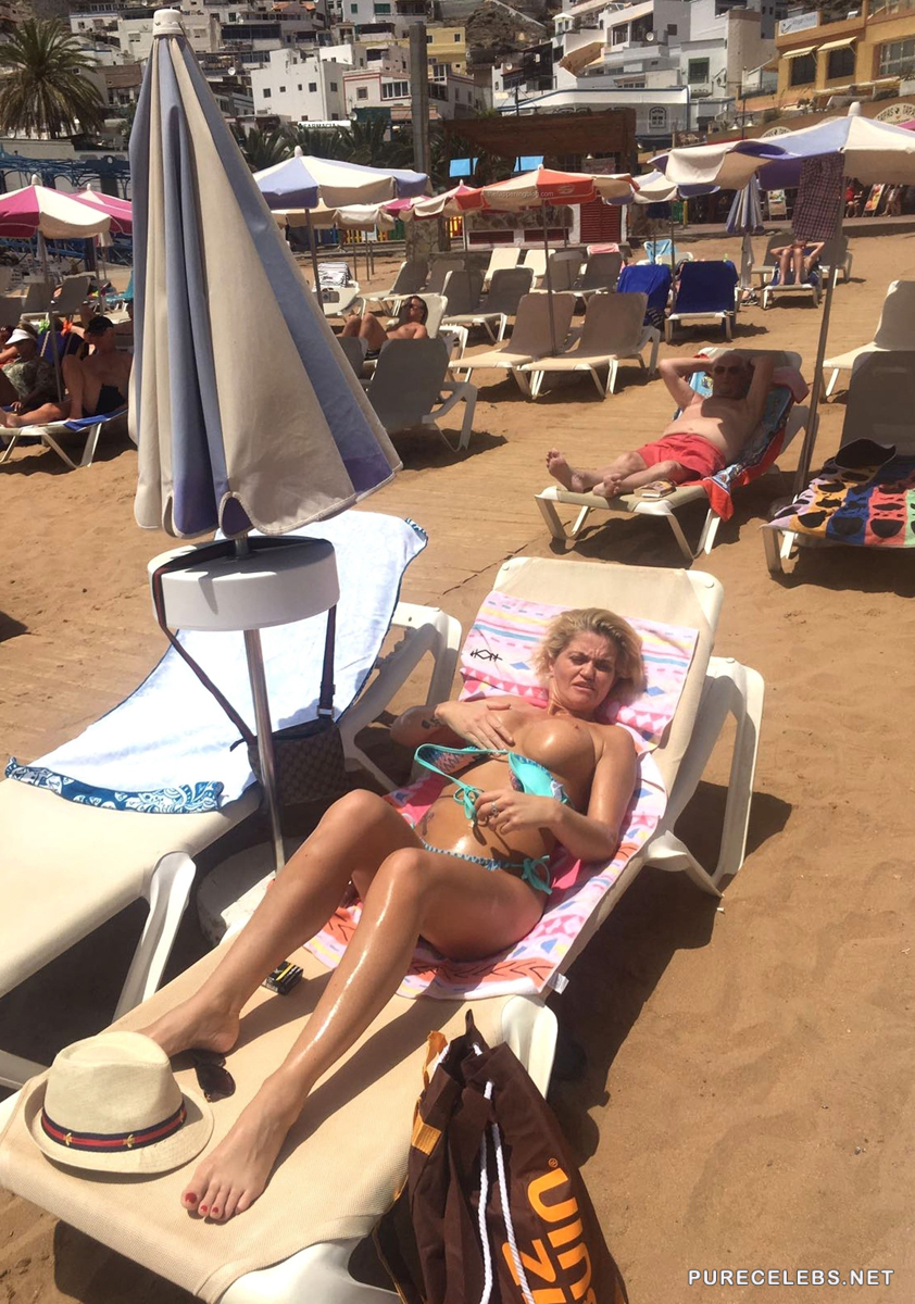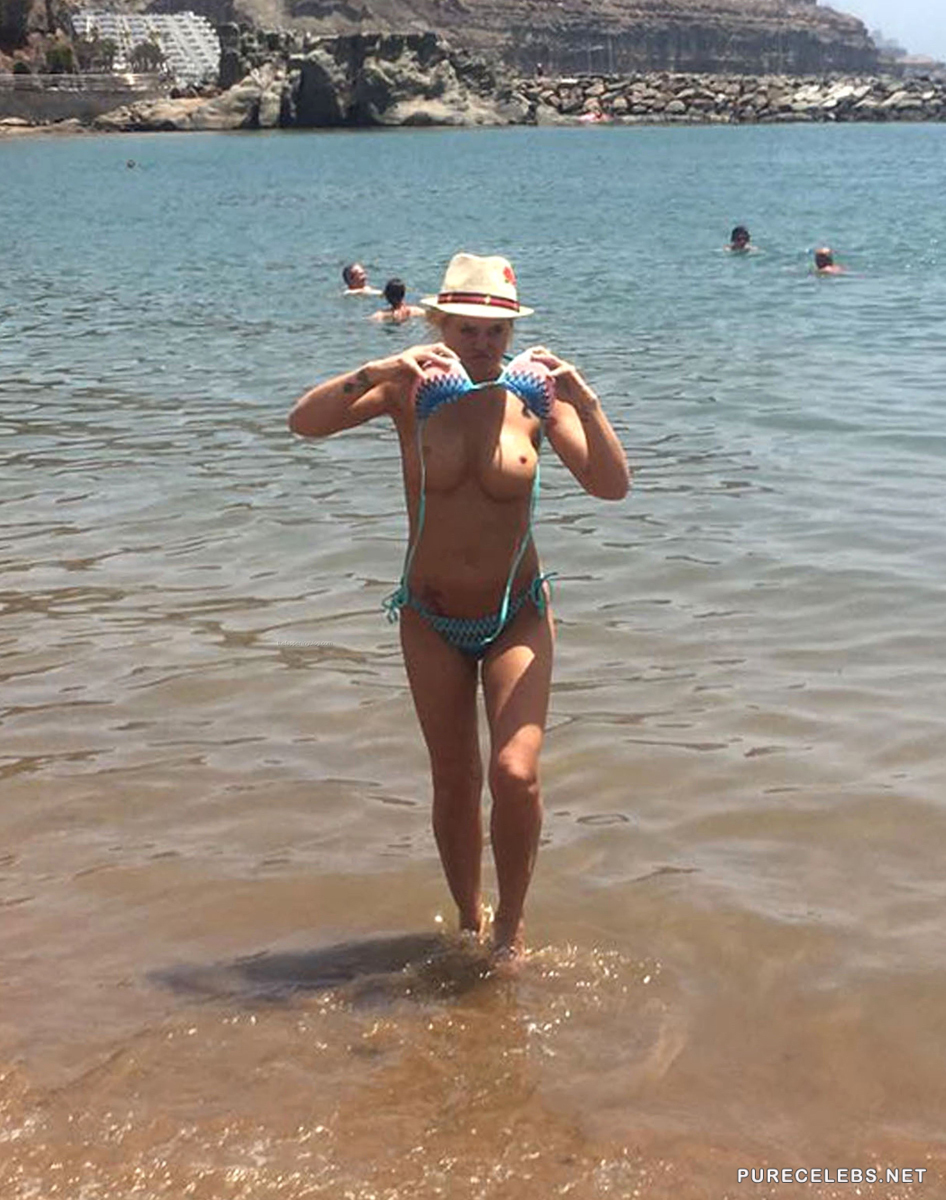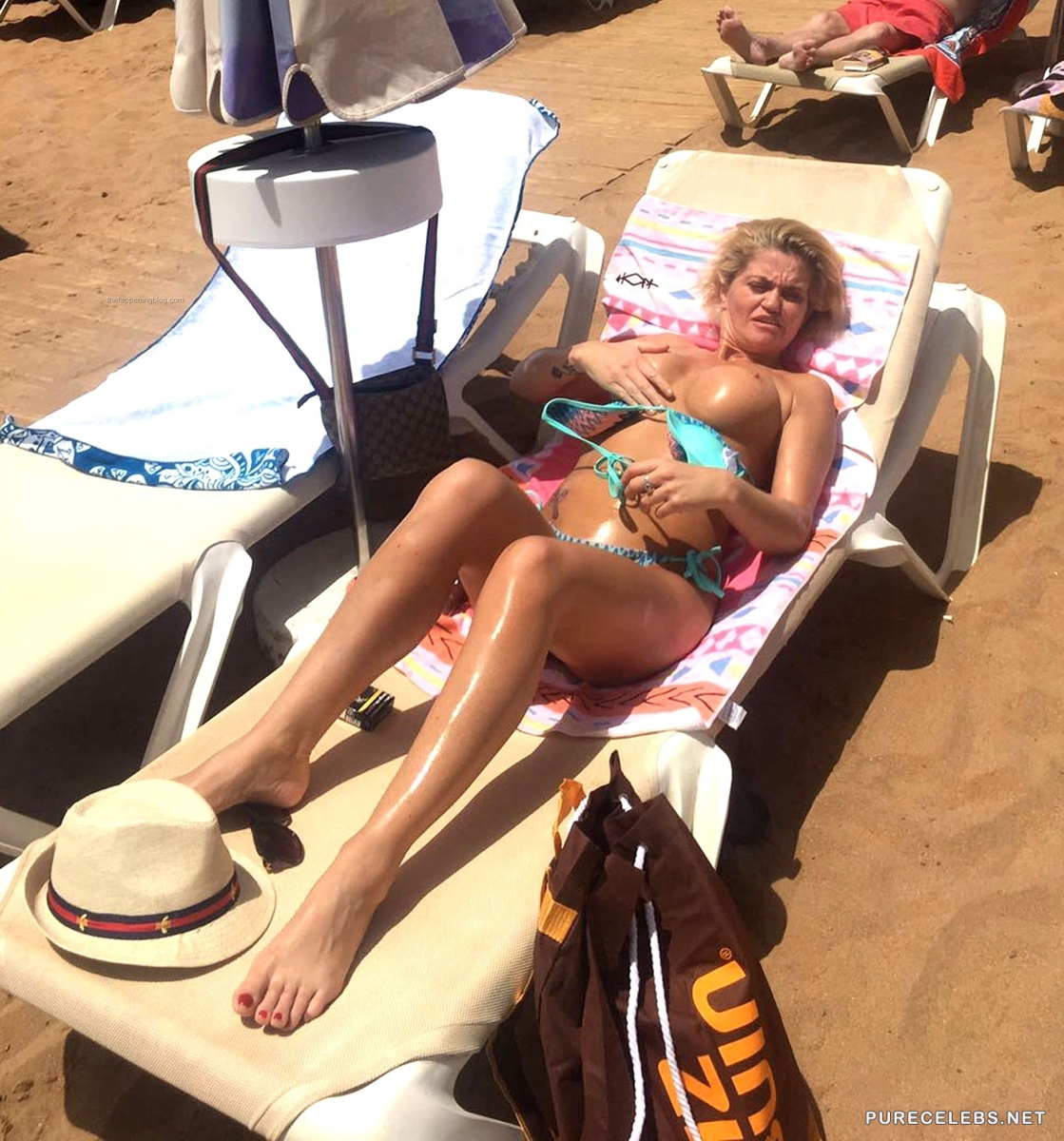 Danniella Westbrook is at it again, and we are glad that she is. This big busted MILF has been known for showing her goods in public. She posed for the camera on some tropical island wearing bikini, but she quickly removed the top and exposed her tits to the sun and everyone’s gaze. Then she lied down on stretcher and with great pleasure proceeded to apply sun-protection oil on her boobs.