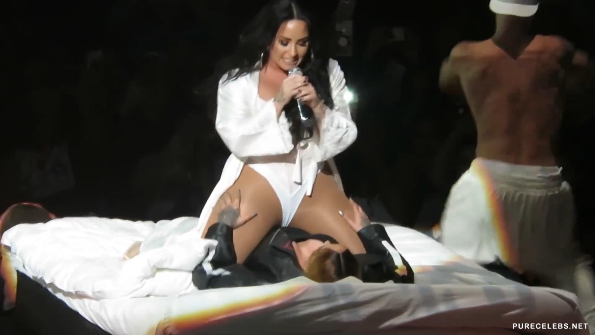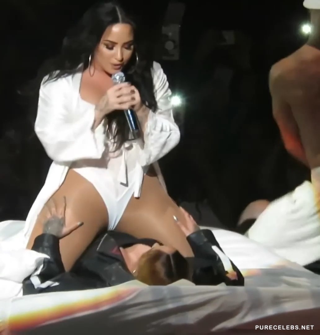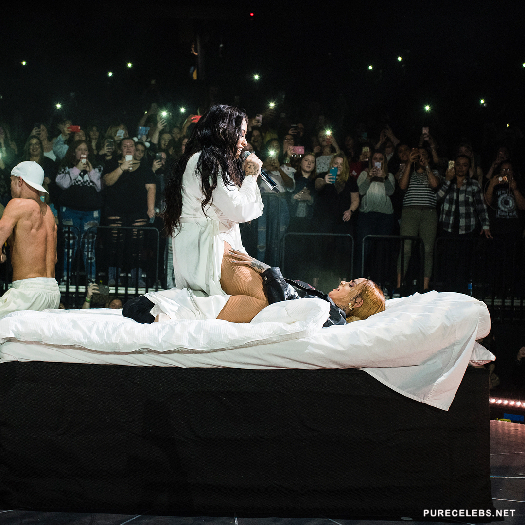 Show in Prudential Center where Demi Lovato & Kehlani Tsunami have performed was everything but prude. During their performance they simulated lesbian sex, as Kehlani was laying on the bed set on stage, Demi straddled and started rubbing her vagina on her. Kehlani returned the favor by rubbing Demi’s legs at which point singer got really horny an almost put her wet pussy on other performers face, but remembered they are on concert, and left that part for later.