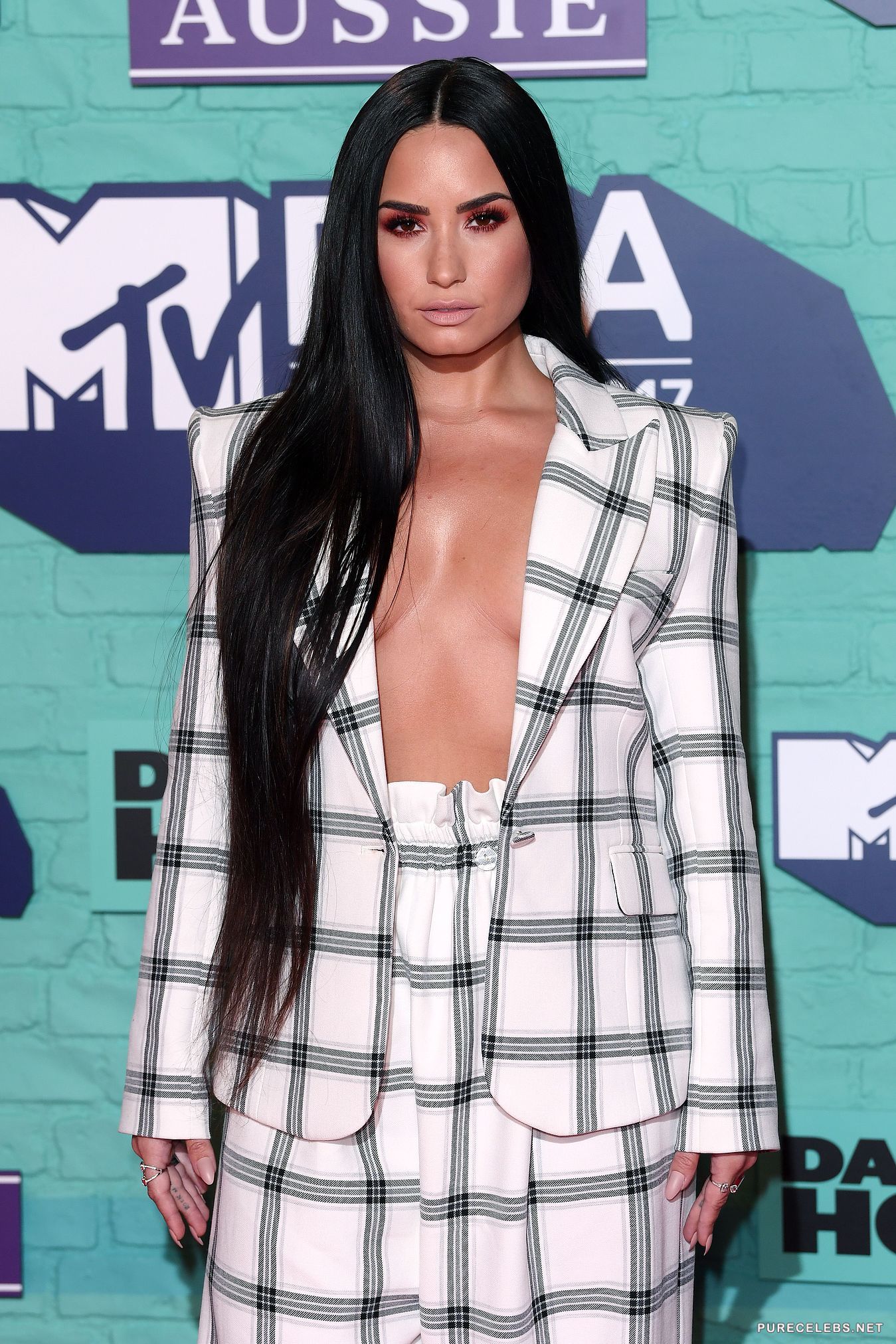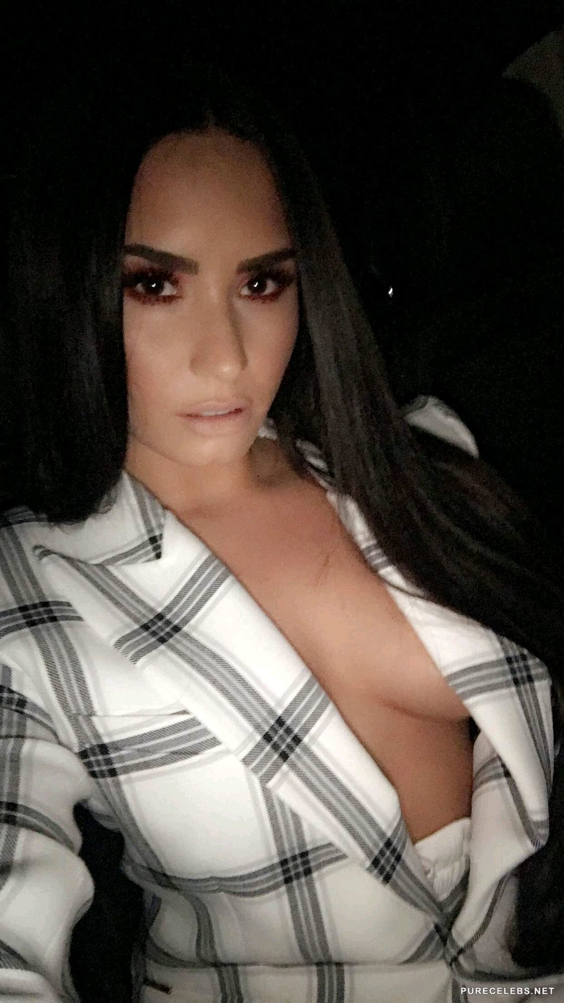 We all love seeing Demi Lovato, especially when she is showing her awesome cleavage. The young singer recently attended the MTV awards ceremony wearing a sexy suit with a low cut blazer which accentuated her plump natural breasts. She snapped some photos of herself before the show to show off her amazing sideboob. Judging from her recent photos in a silk shirt, the sexy brunette has a habit of being braless.
