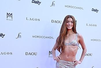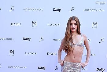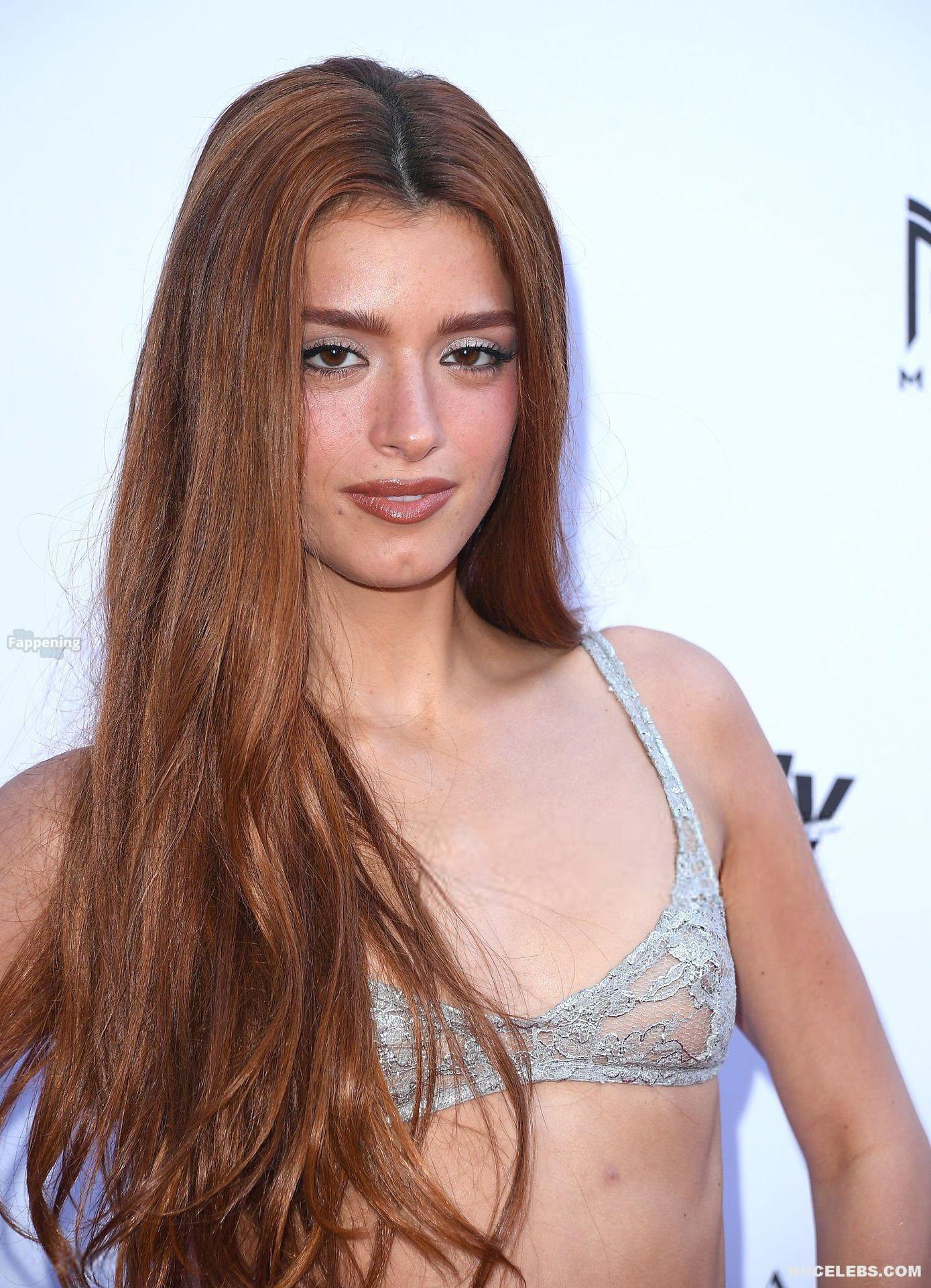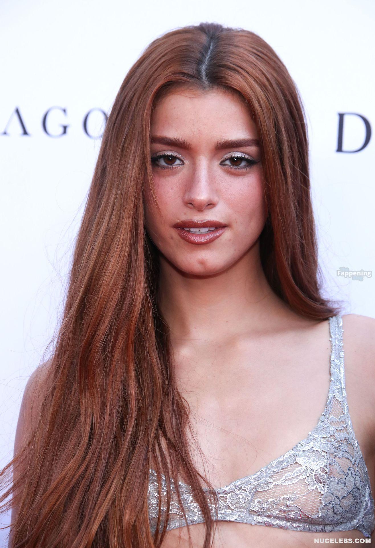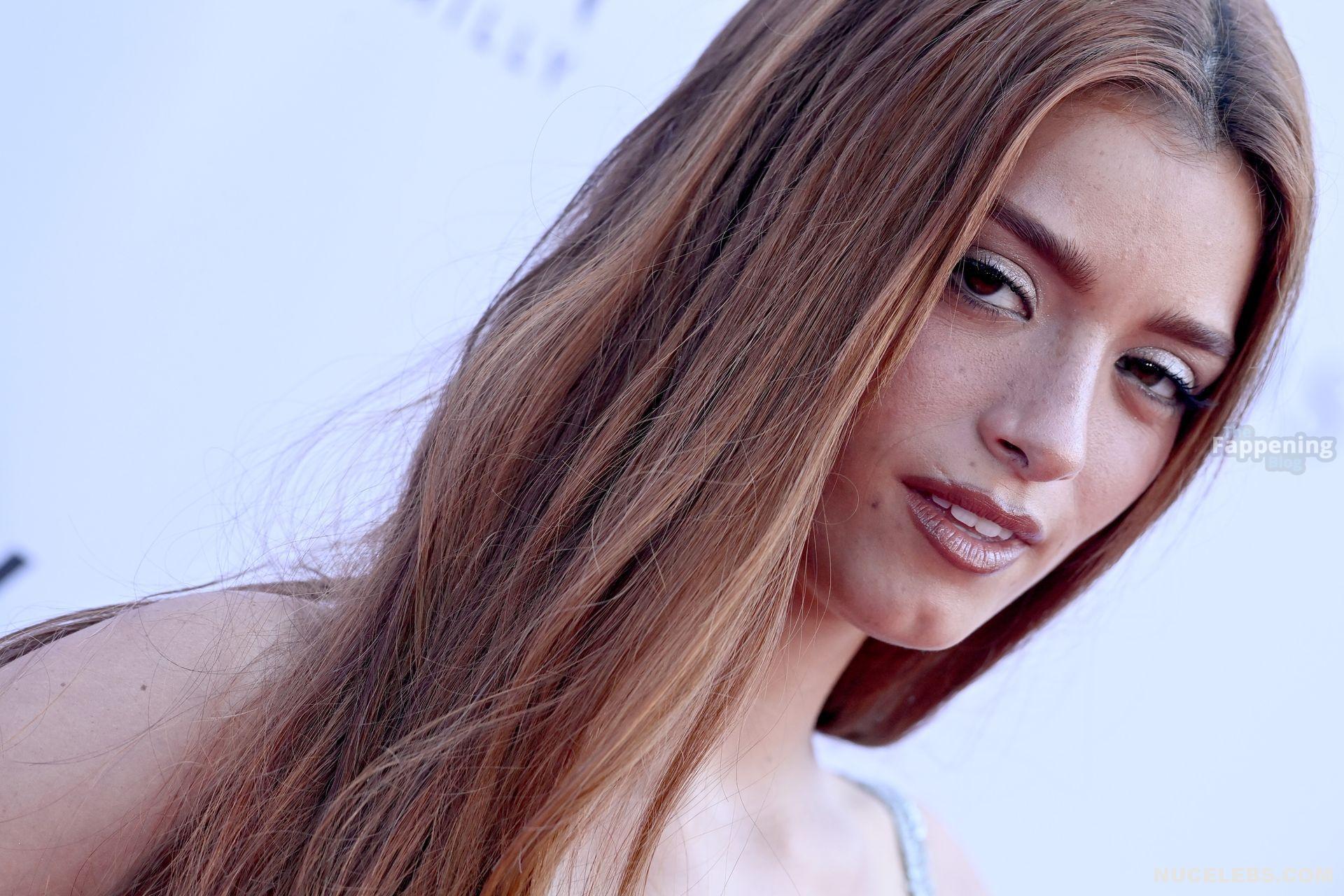 Dixie D’Amelio showed off her nude boobs on the red carpet! The aspiring singer certainly wanted to be the center of attention and put in some effort. For example, the outfit she chose was damn revealing. Let’s check out her long gray transparent skirt and move on to the top of the outfit. As you can see, Dixie D’Amelio nude titties were not hidden at all under the narrow, thin strip of fabric, which was also transparent!