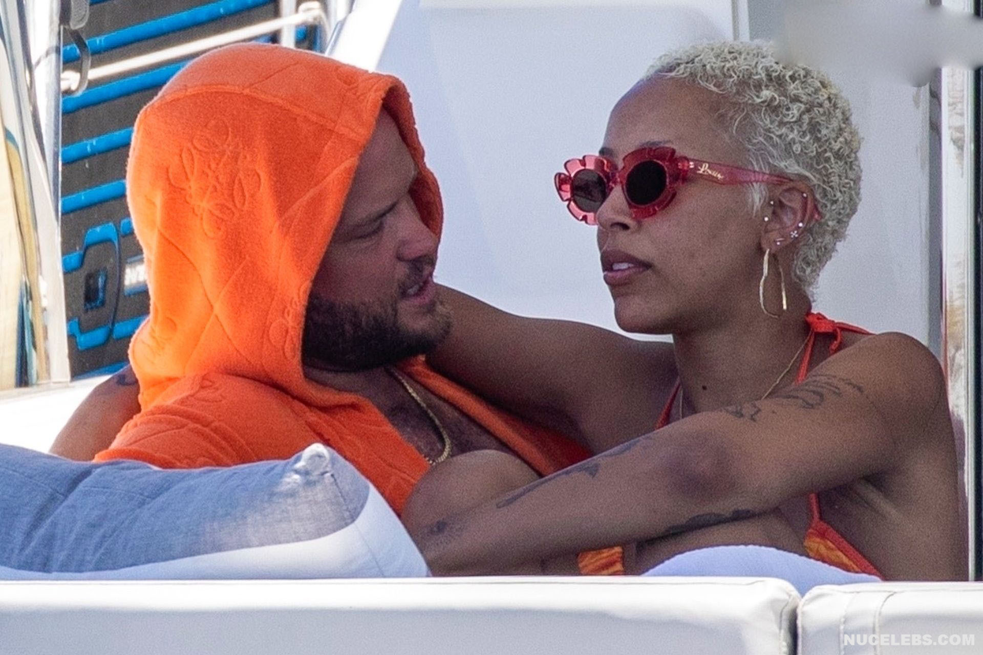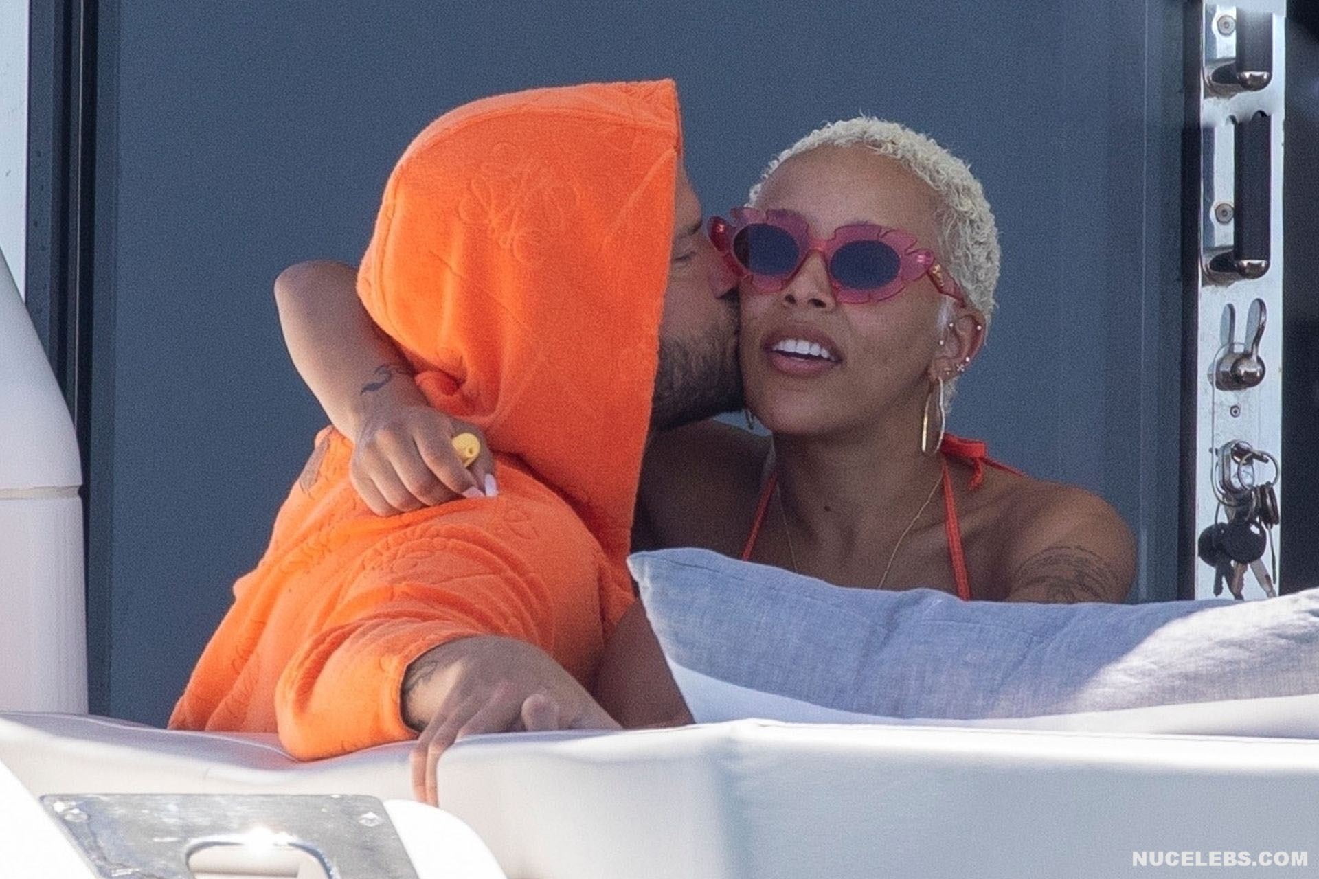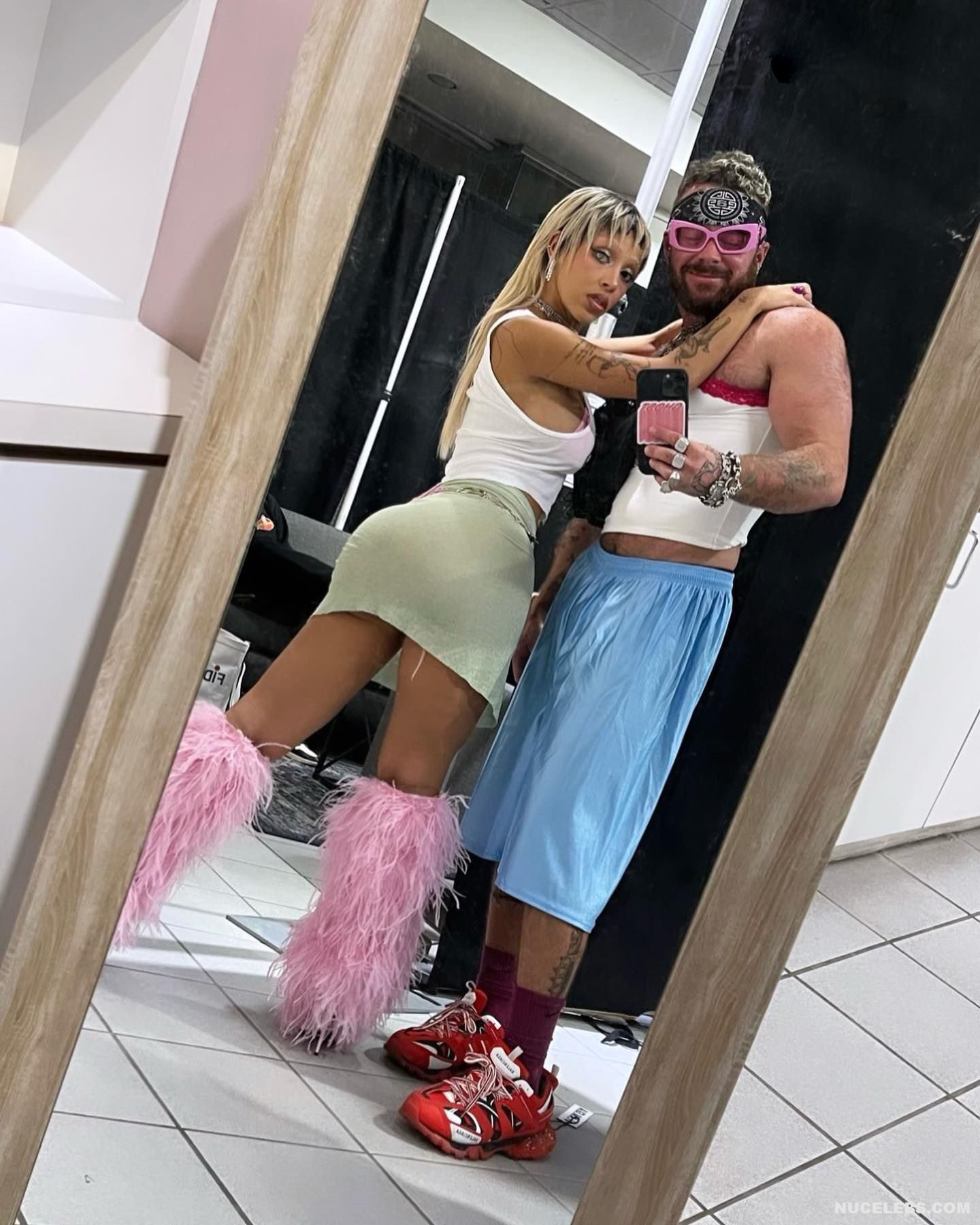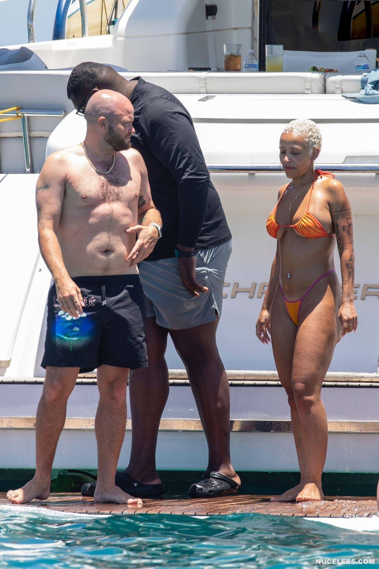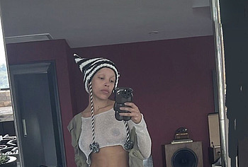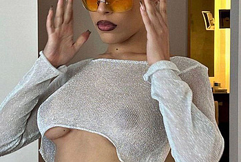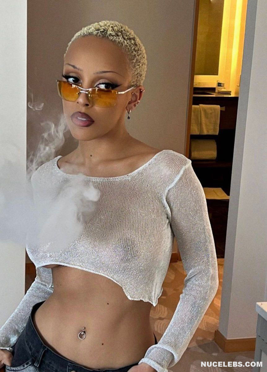 In the real world, Doja Cat effortlessly turns heads with her glamorous style and the way she carries herself, embodying the essence of seduction and allure. Check out this rapper’s upskirt pic, which shows her pink panties peeking out from under her short beige dress as she bends over. You can also admire Doja Cat’s nude tits with large nipples, which were visible through the white transparent top.