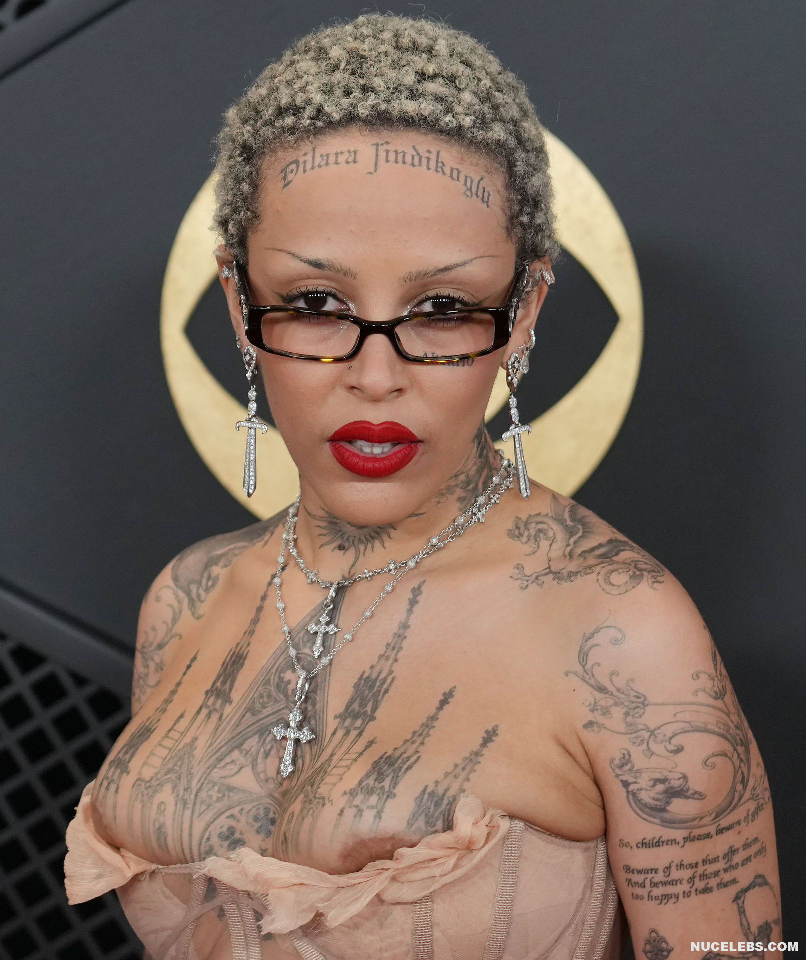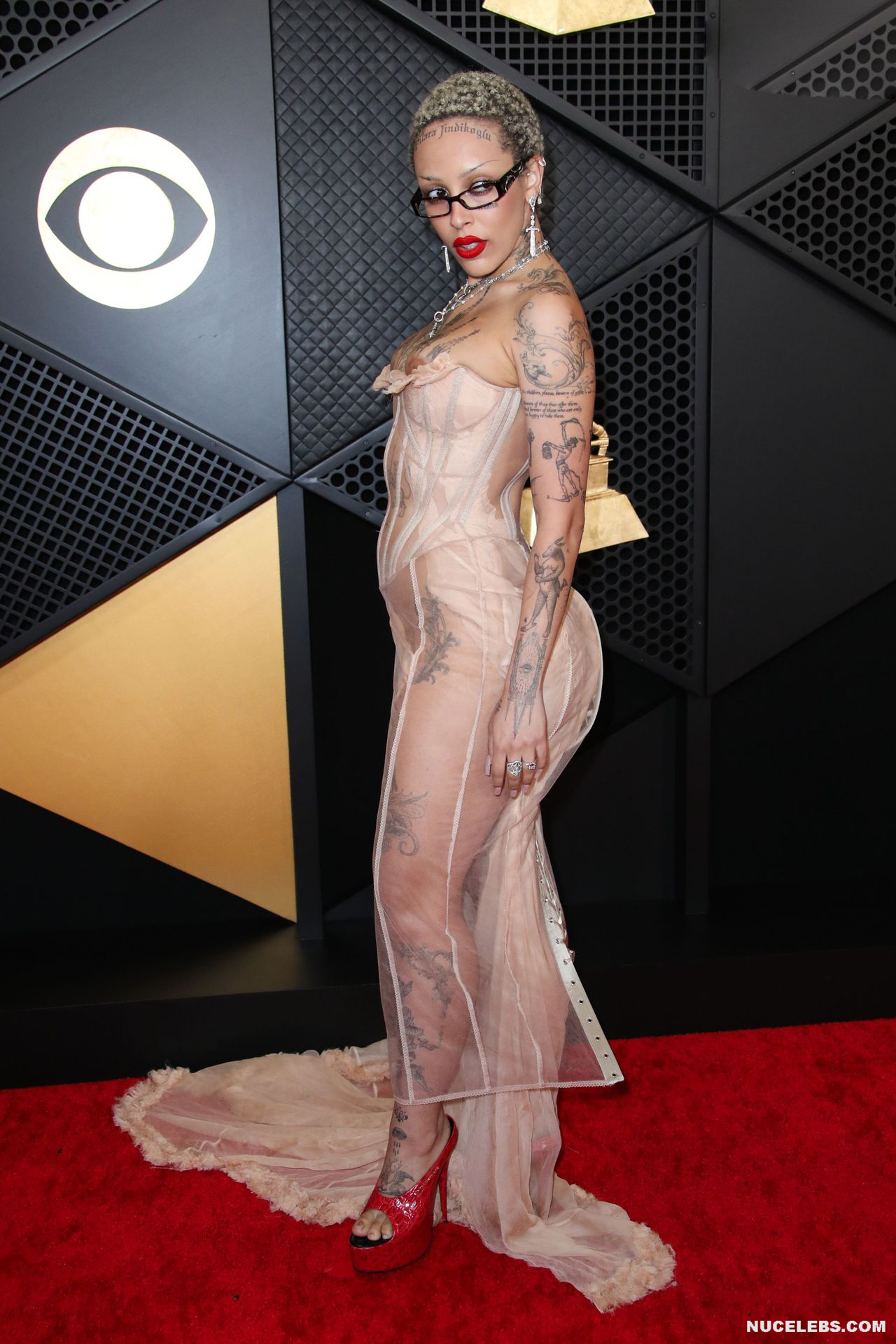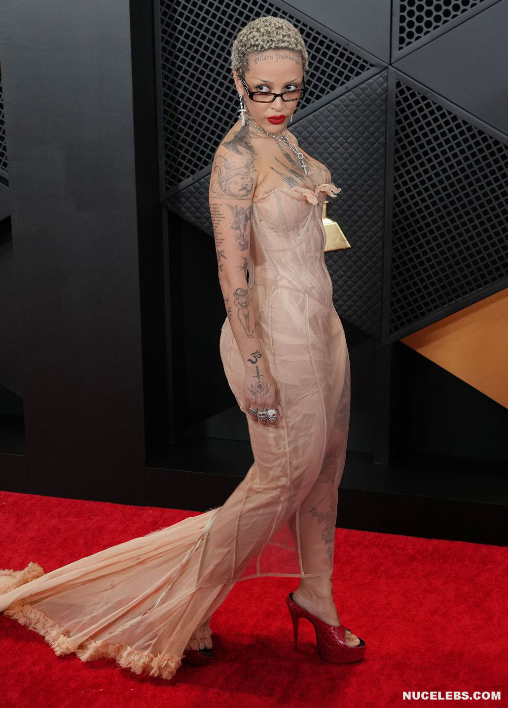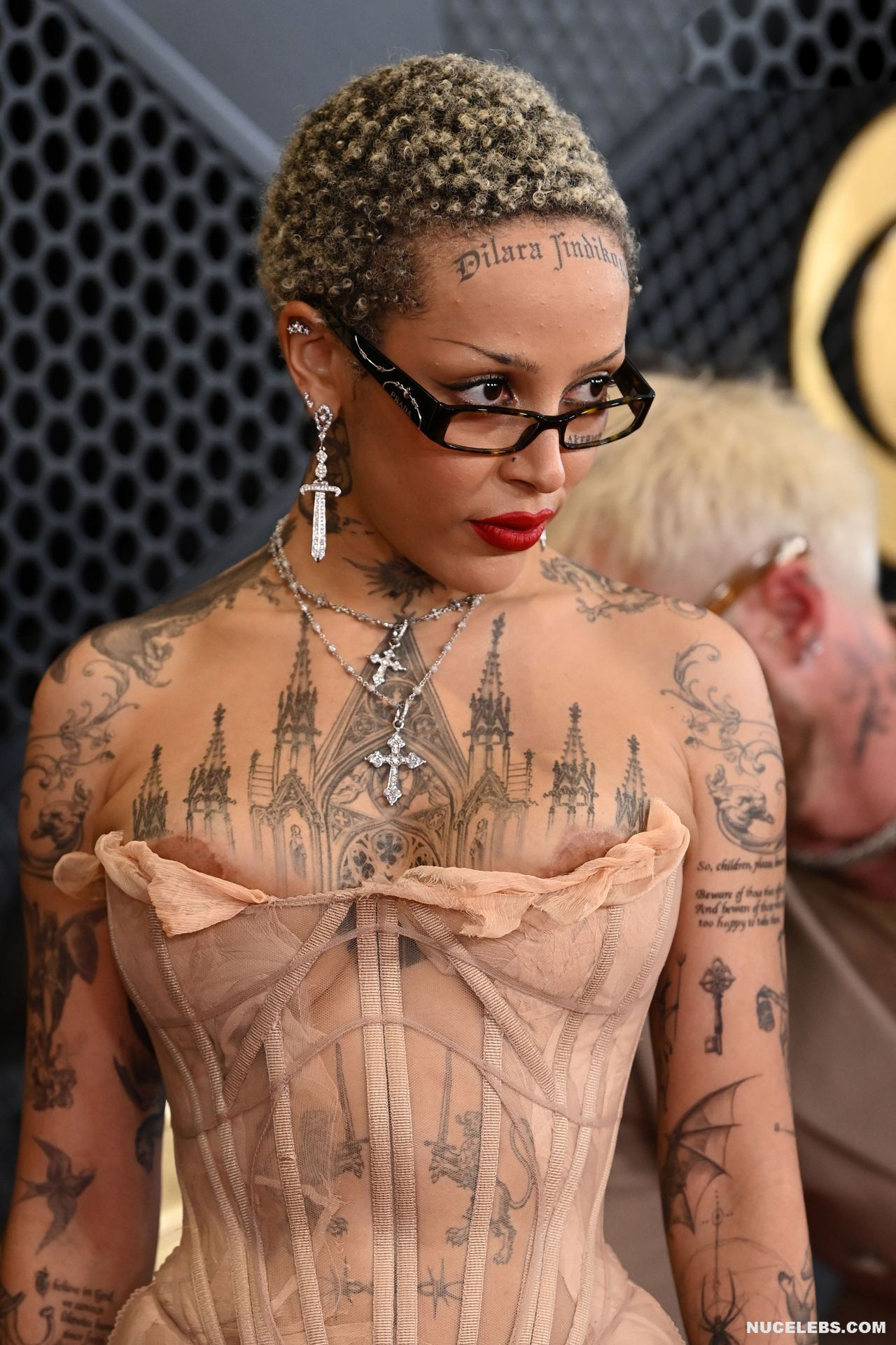 Doja Cat decided once again not to hide her naked body from the public. The 28-year-old celebrity posed for the cameras at the event in a tight, see-through dress. At the same time, one could admire not only the tattooed body of this singer, but also Doja Cat’s nude tits. After all, her large brown nipples jumped out of the low neckline of her dress, but this did not seem to bother her at all. As you can see, she took various poses in front of the camera and did not even try to cover her breasts even a little.