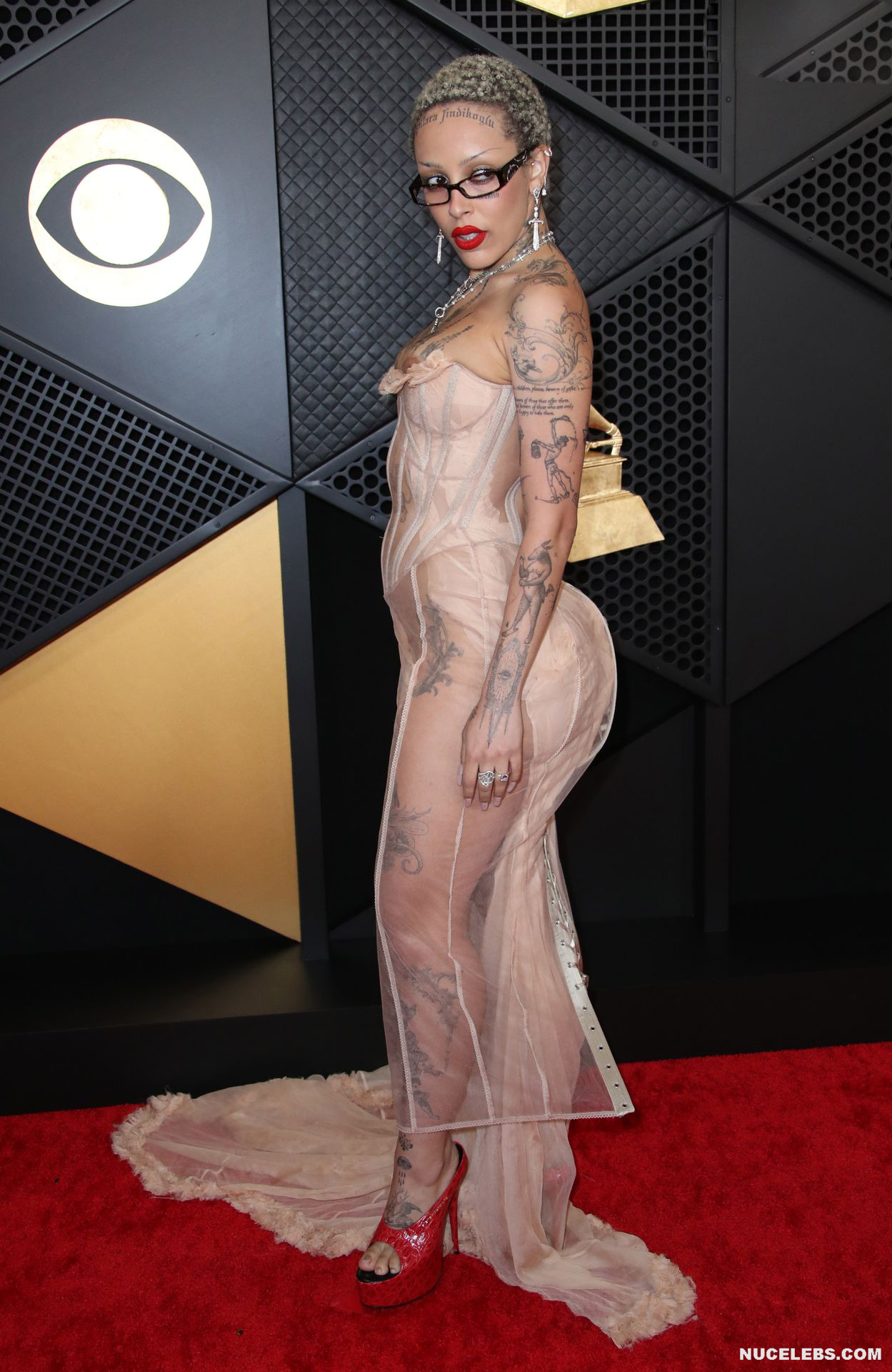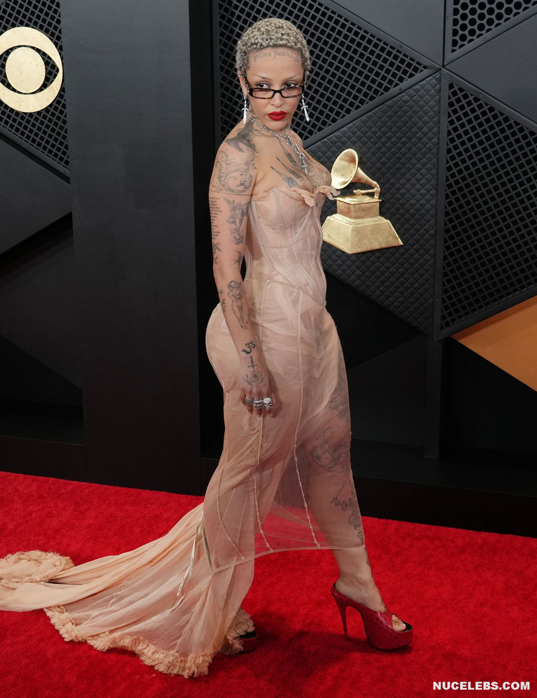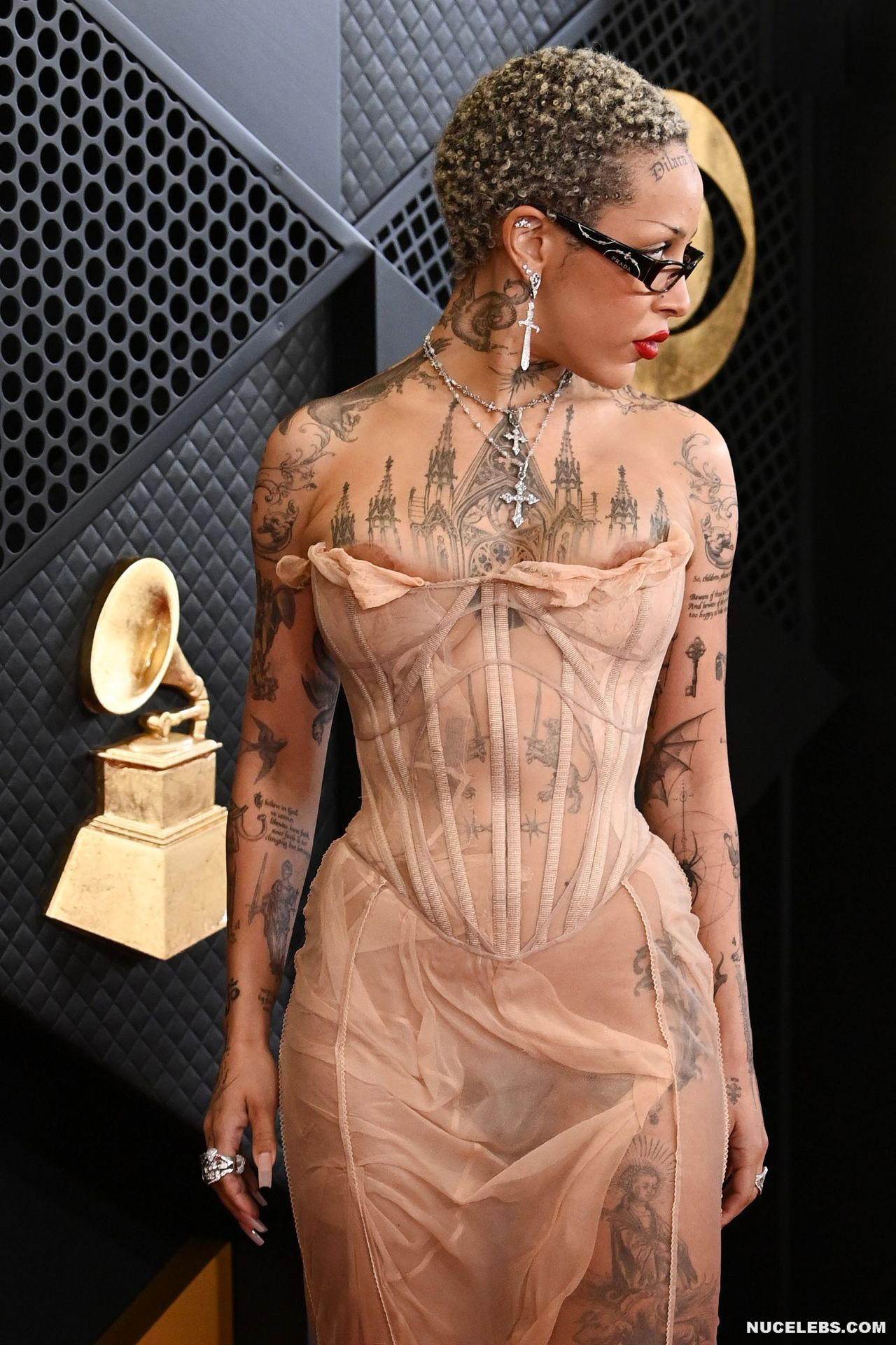 Doja Cat decided once again not to hide her naked body from the public. The 28-year-old celebrity posed for the cameras at the event in a tight, see-through dress. At the same time, one could admire not only the tattooed body of this singer, but also Doja Cat’s nude tits. After all, her large brown nipples jumped out of the low neckline of her dress, but this did not seem to bother her at all. As you can see, she took various poses in front of the camera and did not even try to cover her breasts even a little.