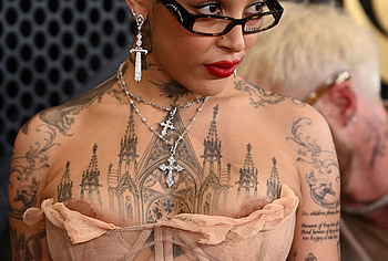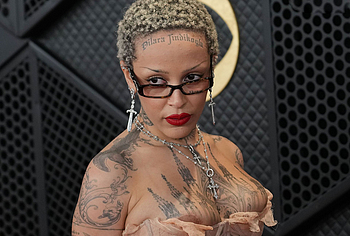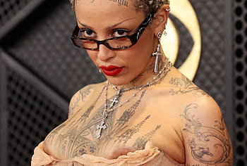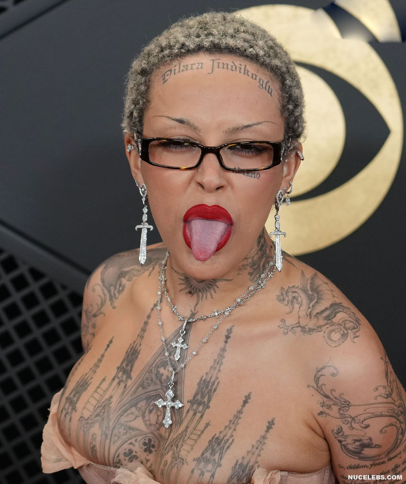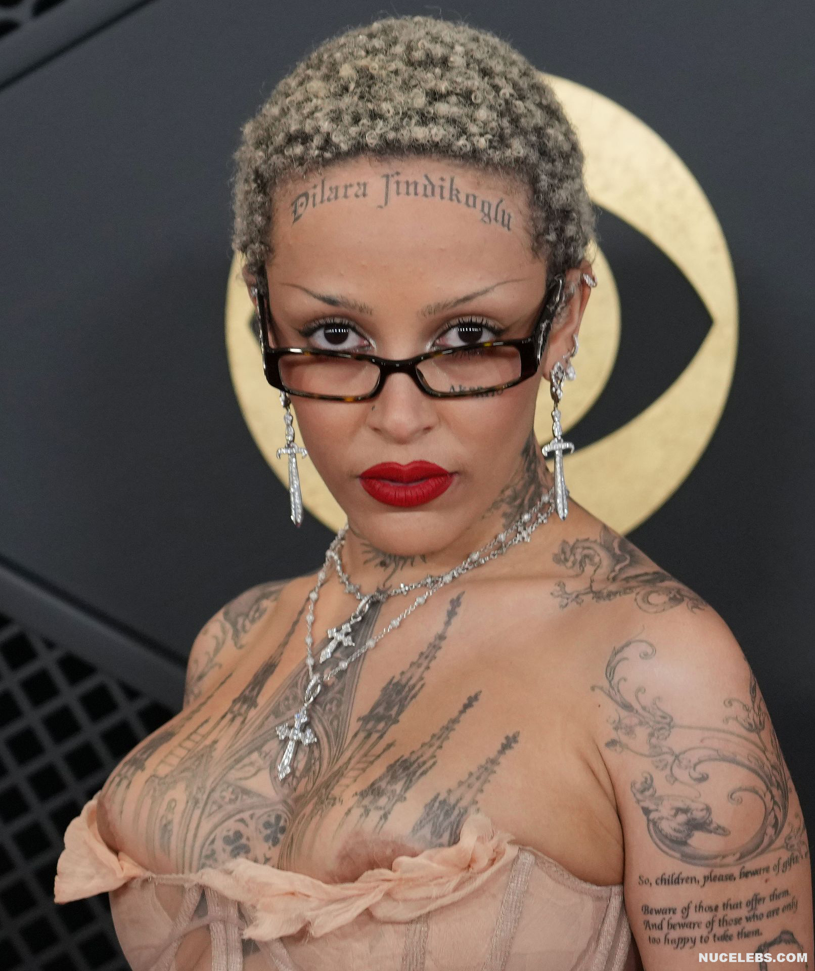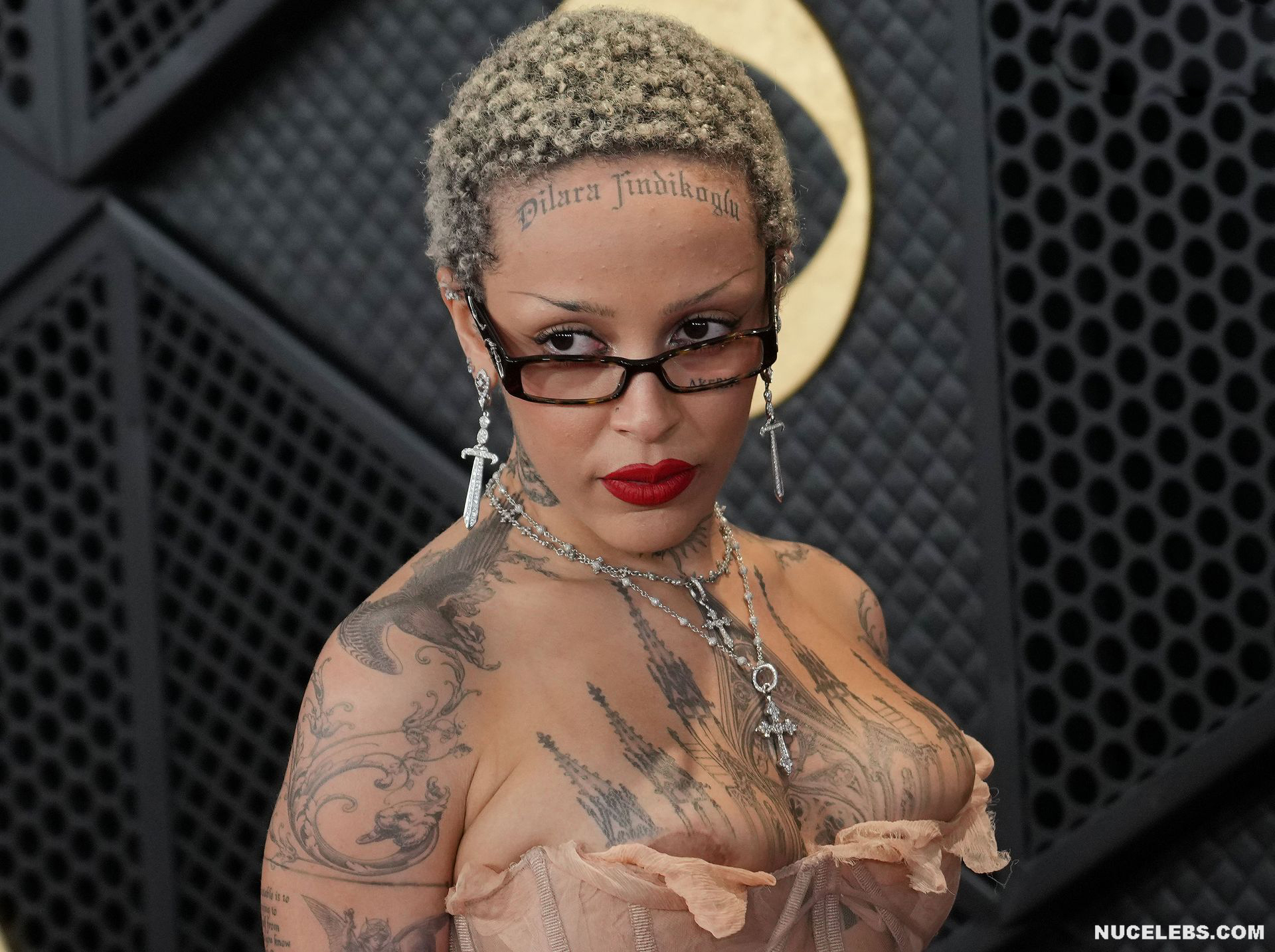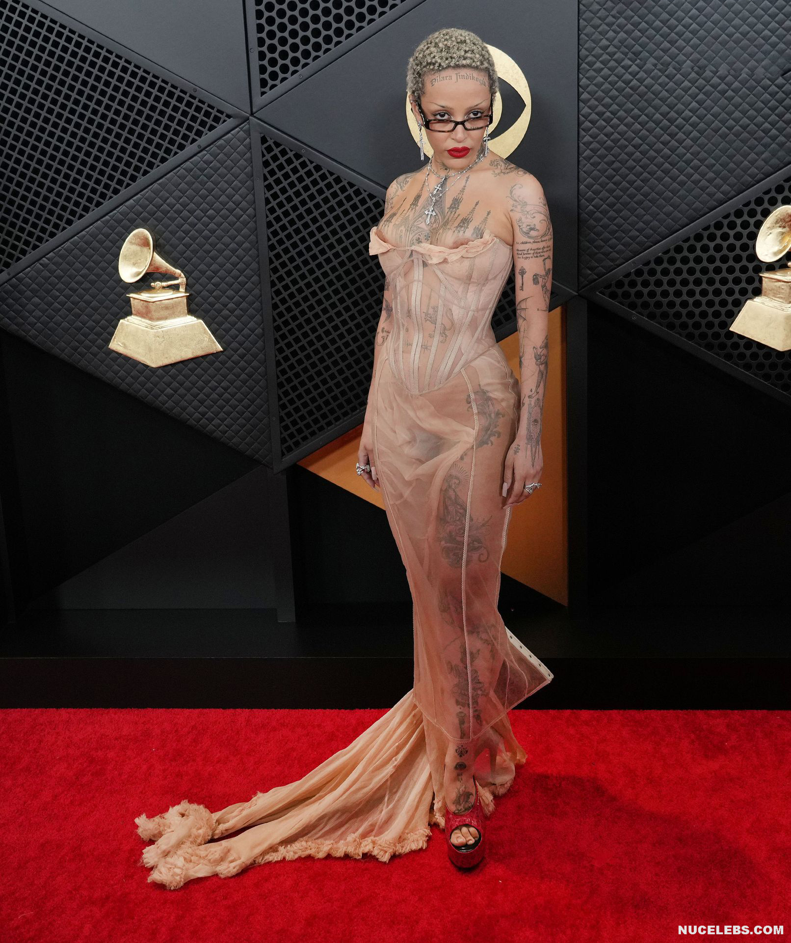 Doja Cat decided once again not to hide her naked body from the public. The 28-year-old celebrity posed for the cameras at the event in a tight, see-through dress. At the same time, one could admire not only the tattooed body of this singer, but also Doja Cat’s nude tits. After all, her large brown nipples jumped out of the low neckline of her dress, but this did not seem to bother her at all. As you can see, she took various poses in front of the camera and did not even try to cover her breasts even a little.