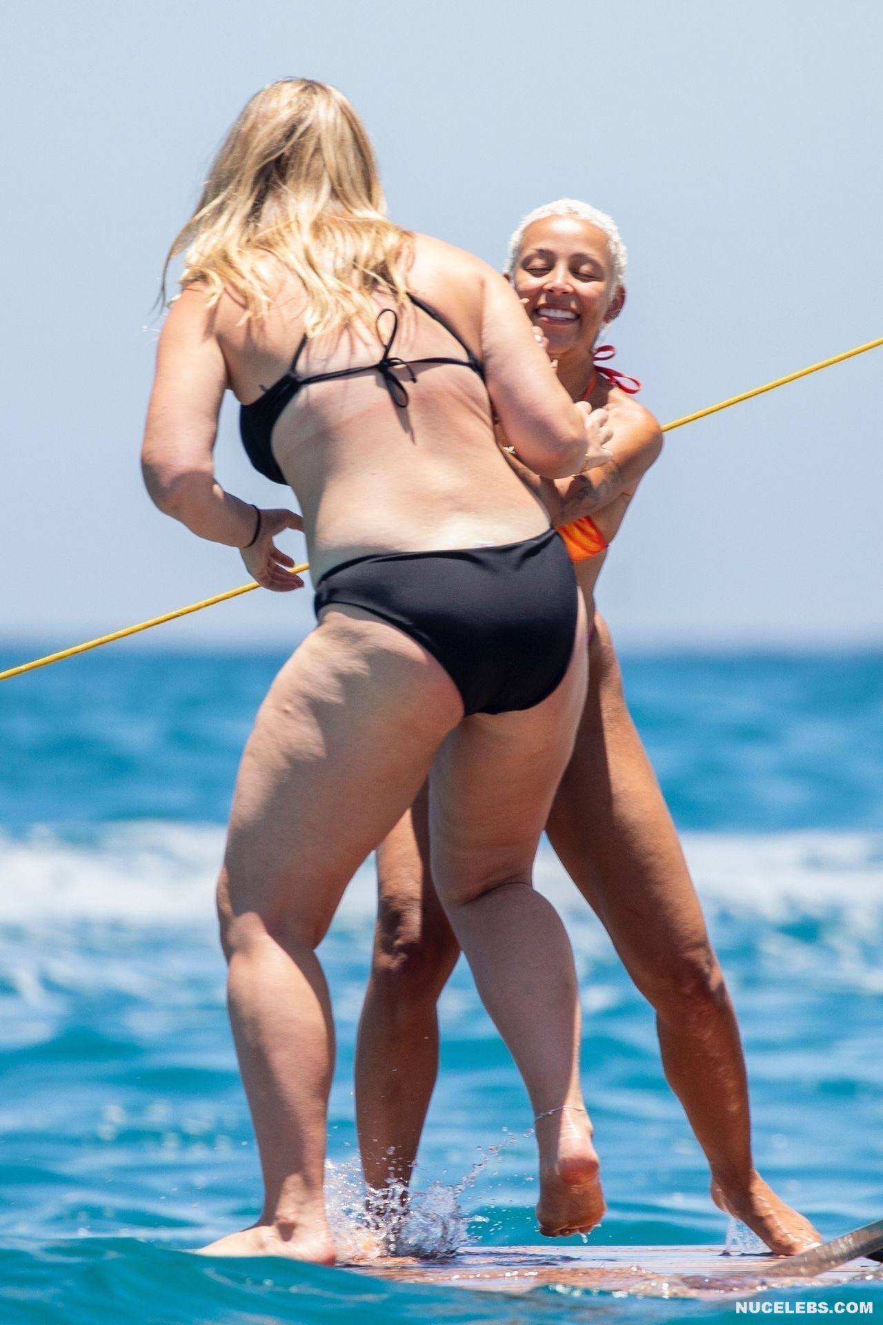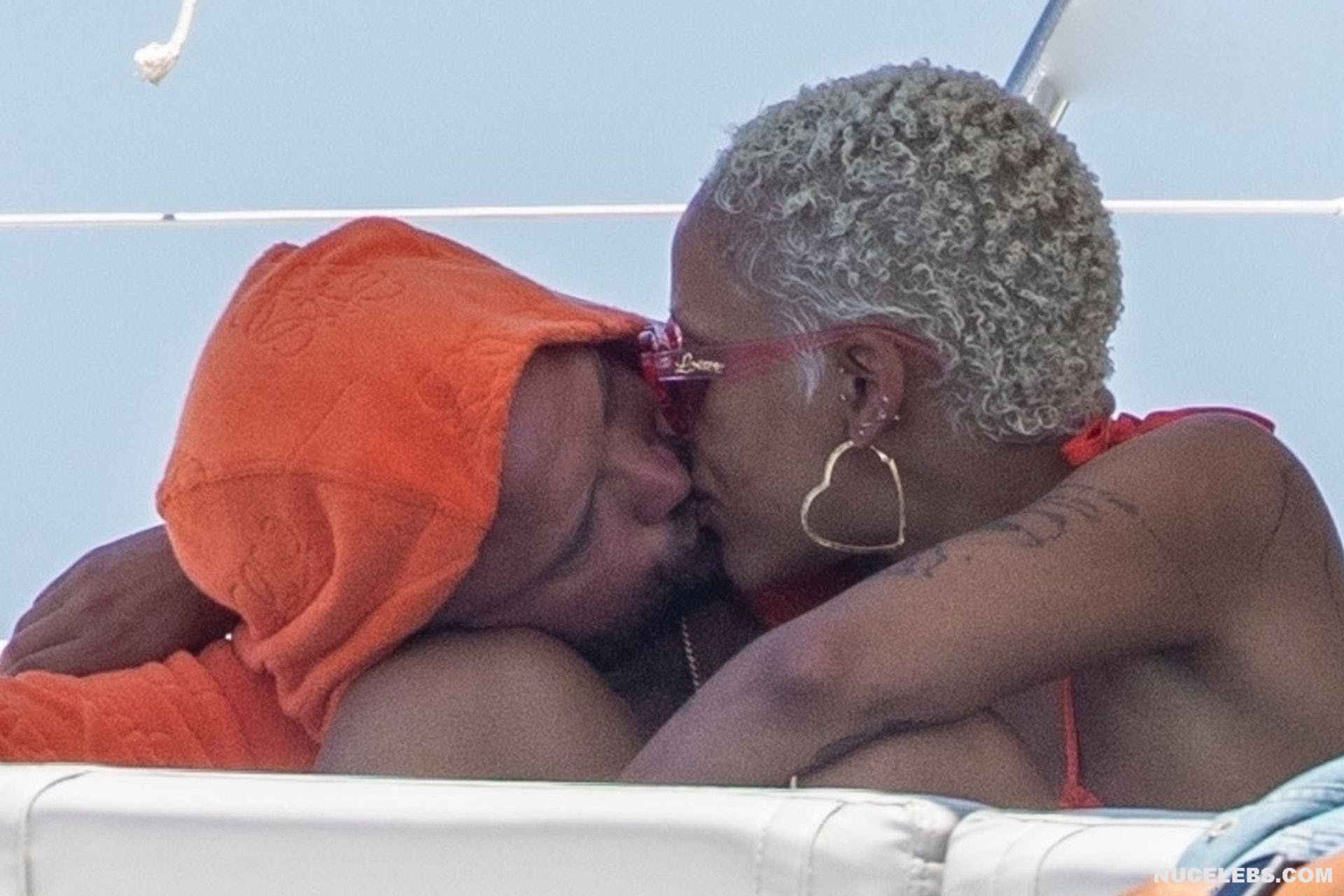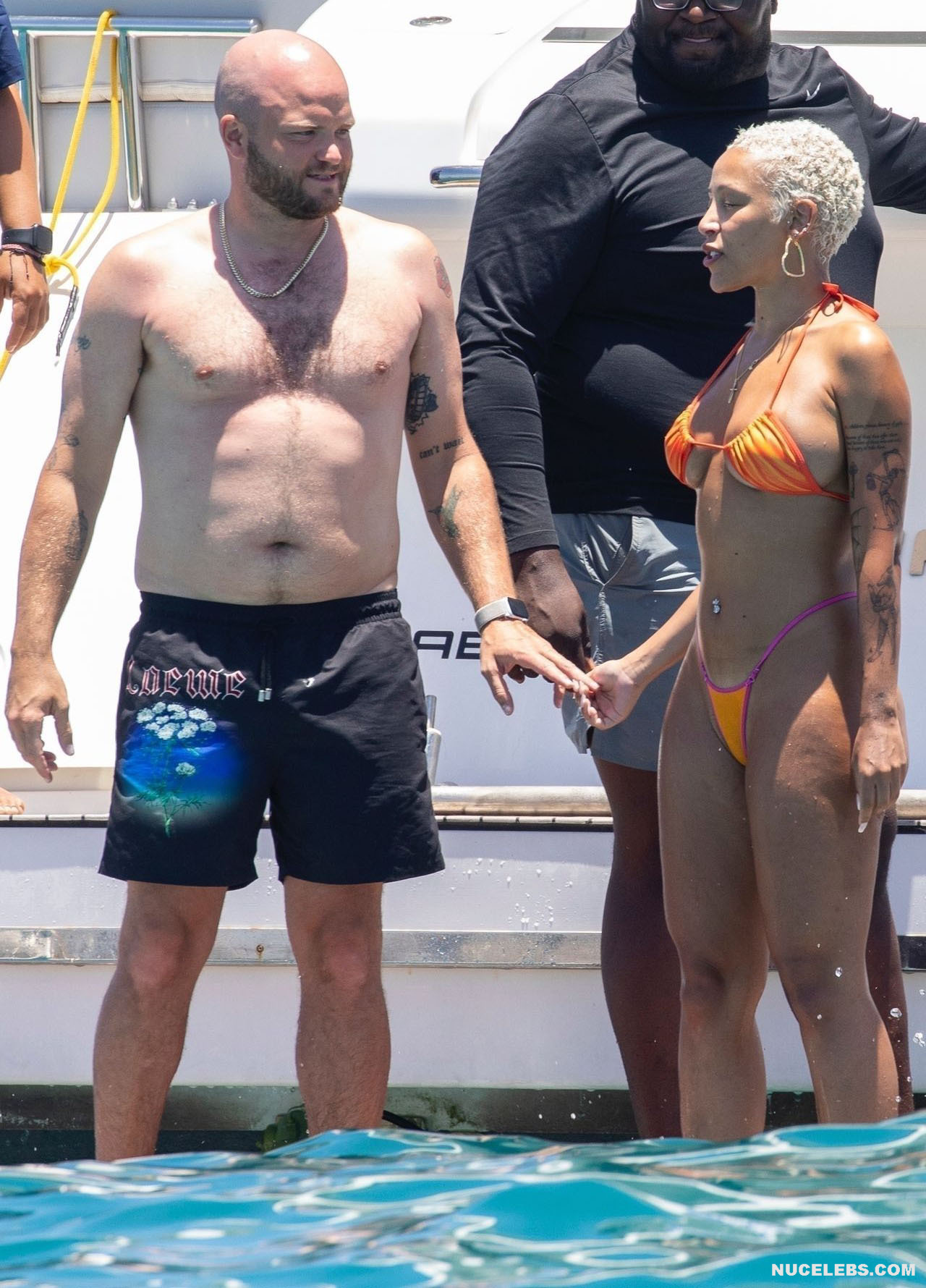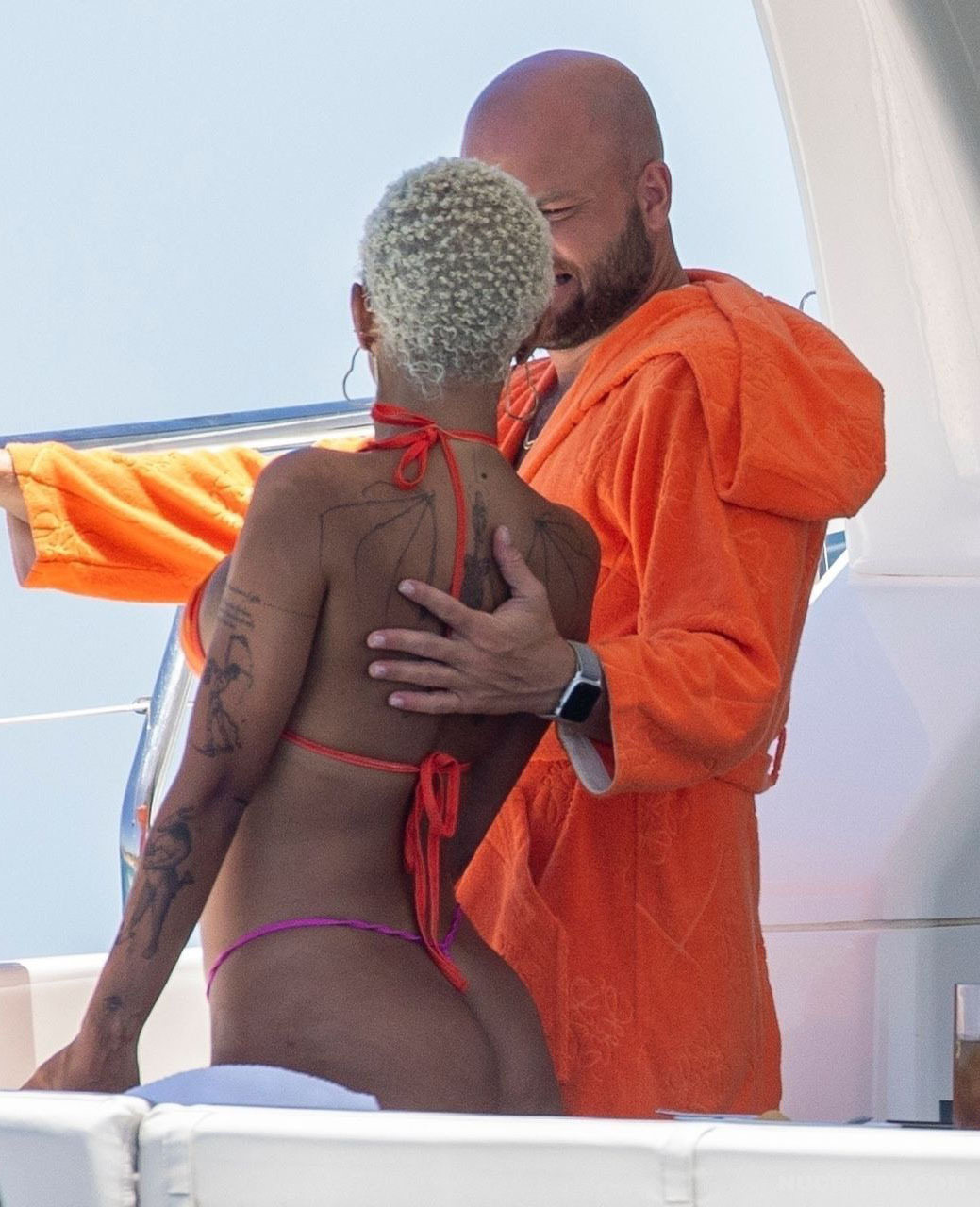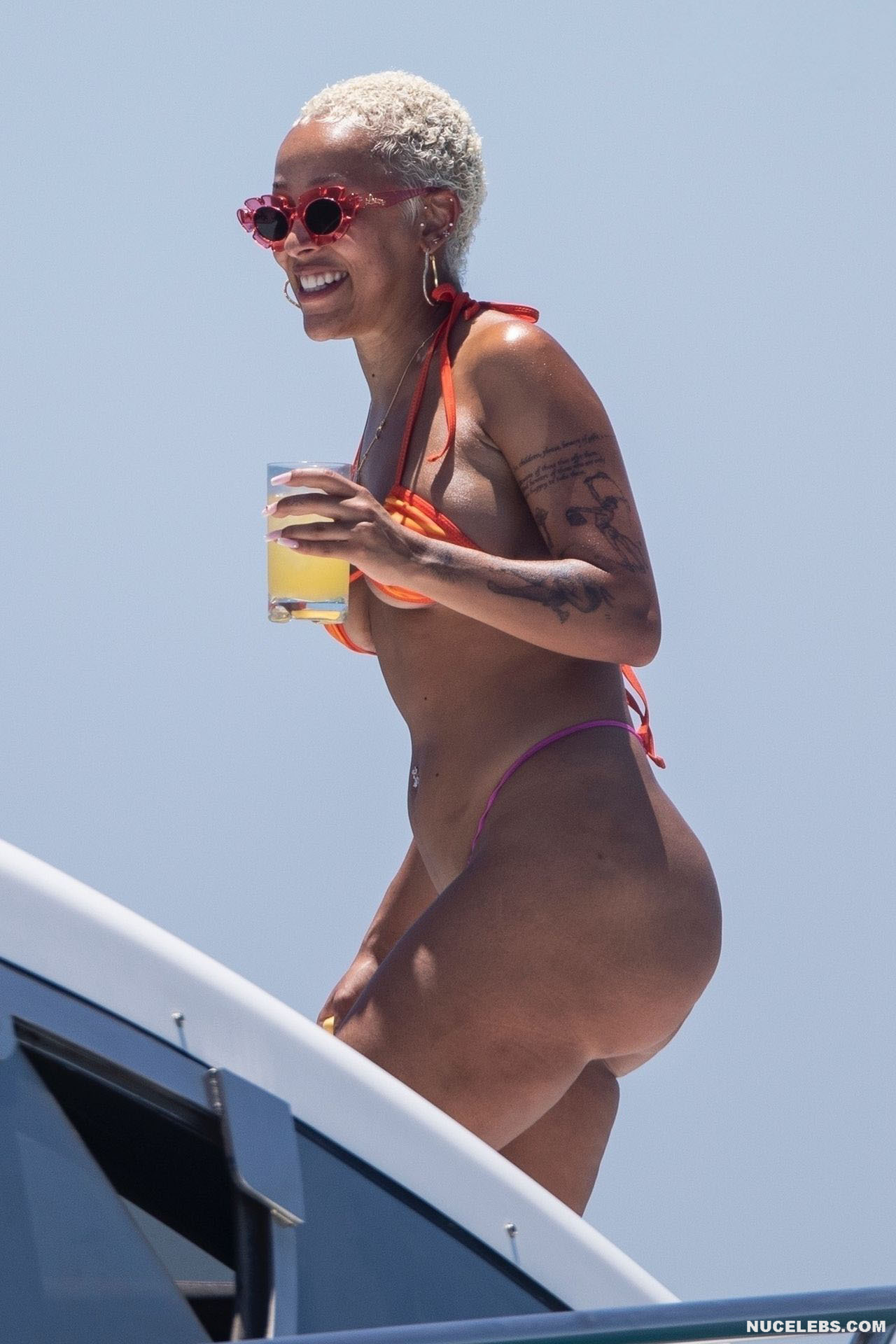 Doja Cat shaped her perception of beach beauty. It is with her that you relive the iconic bikini moments that have left a lasting imprint on your memory. This celebrity felt absolutely confident, relaxing in a miniature bikini, the bottom of which consisted of orange-purple pieces of fabric. Moreover, the narrow purple stripe of the thong did not at all cover Doja Cat’s nude big ass. However, her awesome boobs were also very loosely covered by small pieces of orange cloth…