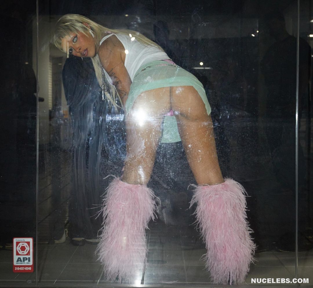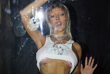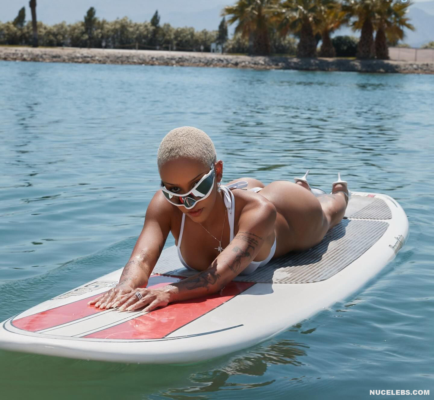 See Doja Cat amazing curves in these pictures! The 28-year-old celebrity loves to shock the public by appearing almost naked in front of the camera. So, Doja Cat’s nude huge tits did not hide her black transparent outfit with a cutout on her stomach at all. This singer planned to cover only her nipples with a narrow black stripe at the top of her outfit, but she couldn’t even hide them completely. Her pics in a tiny white bikini on a yacht deserve special attention. Agree, the narrow white stripe of the thong could not hide Doja Cat’s nude booty at all!
