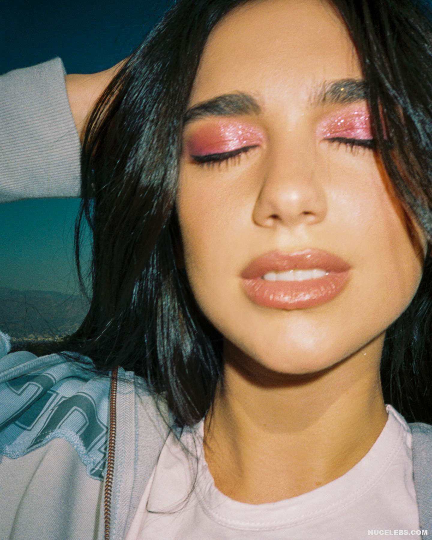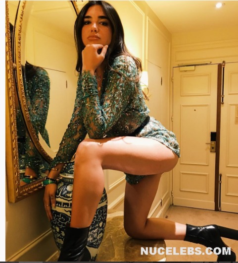 Passionate and sexy, Dua Lipa loves to tease her fans with provocative selfies. For example, this British singer is happy to show off her magnificent cameltoe. The girl took a defiant selfie, posing in a white tunic and yellow leggings. At the same time, the celebrity slightly moved her leg to the side, flaunting her pink panties, which were hiding Dua Lipa’s nude pussy.