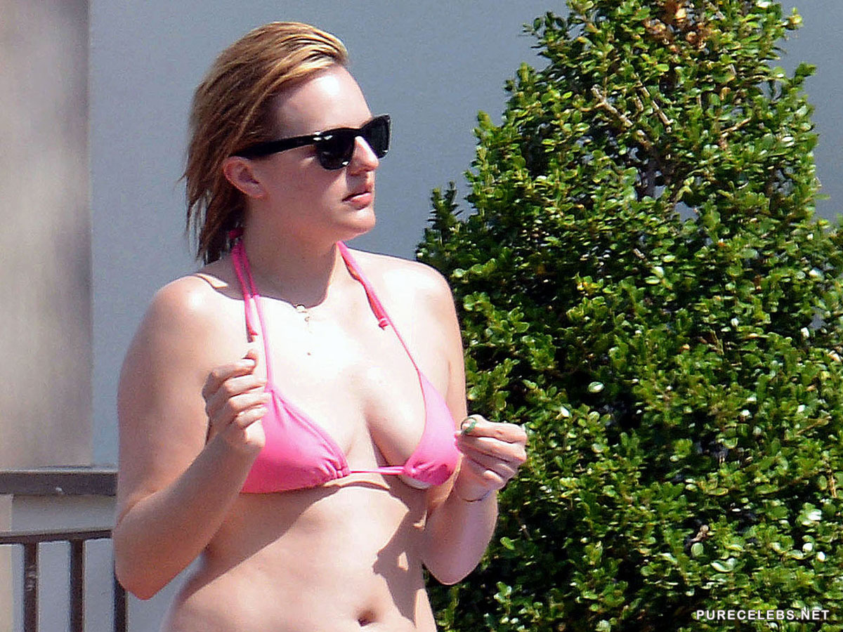 Not so long ago, photos of the American actress Elisabeth Moss leaked to the network and everyone was able to admire the figure of this charming blonde in a bikini, as well as a nude. It is worth noting that the celebrity looked insanely seductive in a small pink swimsuit and her big juicy boobs almost jumped out of her bra. No less seductive looked her ass in narrow pink thongs, which she gladly showed.