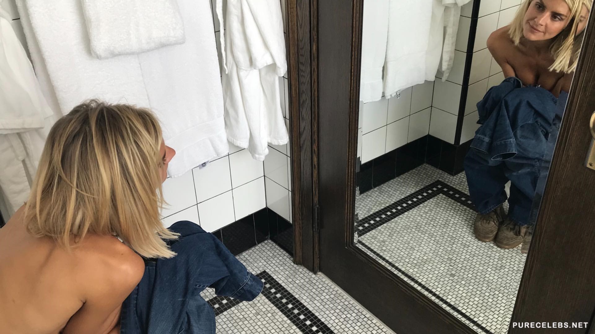 American actress and comedian Elize Coupe has an awesome body in addition to her cute sense of humor. The blond babe recently snapped some naughty pictures of herself while on the toilet. Elize bent down in an effort to conceal her perky naked tits while looking into the mirror with a cheeky smirk on her lovely face. These sexy selfies perfectly represent Coupe’s quirky personality.