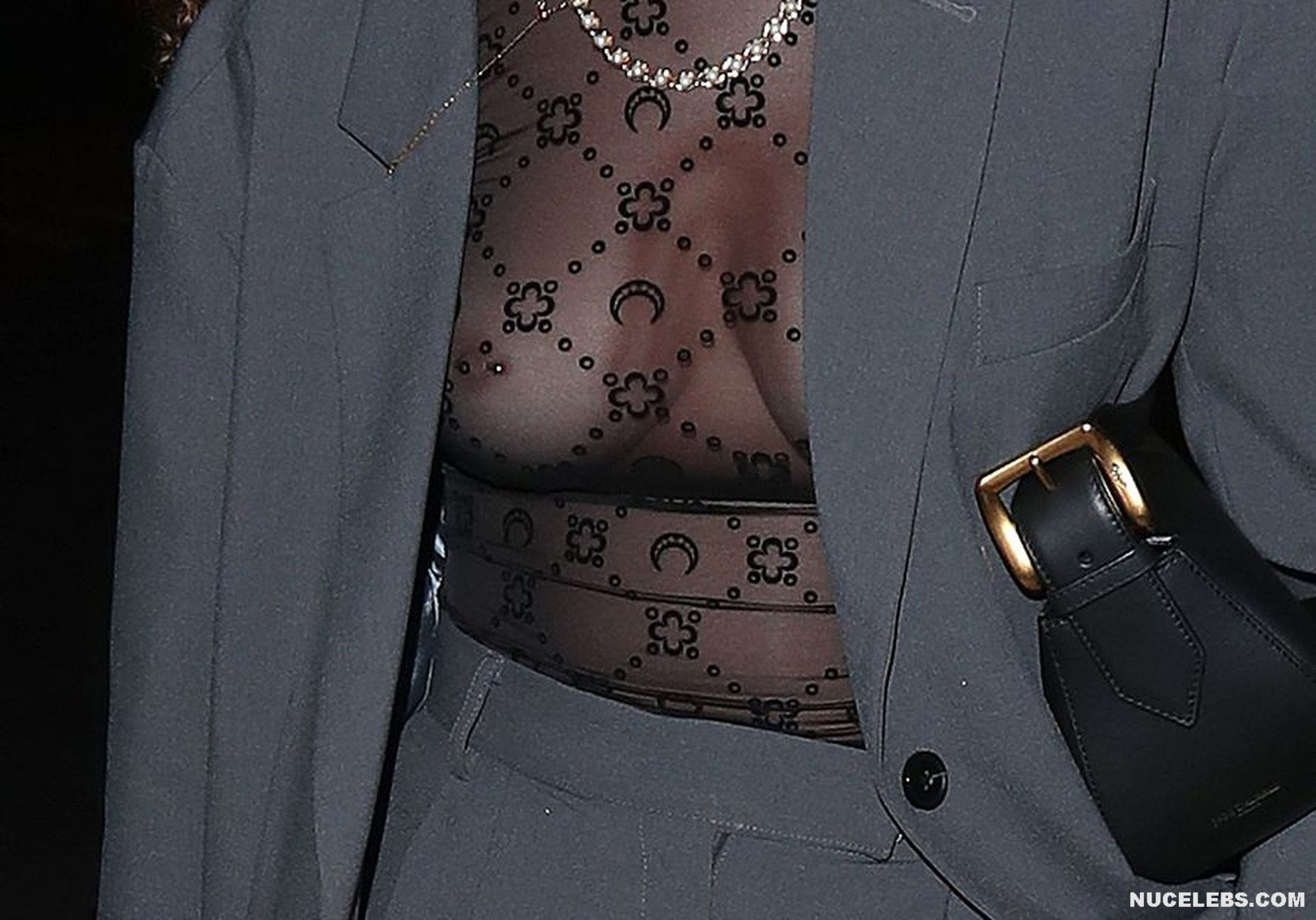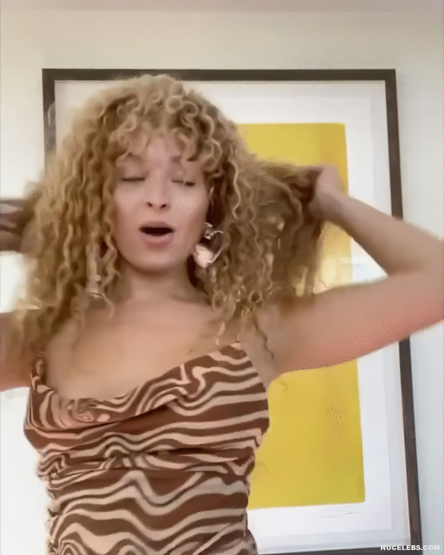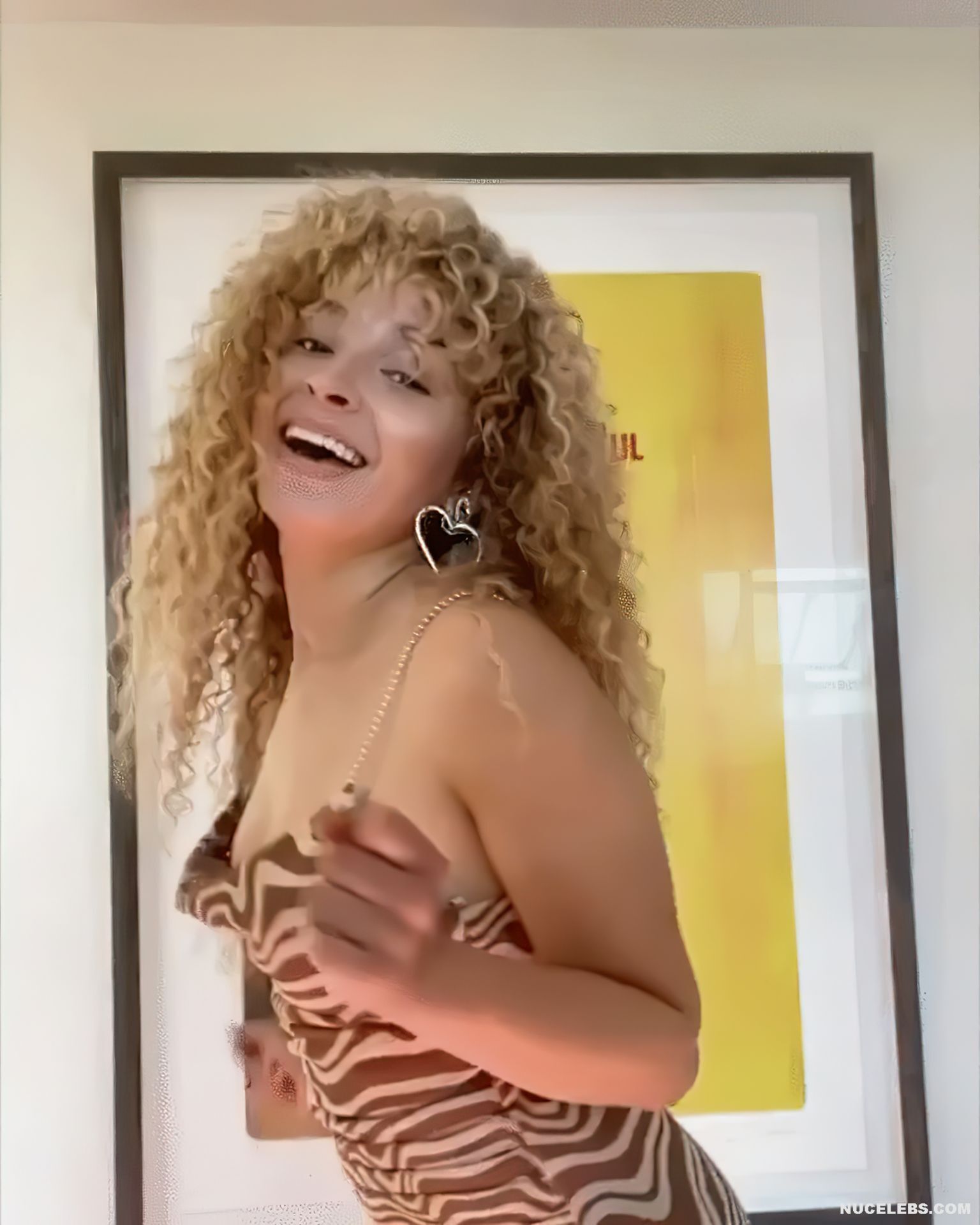 Ella Eyre loves to be the center of public attention. This 29-year-old singer behaves very provocatively and often dresses in provocative outfits. For example, this beauty was photographed in a gray business suit. And it seems, what is unusual and provocative here? It turns out that Ella Eyre’s nude boobs were visible through a black transparent blouse, which she wore under an unbuttoned jacket. Here’s another nipple slip moment with this star. This hot babe in a beige and brown low-cut dress was very active in front of the camera. And at some point Ella Eyre nude tit with brown nipple jumped out!