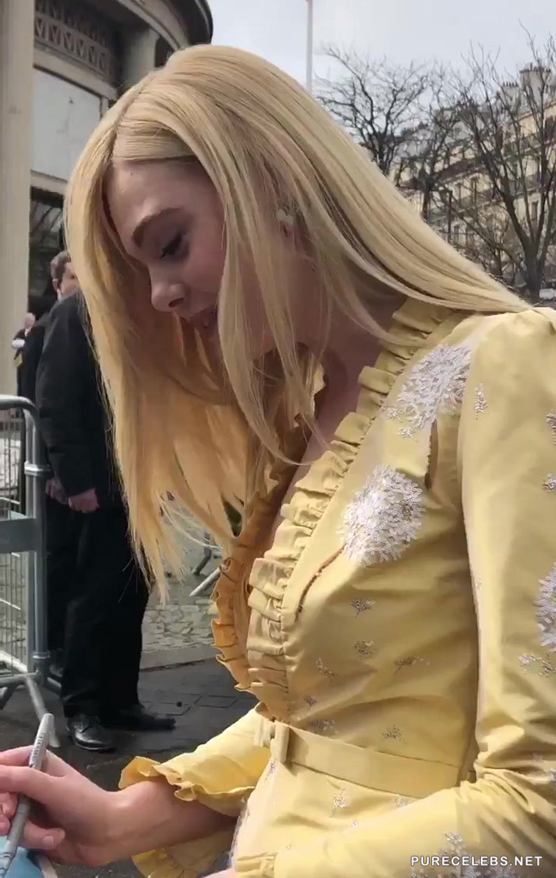 Elle Fanning is walking down the street without a bra on and as she walks past a guy with a camera she ends up flashing her nipples. We can see down her blouse when she walks by and she looks like she knows what she is doing. She wants to raise her fan’s “interest” in her work by showing off her boobies.