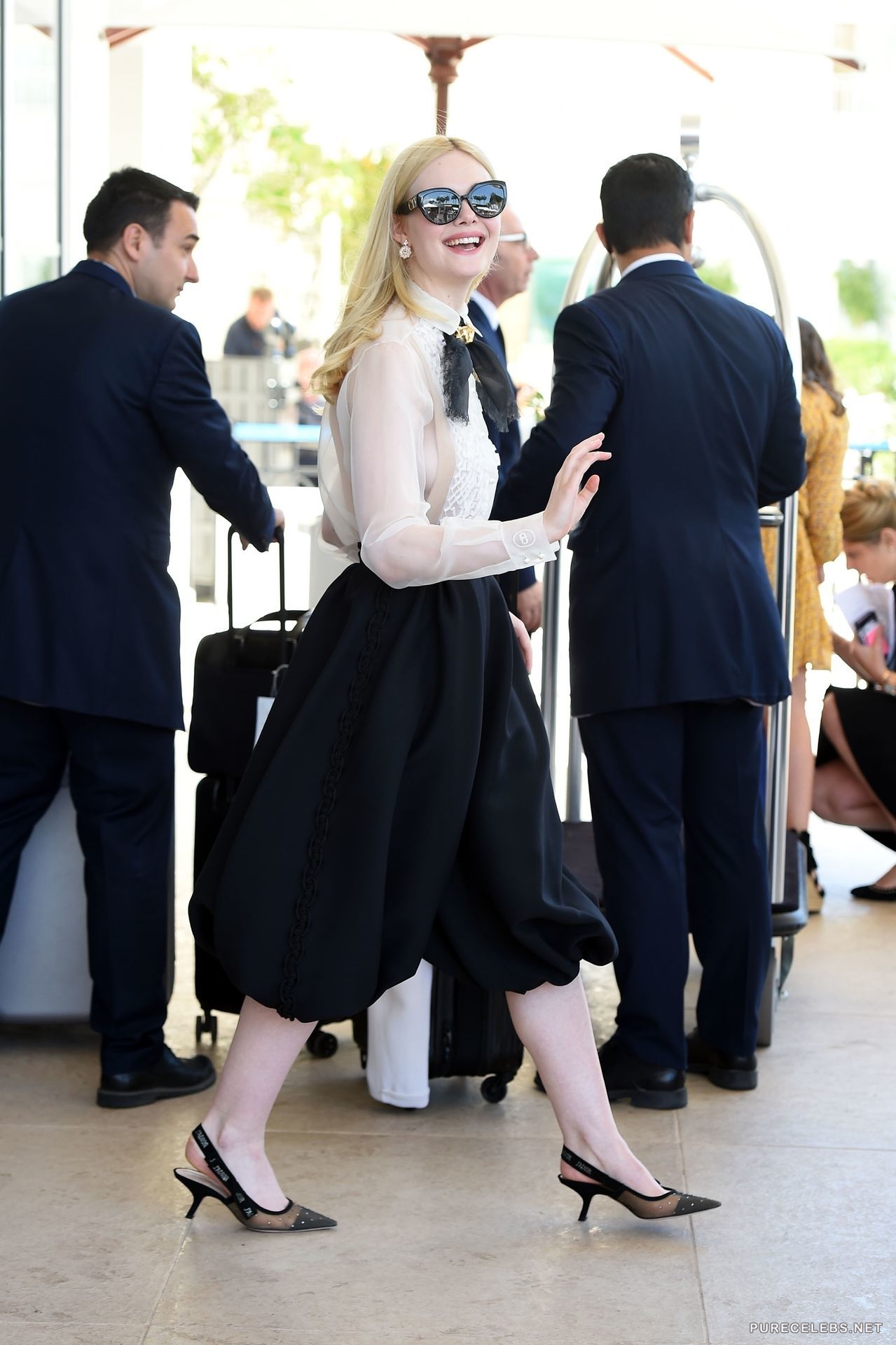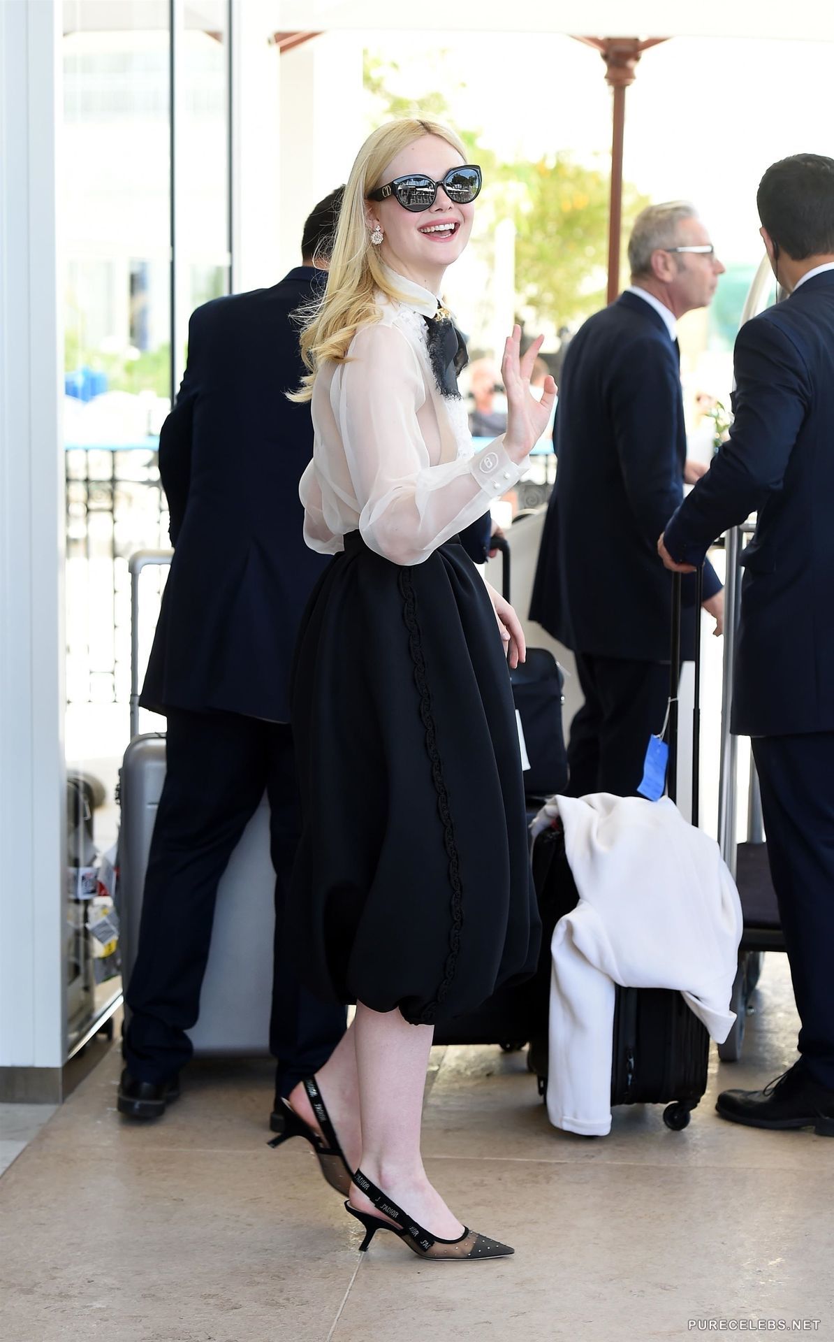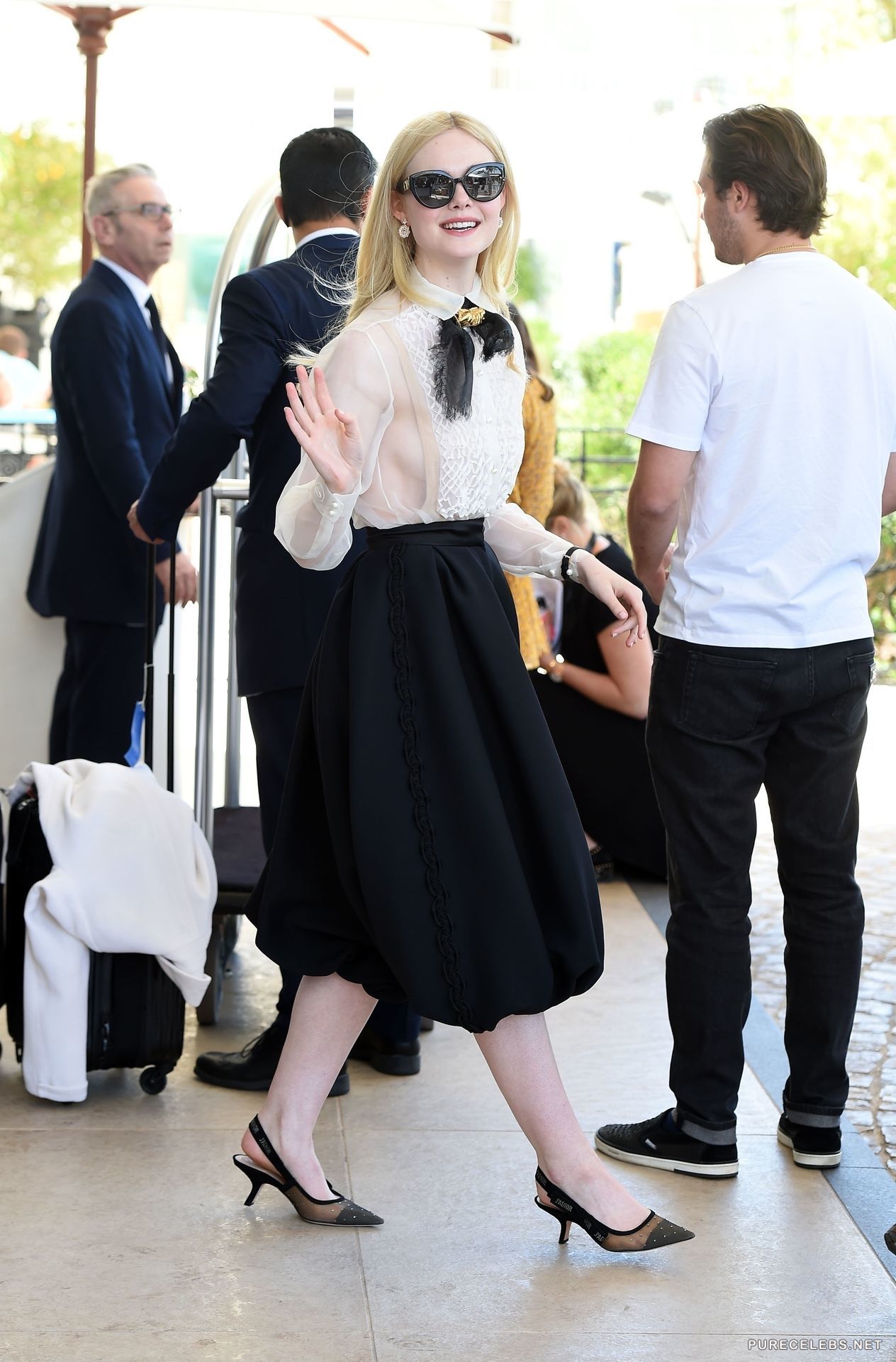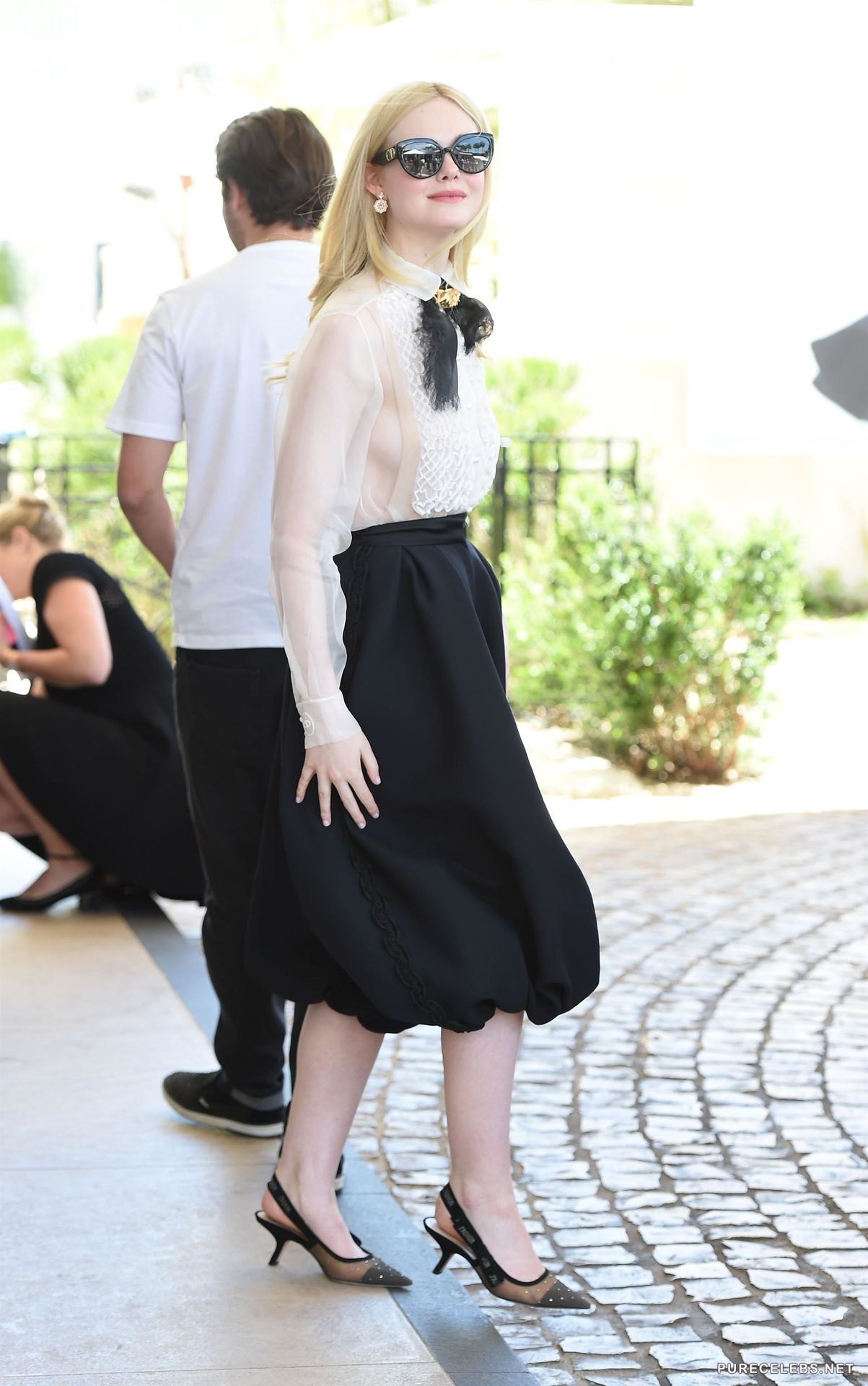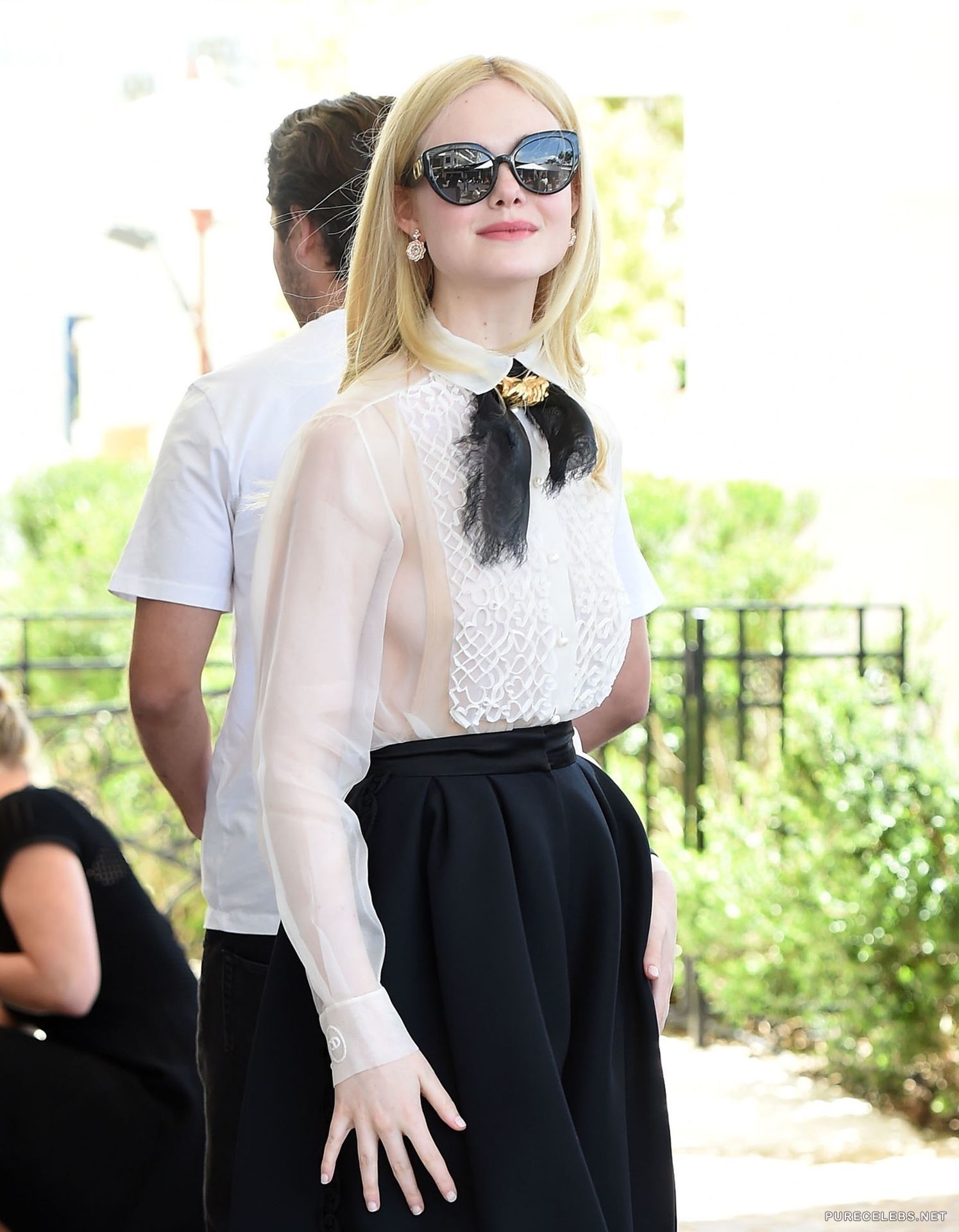 Amazing American actress Elle Fanning was spotted at a party in a very lovely outfit. The cute blonde wore a long black skirt, a white translucent blouse and complemented her look with gold earrings and black sunglasses. The girl smiled sweetly and posed for the camera and at some point it was possible to notice that she didn’t put on her bra and her awesome tits shone through the blouse and it looked very erotic.