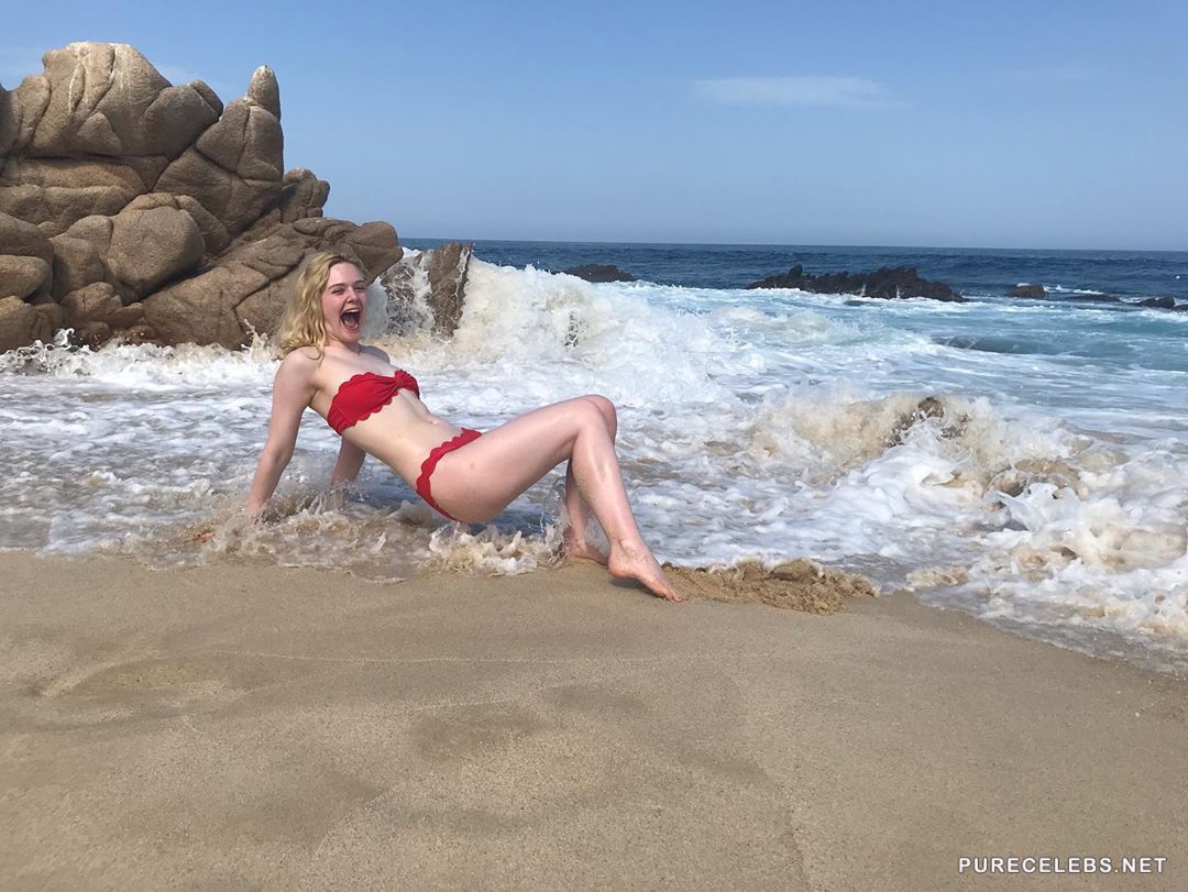 You will be delighted when you see the stunning blonde Elle Fanning on a beach holiday. This American actress loves to attract attention to herself and gladly flaunts her slim body. This time, the beauty was wearing a pink hat and a small red bikini, which beautifully emphasized the curves of her wonderful body. Her wet titties and booty looked just fine in a small bikini when she was swimming in the sea waves.