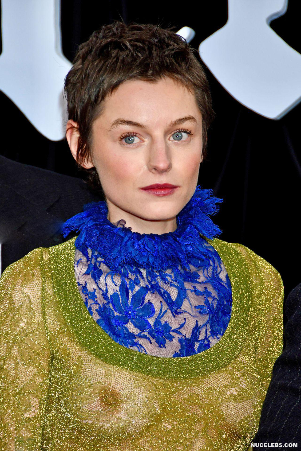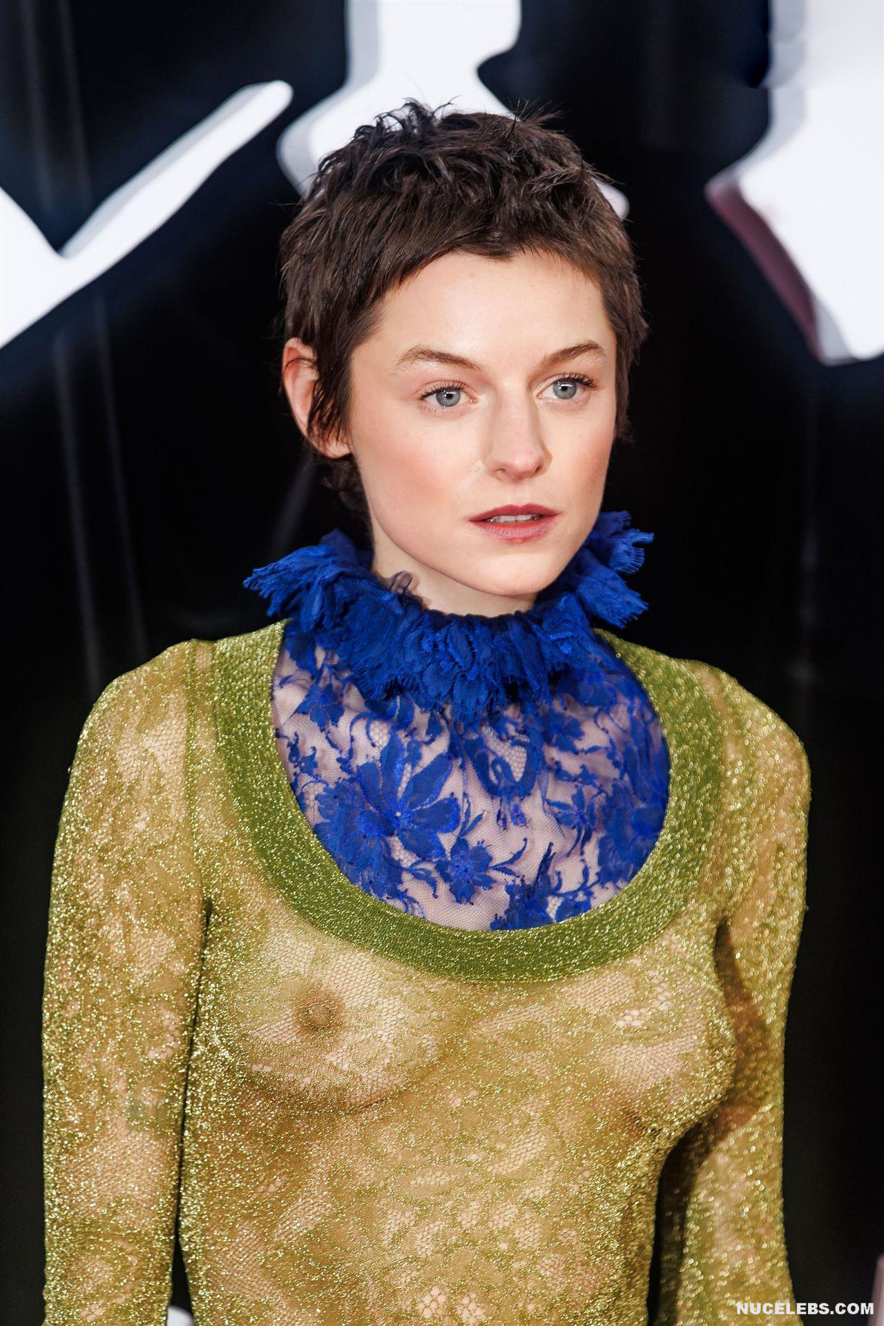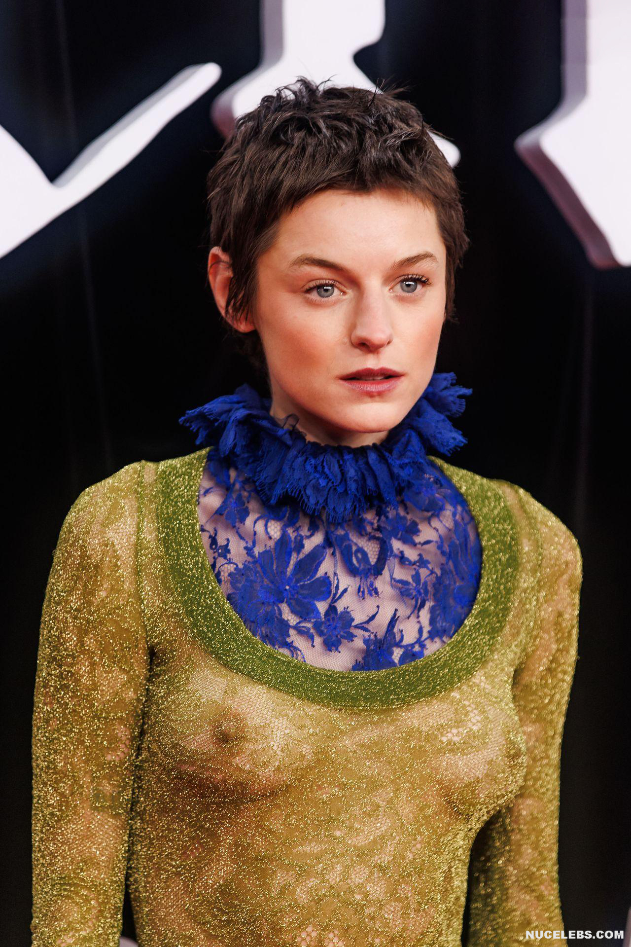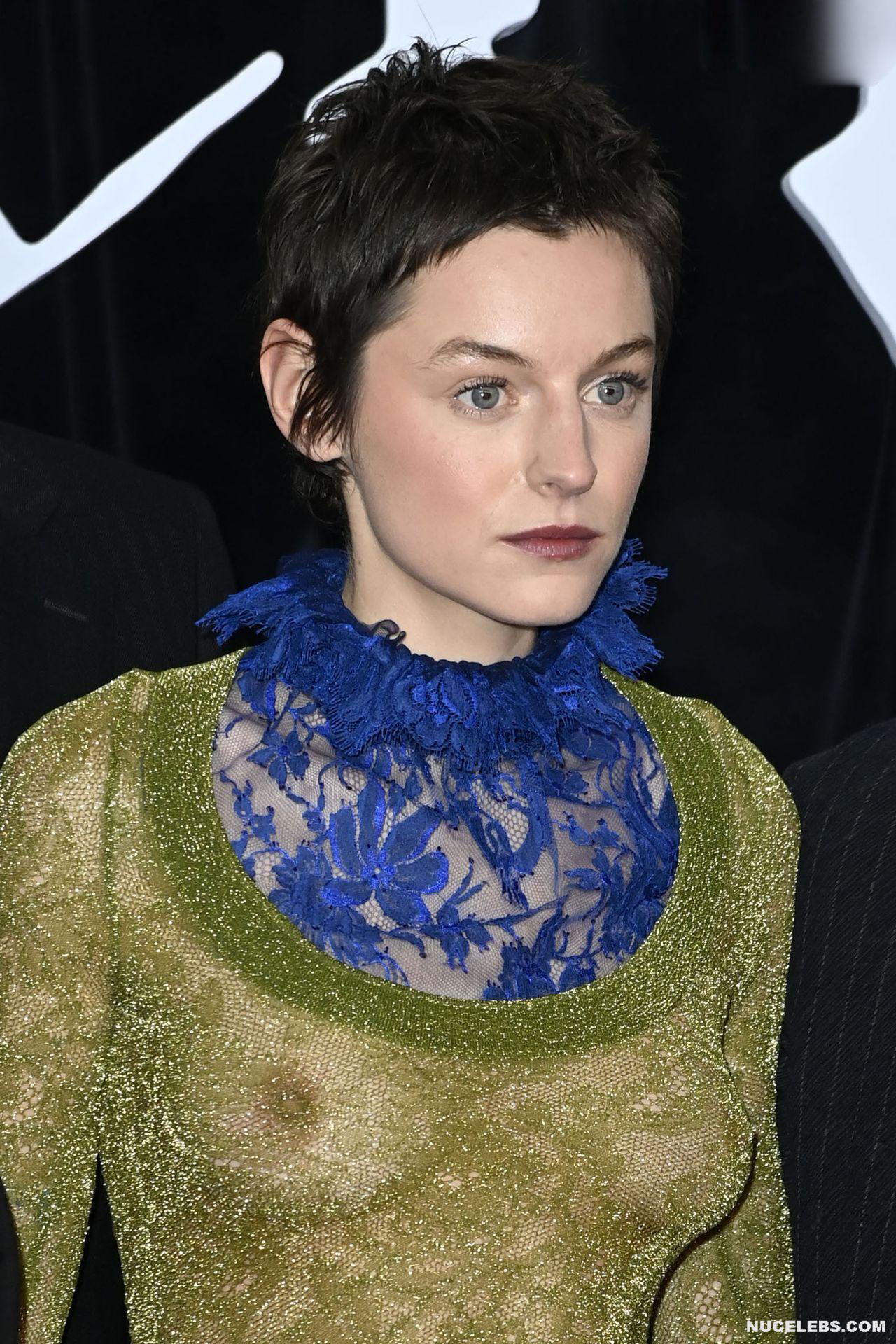 Hot babe Emma Corrin showed off her nude boobs during her recent red carpet appearance. It was simply impossible not to notice her! This celebrity flaunted her stunning figure in a lacy green dress with pink and blue trim. At the same time, Emma Corrin nude boobies with tattooed nipples were visible through the transparent fabric! Uncover this and other stunning images of your favorite actress.