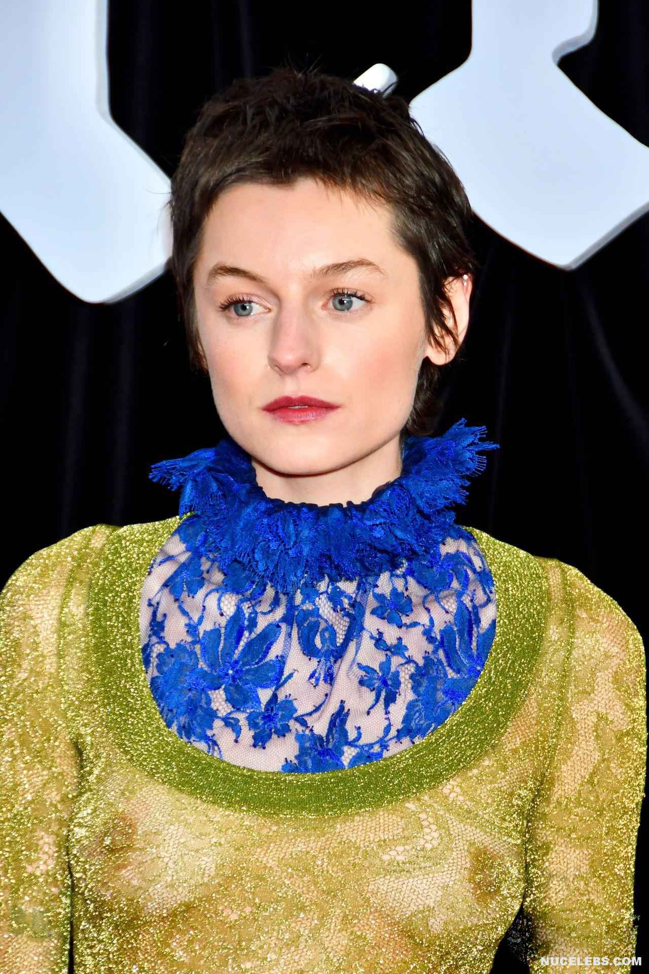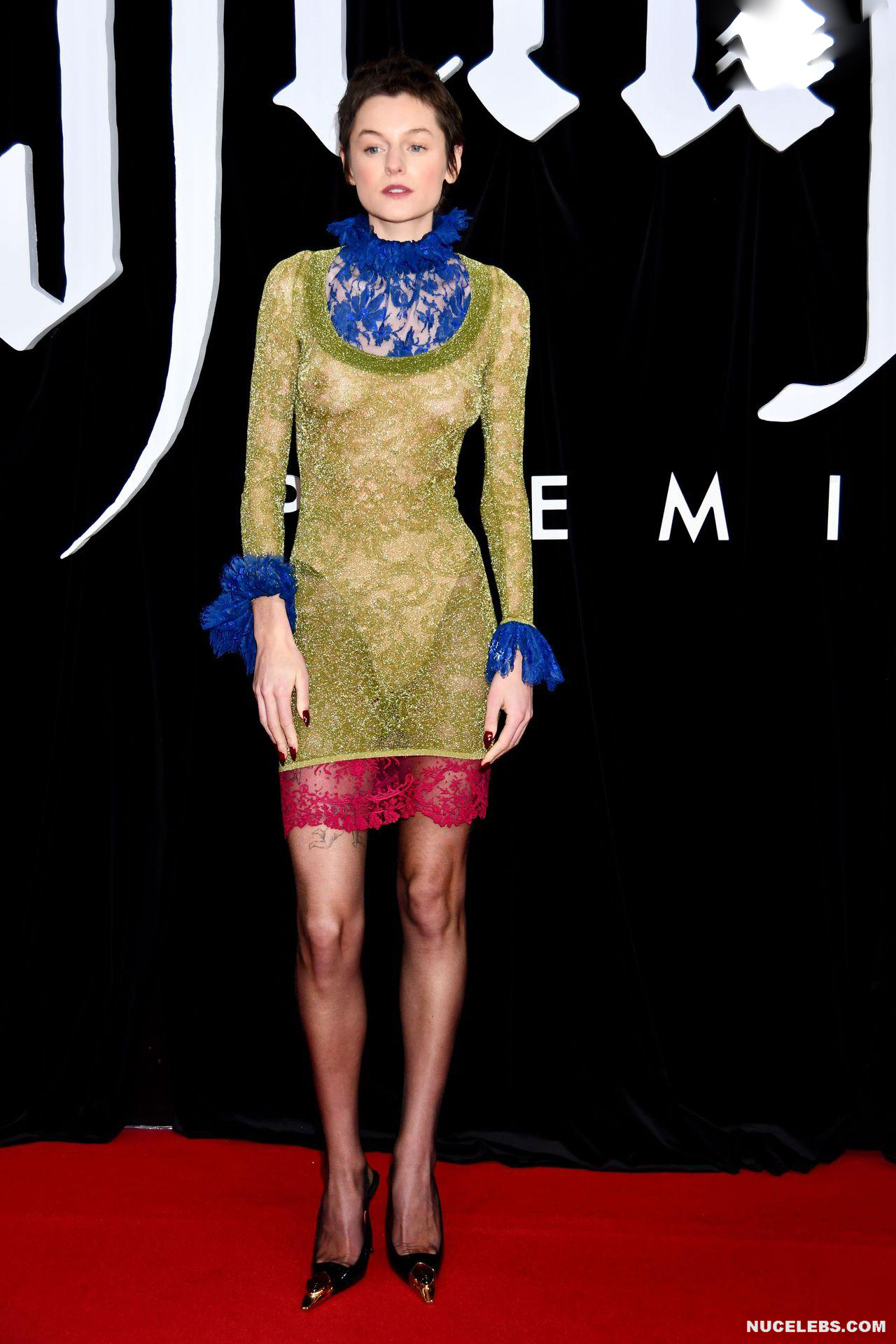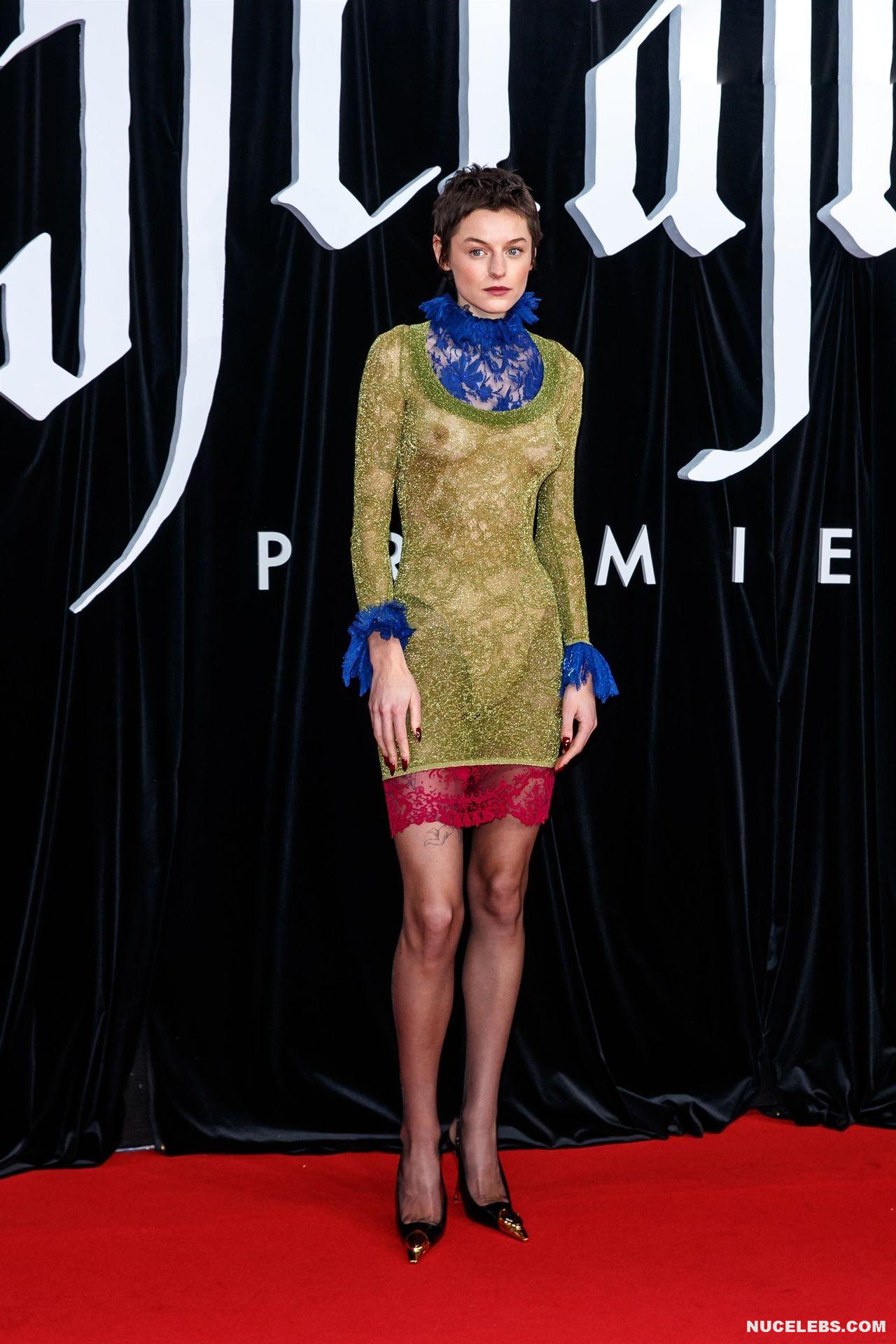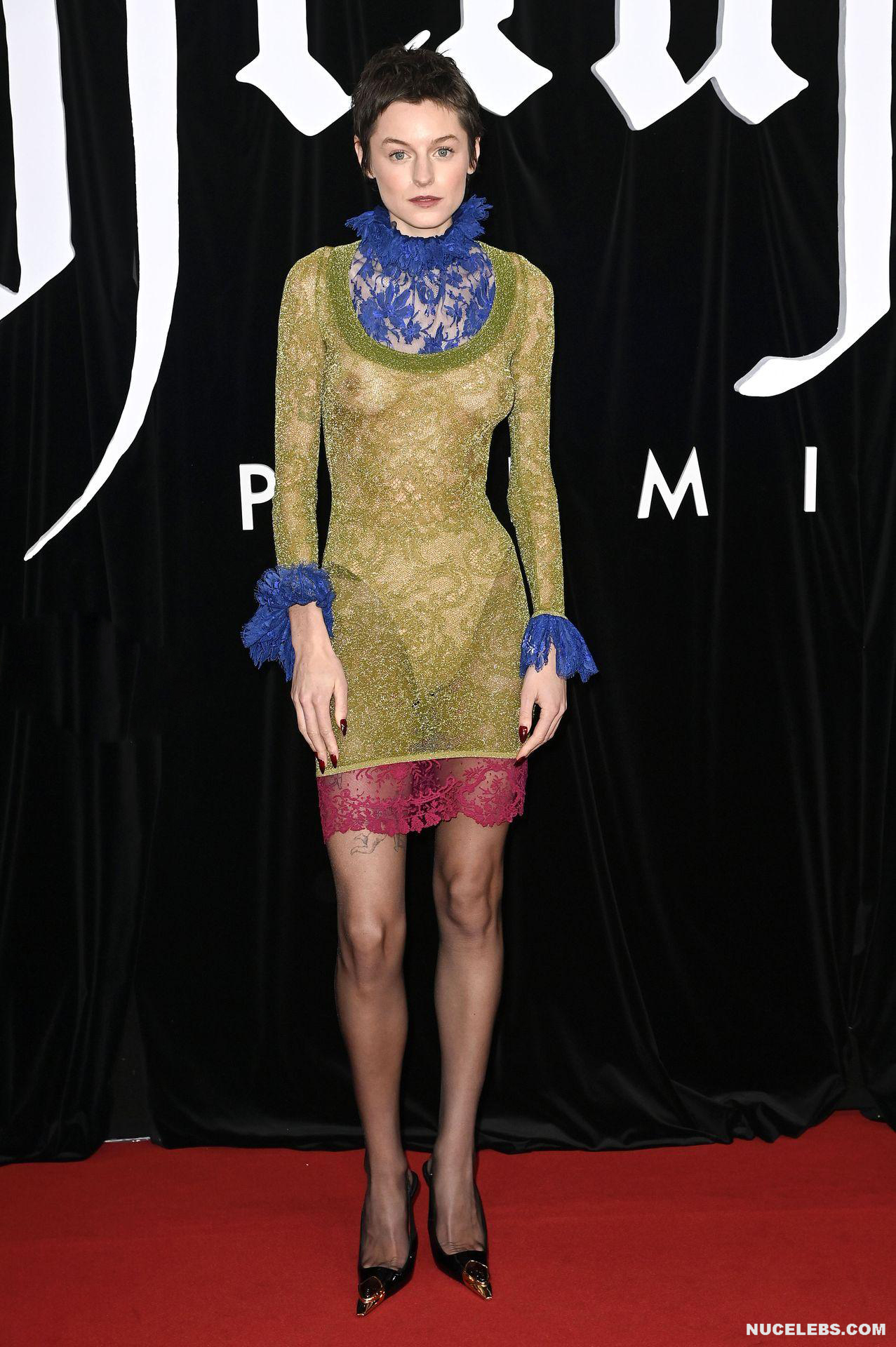 Hot babe Emma Corrin showed off her nude boobs during her recent red carpet appearance. It was simply impossible not to notice her! This celebrity flaunted her stunning figure in a lacy green dress with pink and blue trim. At the same time, Emma Corrin nude boobies with tattooed nipples were visible through the transparent fabric! Uncover this and other stunning images of your favorite actress.
