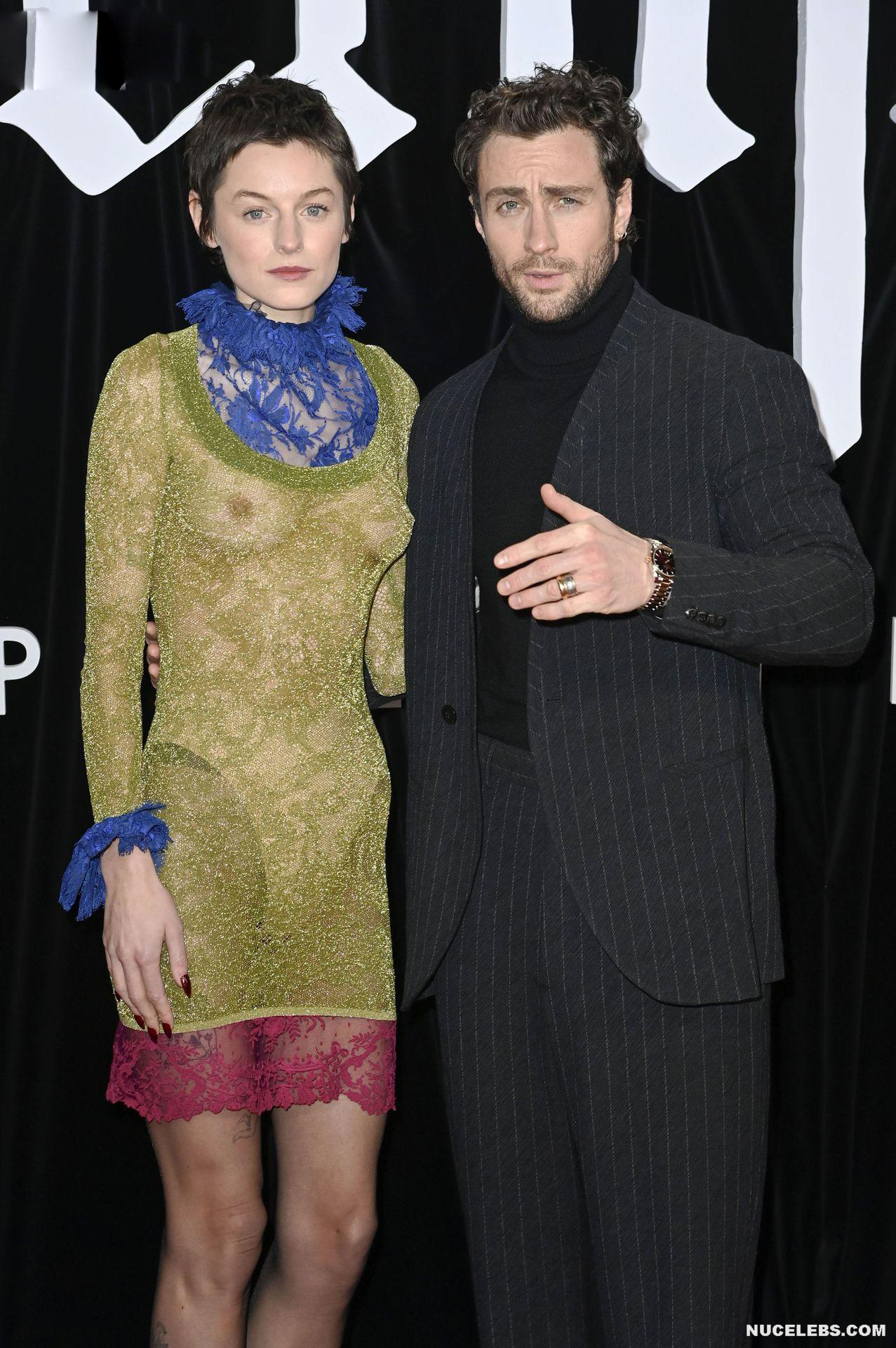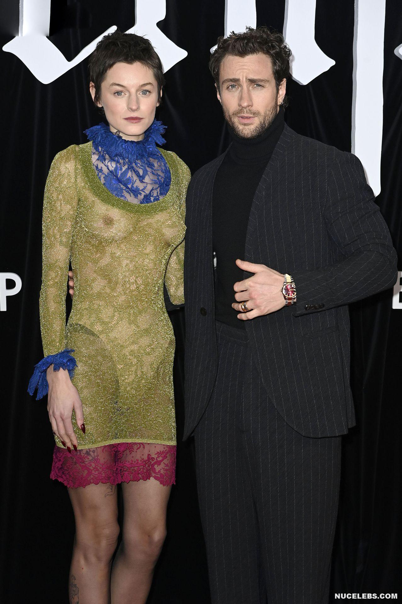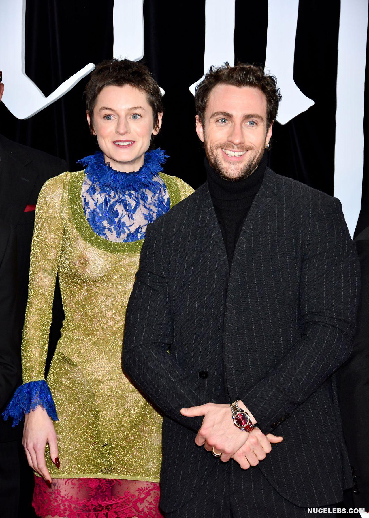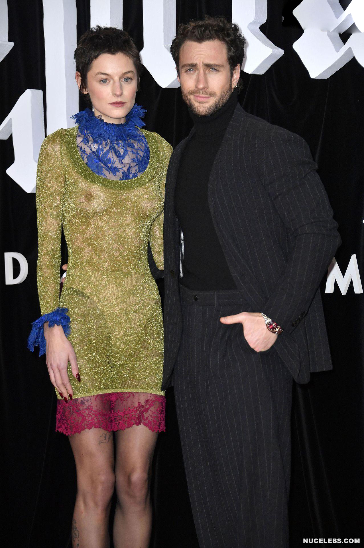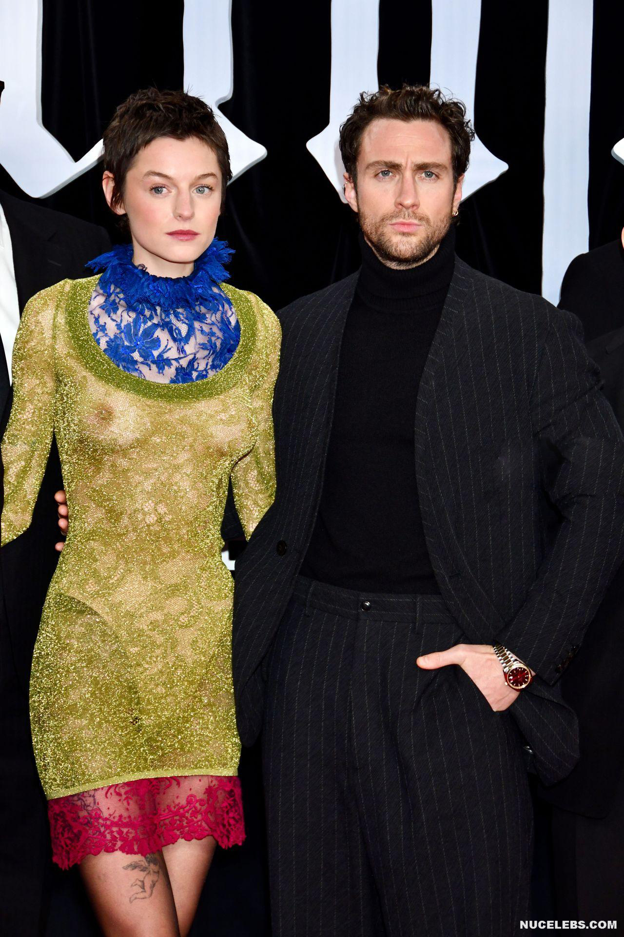 Hot babe Emma Corrin showed off her nude boobs during her recent red carpet appearance. It was simply impossible not to notice her! This celebrity flaunted her stunning figure in a lacy green dress with pink and blue trim. At the same time, Emma Corrin nude boobies with tattooed nipples were visible through the transparent fabric! Uncover this and other stunning images of your favorite actress.