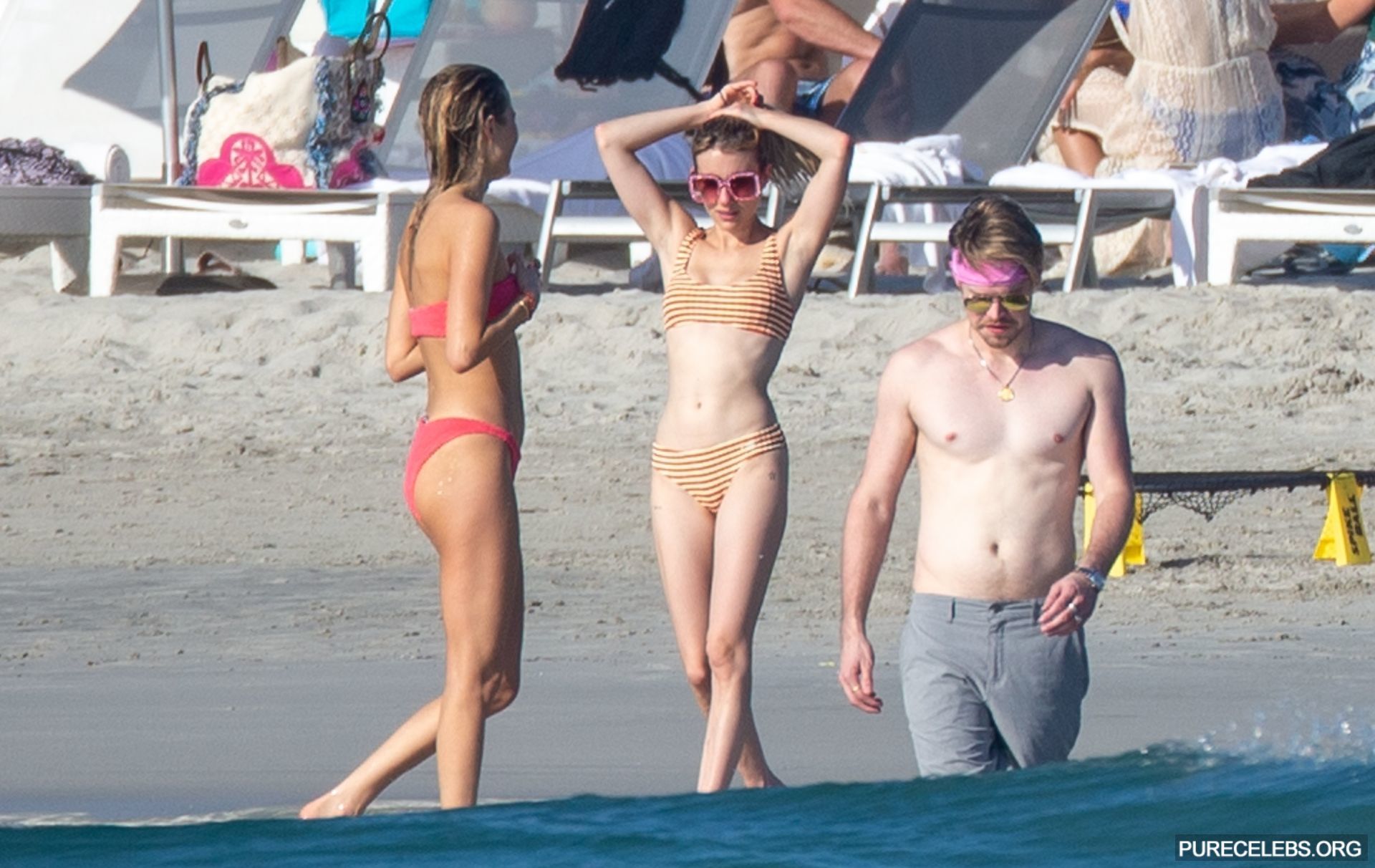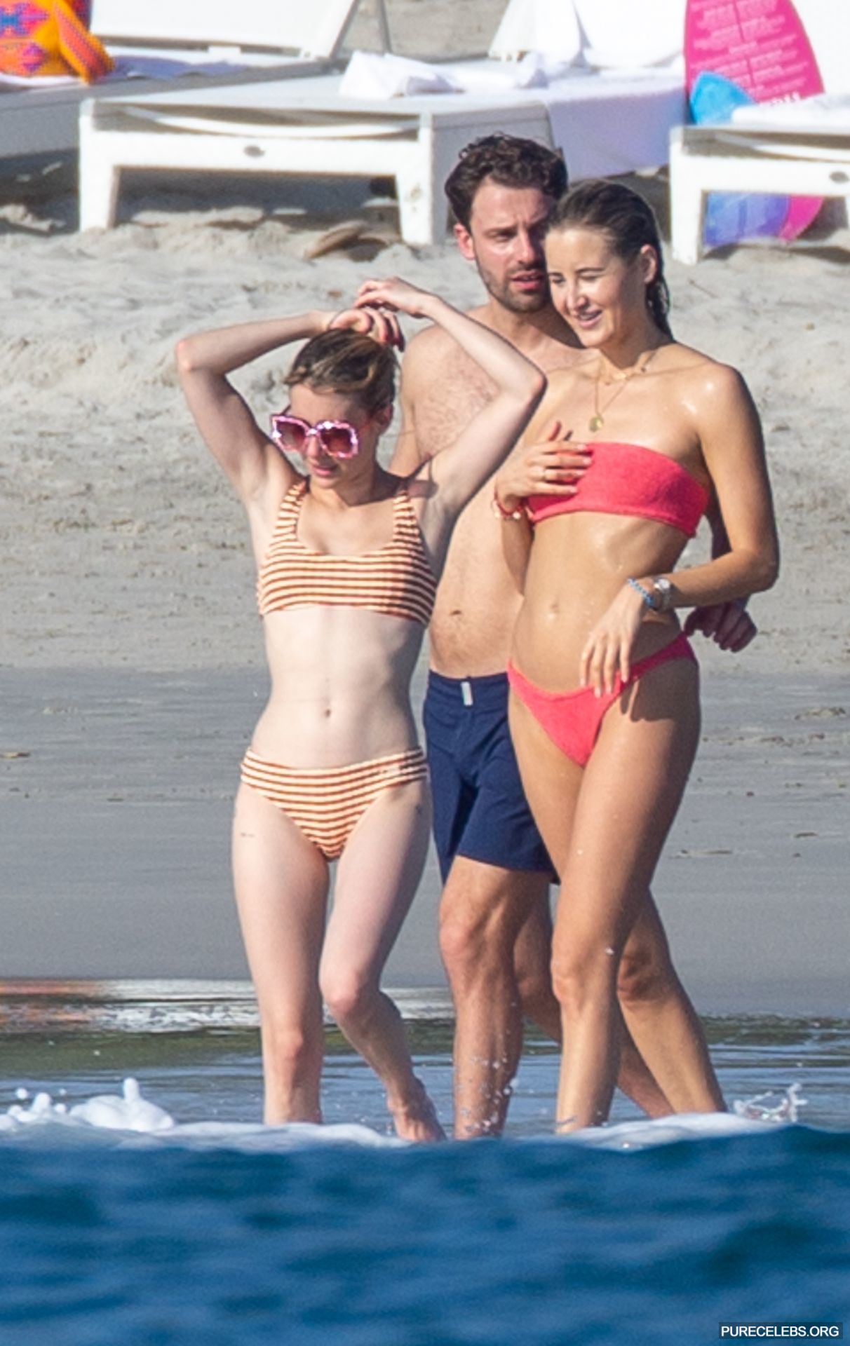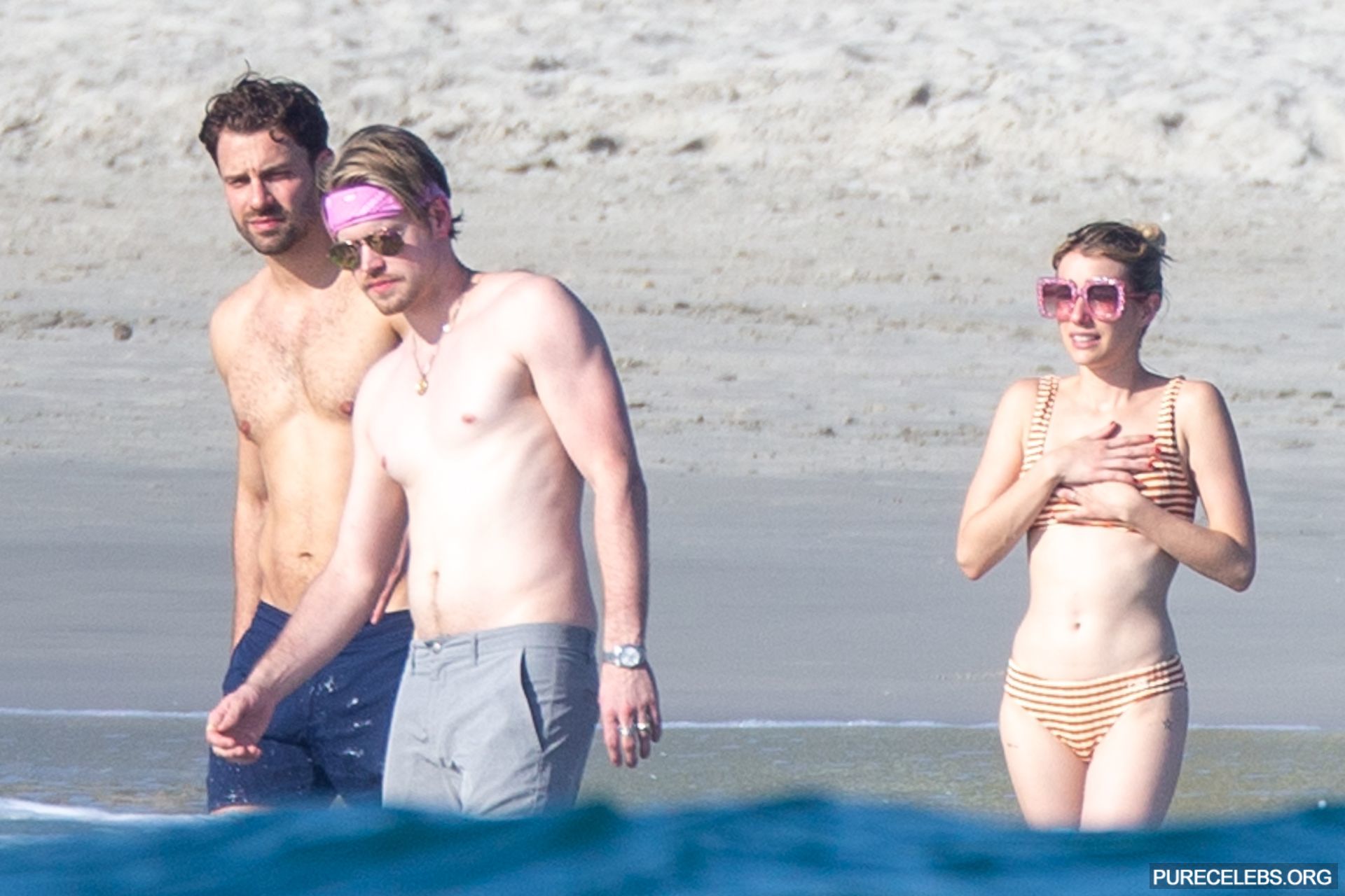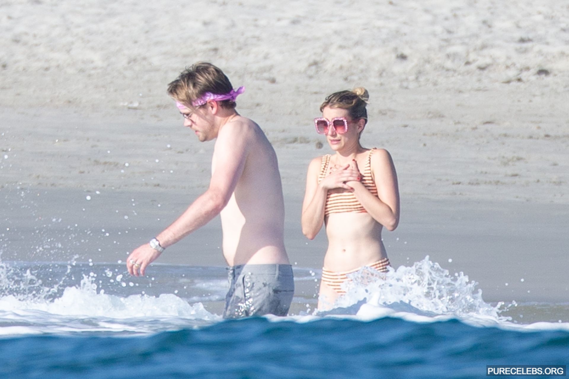 Paparazzi decided to pamper us with hot but not nude photos of Emma Roberts. This American singer looked very seductive, appearing on the beach in a striped bikini. It was impossible to look away from her slender figure. Her petite boobs in a tight-fitting bra were very sexy. And her thin waist combined with slim hips was breathtaking!