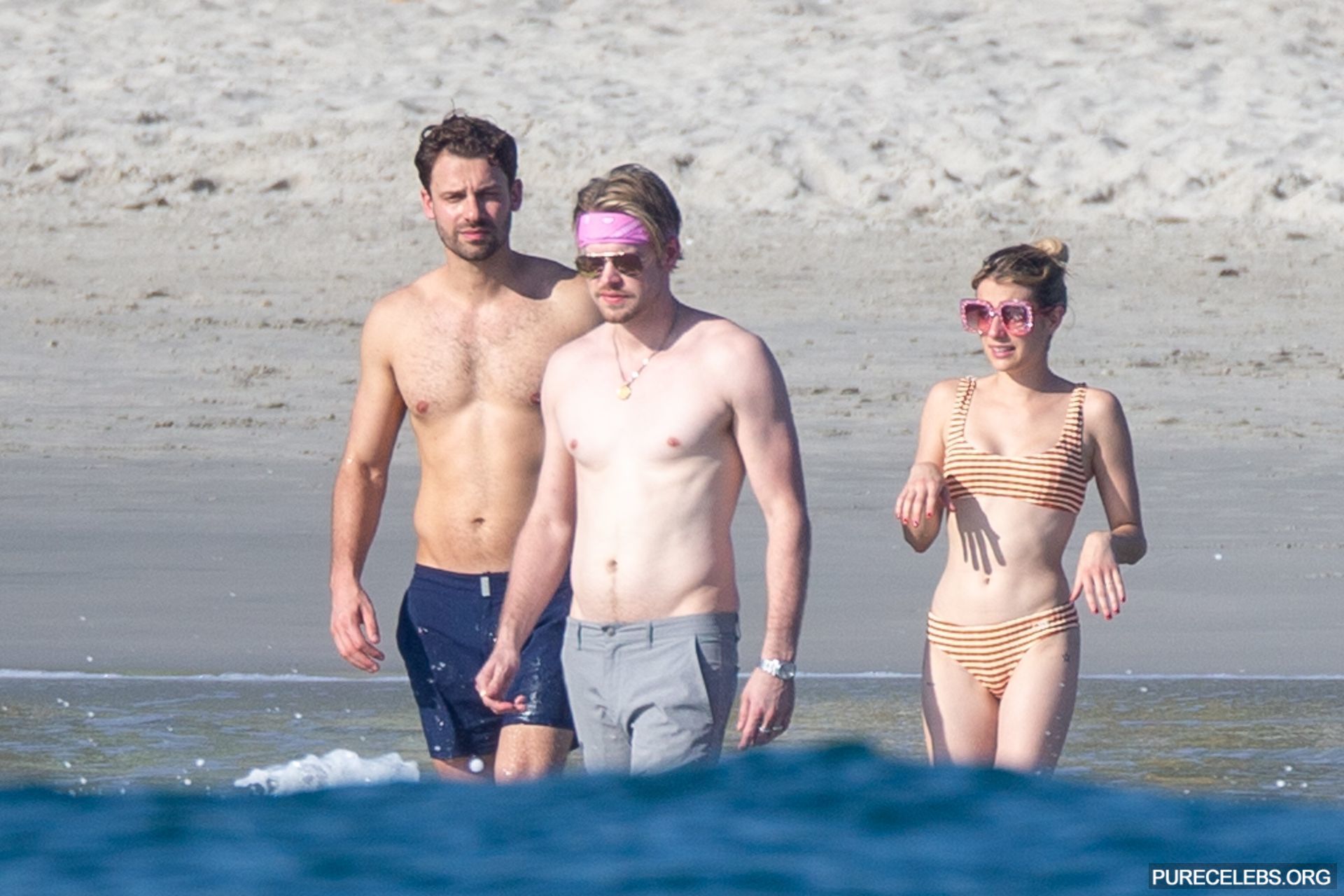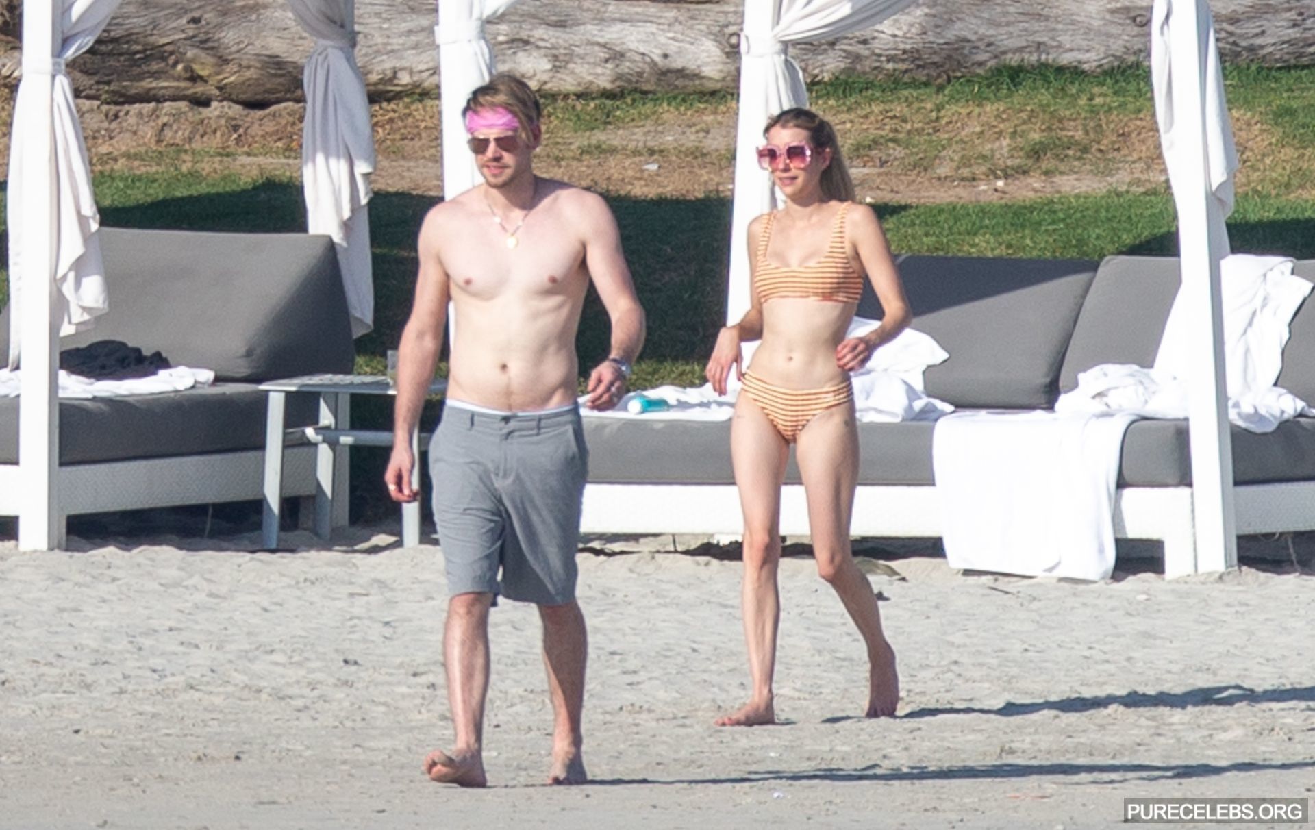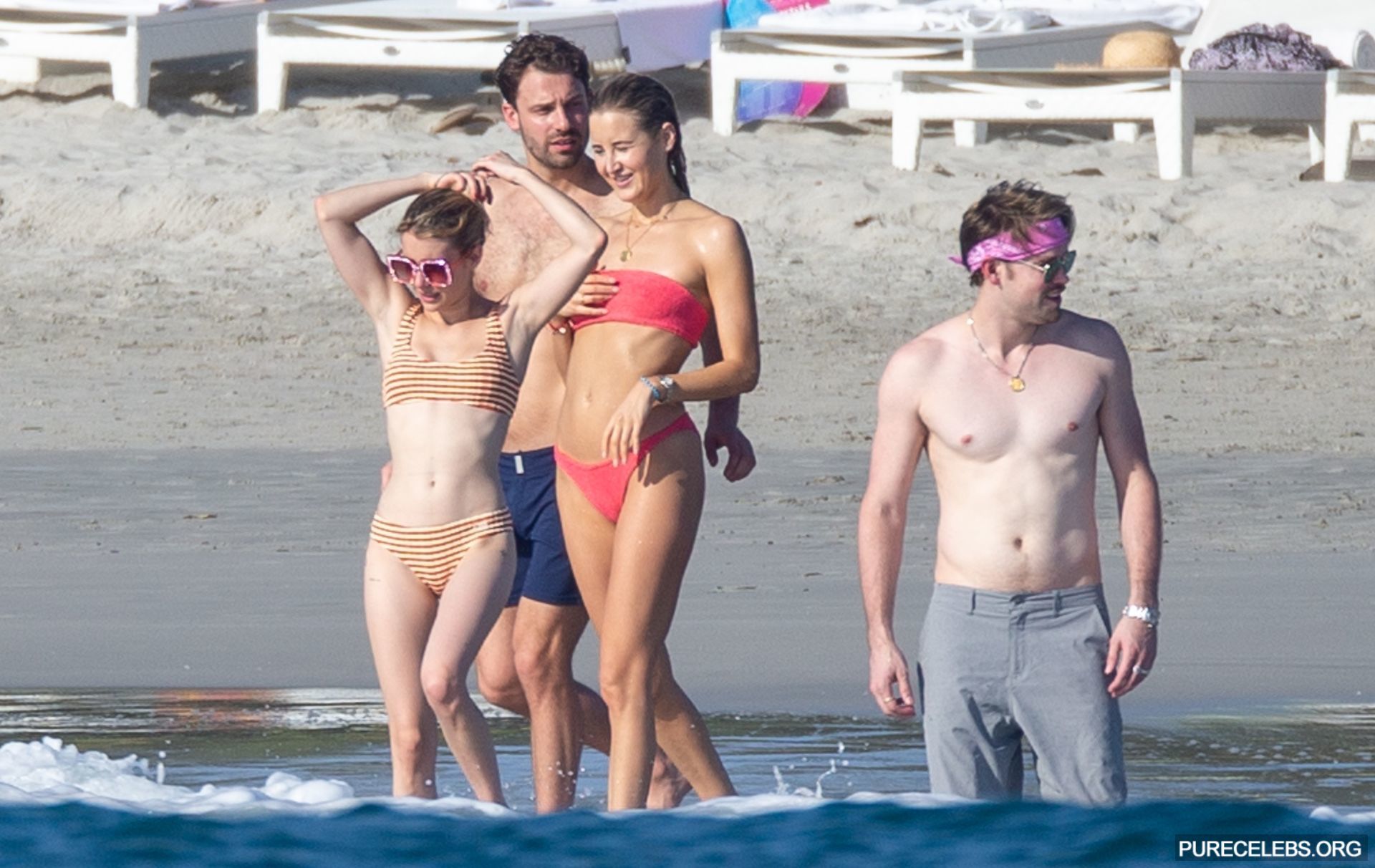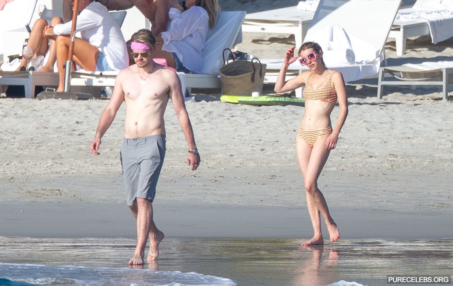Paparazzi decided to pamper us with hot but not nude photos of Emma Roberts. This American singer looked very seductive, appearing on the beach in a striped bikini. It was impossible to look away from her slender figure. Her petite boobs in a tight-fitting bra were very sexy. And her thin waist combined with slim hips was breathtaking!