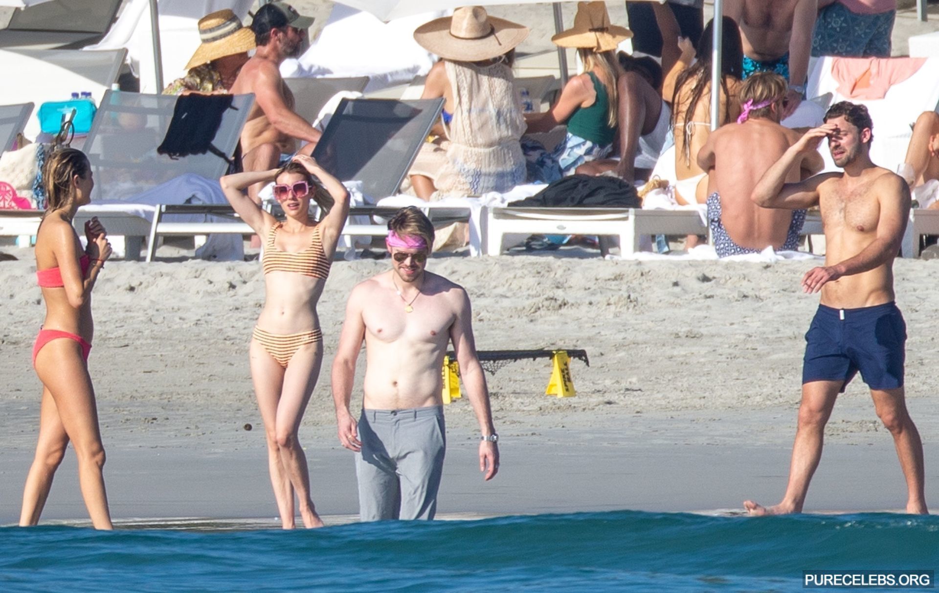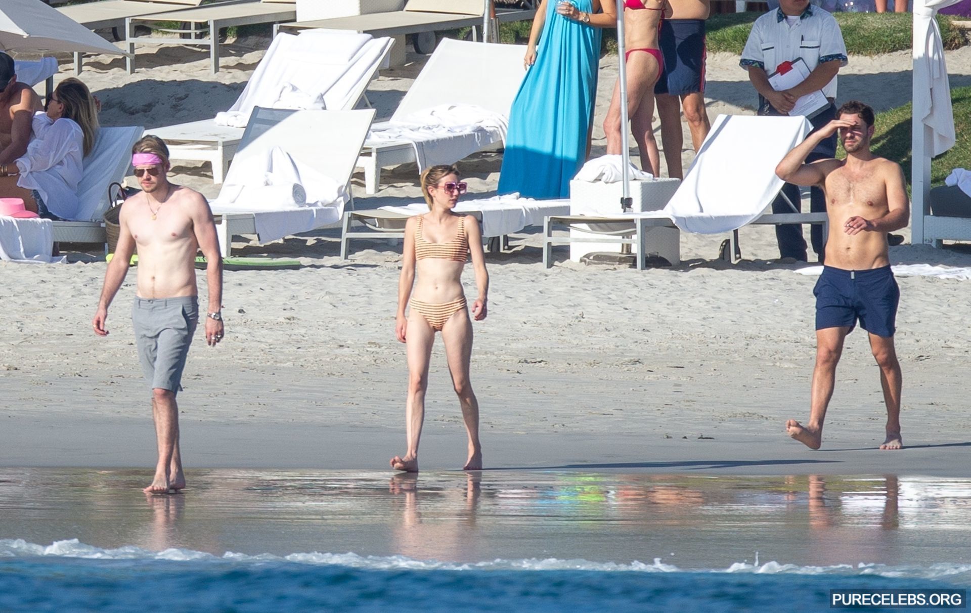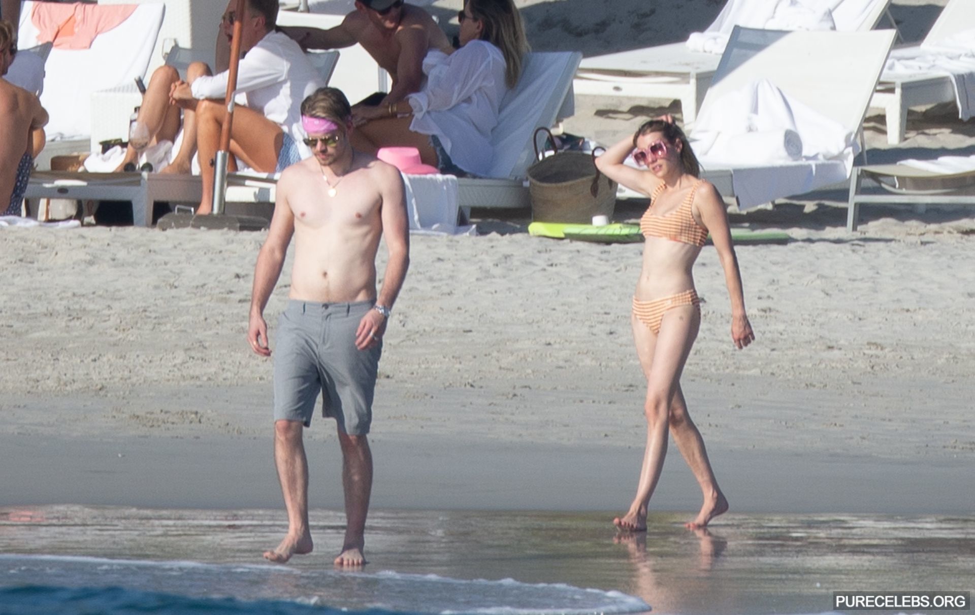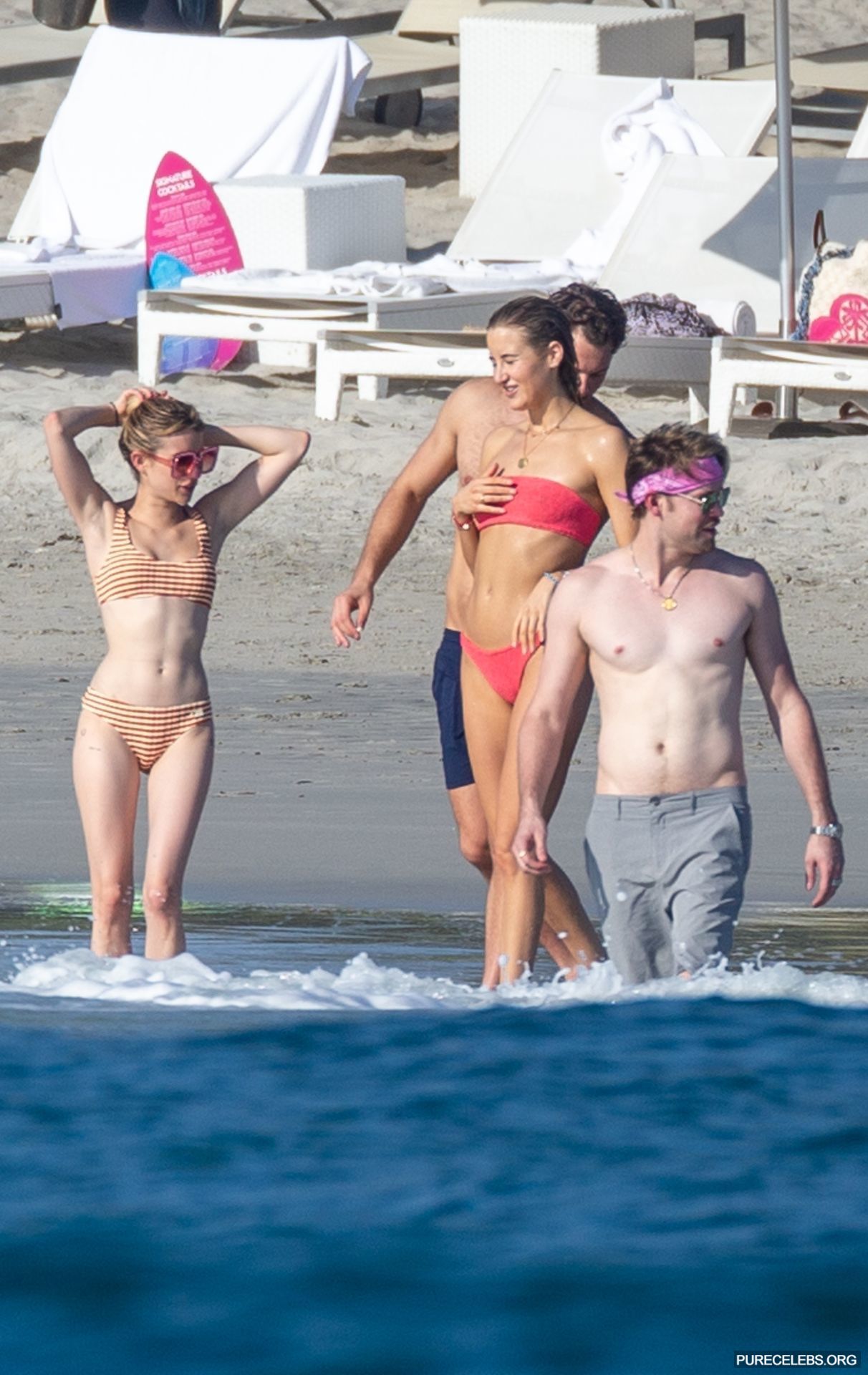 Paparazzi decided to pamper us with hot but not nude photos of Emma Roberts. This American singer looked very seductive, appearing on the beach in a striped bikini. It was impossible to look away from her slender figure. Her petite boobs in a tight-fitting bra were very sexy. And her thin waist combined with slim hips was breathtaking!