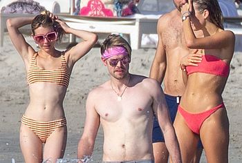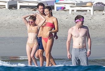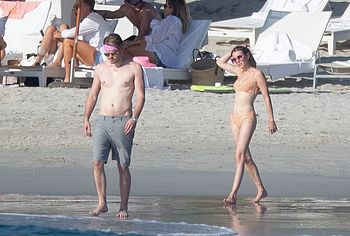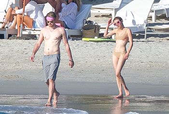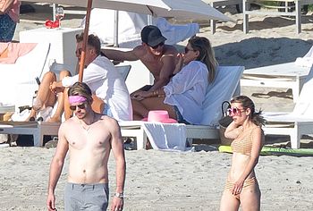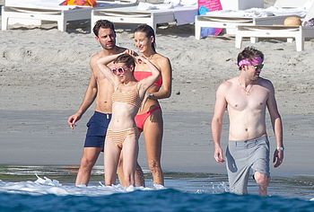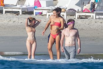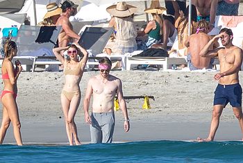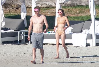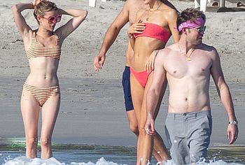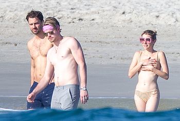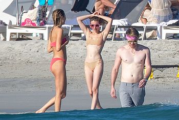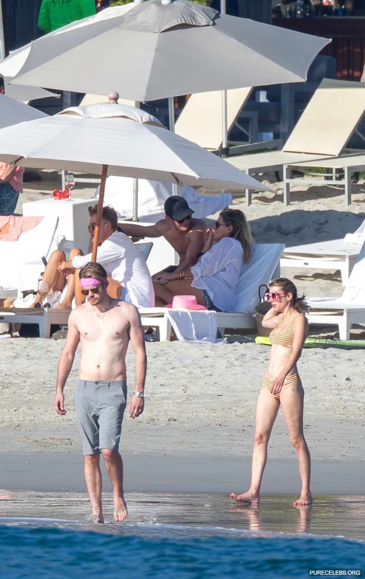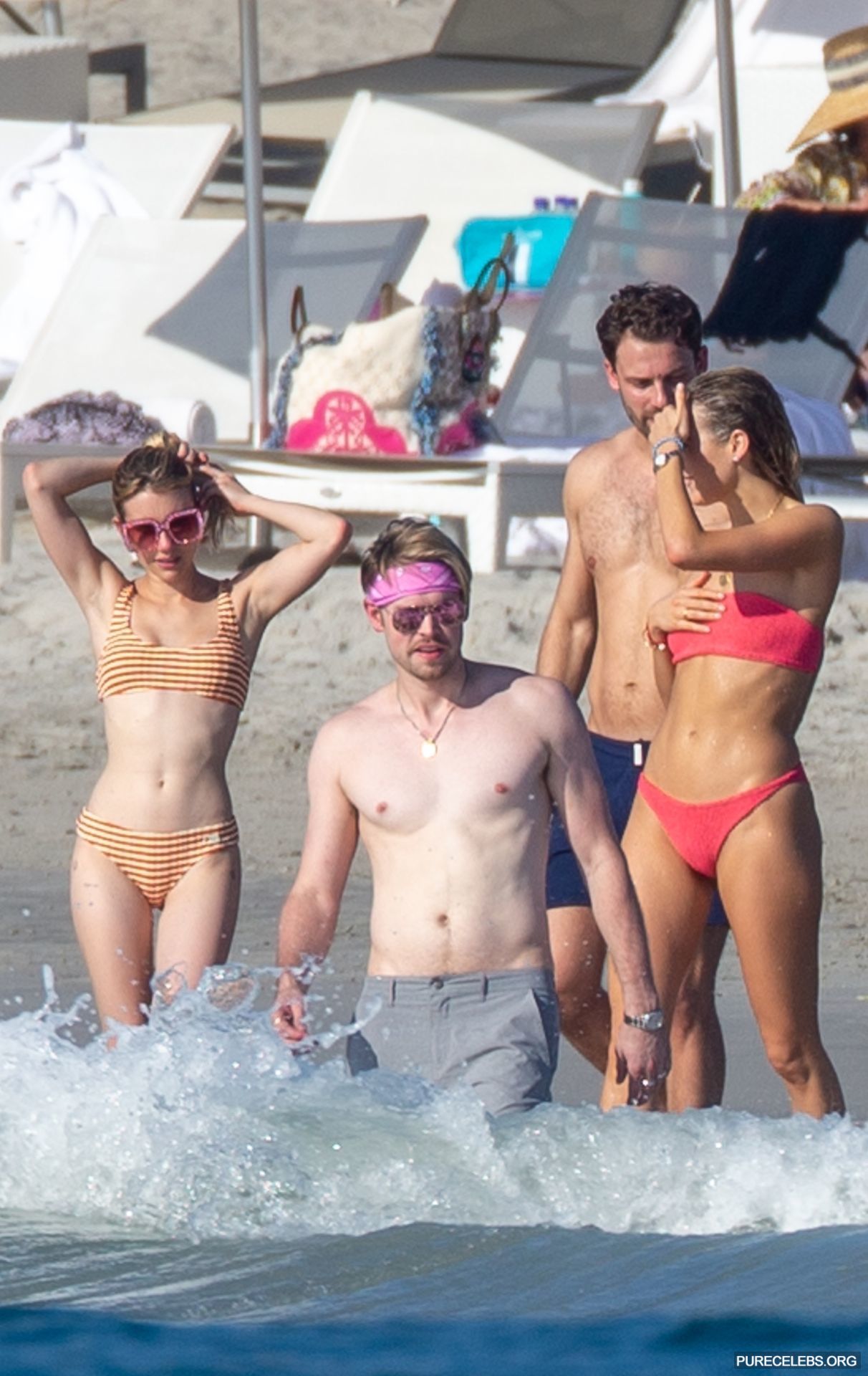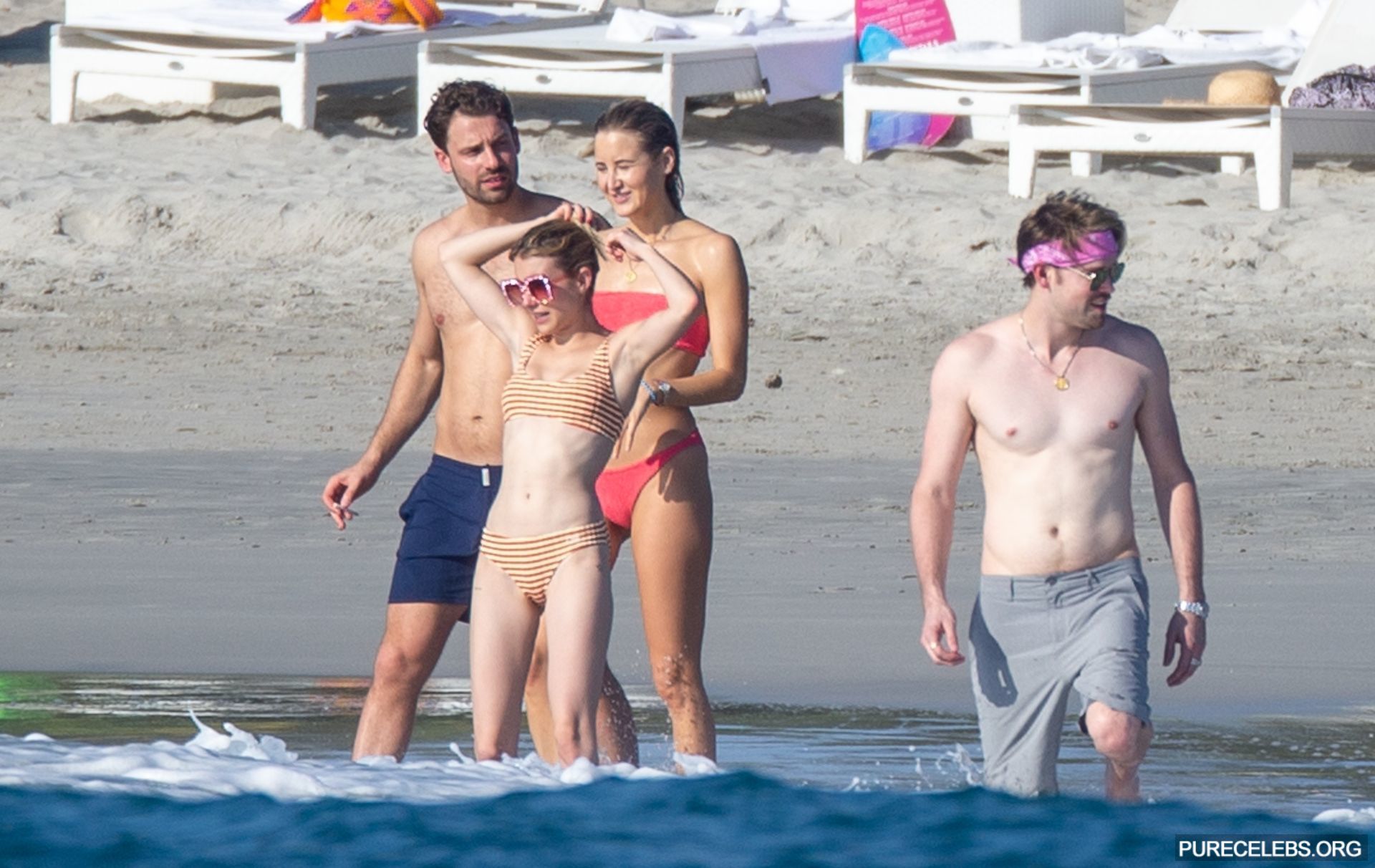 Paparazzi decided to pamper us with hot but not nude photos of Emma Roberts. This American singer looked very seductive, appearing on the beach in a striped bikini. It was impossible to look away from her slender figure. Her petite boobs in a tight-fitting bra were very sexy. And her thin waist combined with slim hips was breathtaking!