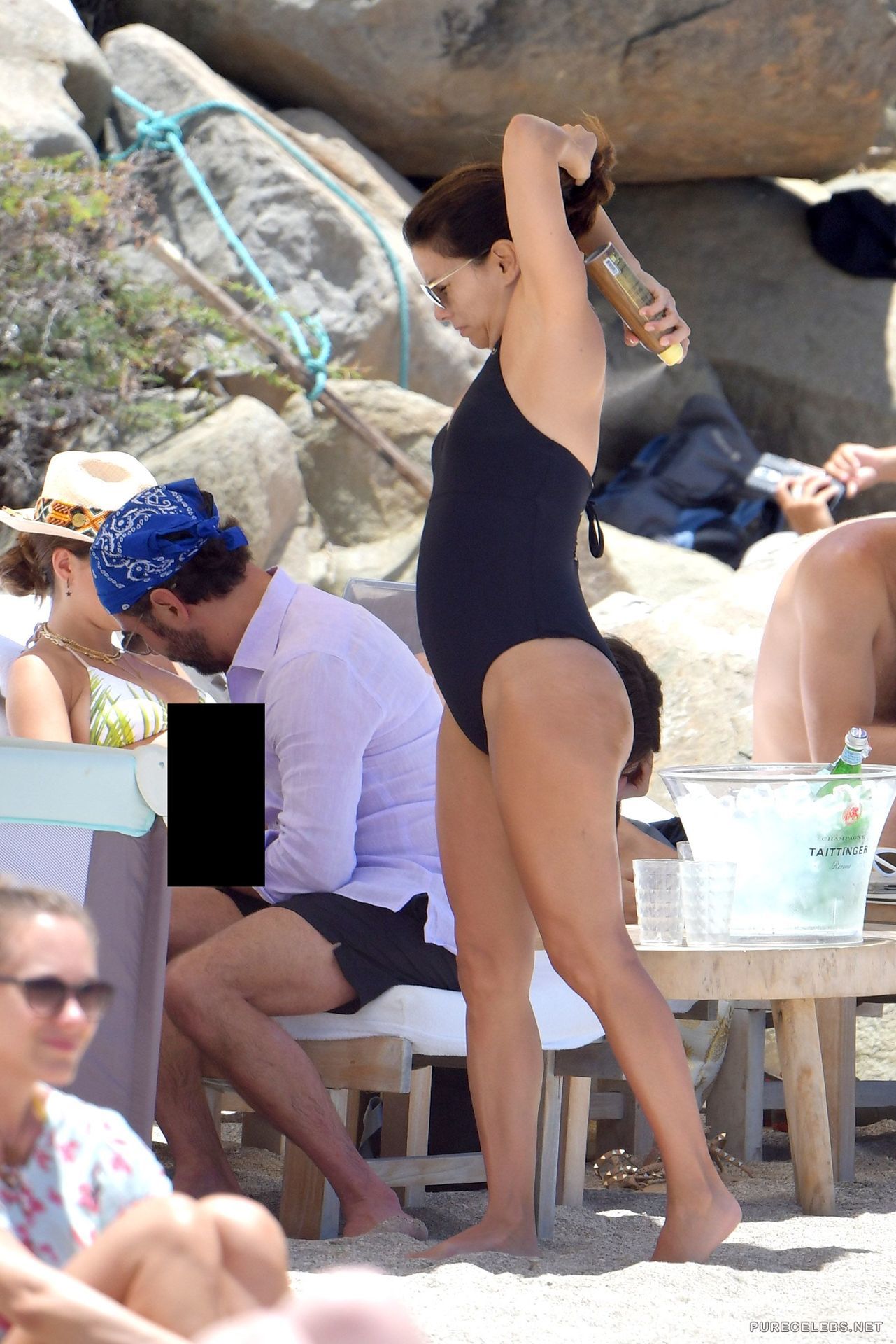 Charming Eva Longoria was photographed by the paparazzi while resting on the beach. The star wore a tight black swimsuit that beautifully accentuated the curves of her body. A swimsuit beautifully emphasized her wonderful tits and gorgeous hips. Also, a celebrity stabbed her long hair and wore black sunglasses to make her look even more sexuality. This hot beauty exactly will drive you crazy!