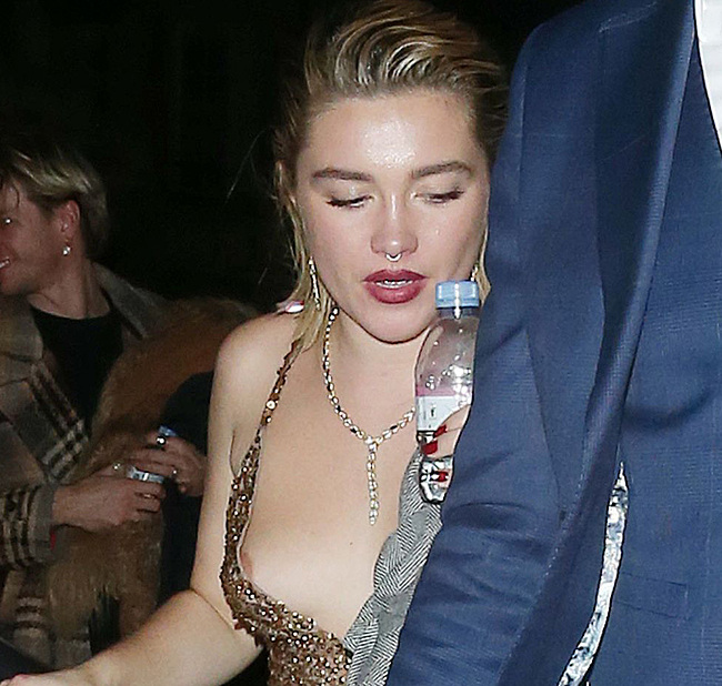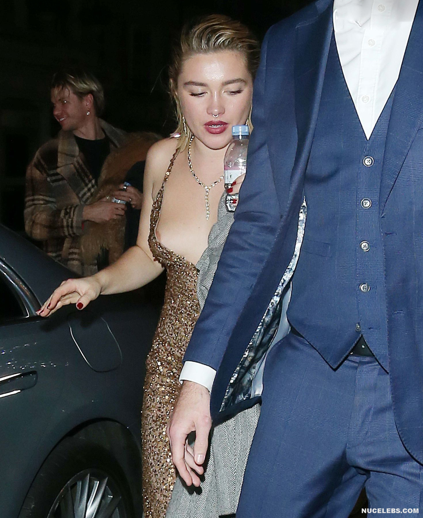 The paparazzi managed to photograph Florence Pugh nude boobs! So, this 27-year-old celebrity in a golden glittery dress was spotted at one of the events. And as you can see, the dress had a very low neckline. So it was pretty predictable that Florence Pugh’s nude boob with brown nipple would slip out of him at some point.