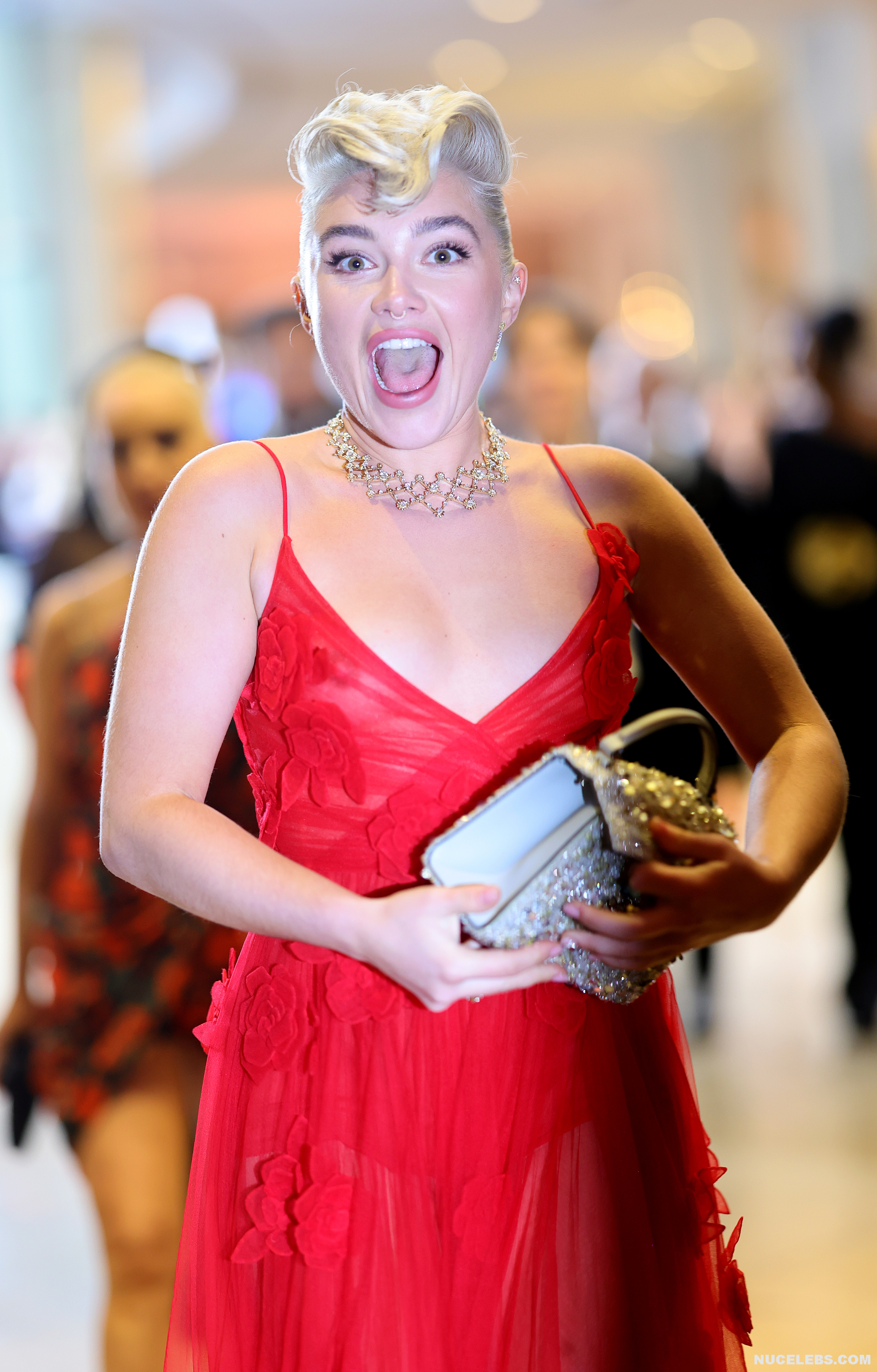 Florence Pugh flashed her nude boobies at the Golden Globe ceremony. This 28-year-old celebrity appeared there in a long red dress, decorated with rose embroidery. This time, this British actress was braless, which opened up great opportunities for the audience. After all, the transparent chiffon fabric did not hide Florence Pugh’s nude tits with brown nipples!
