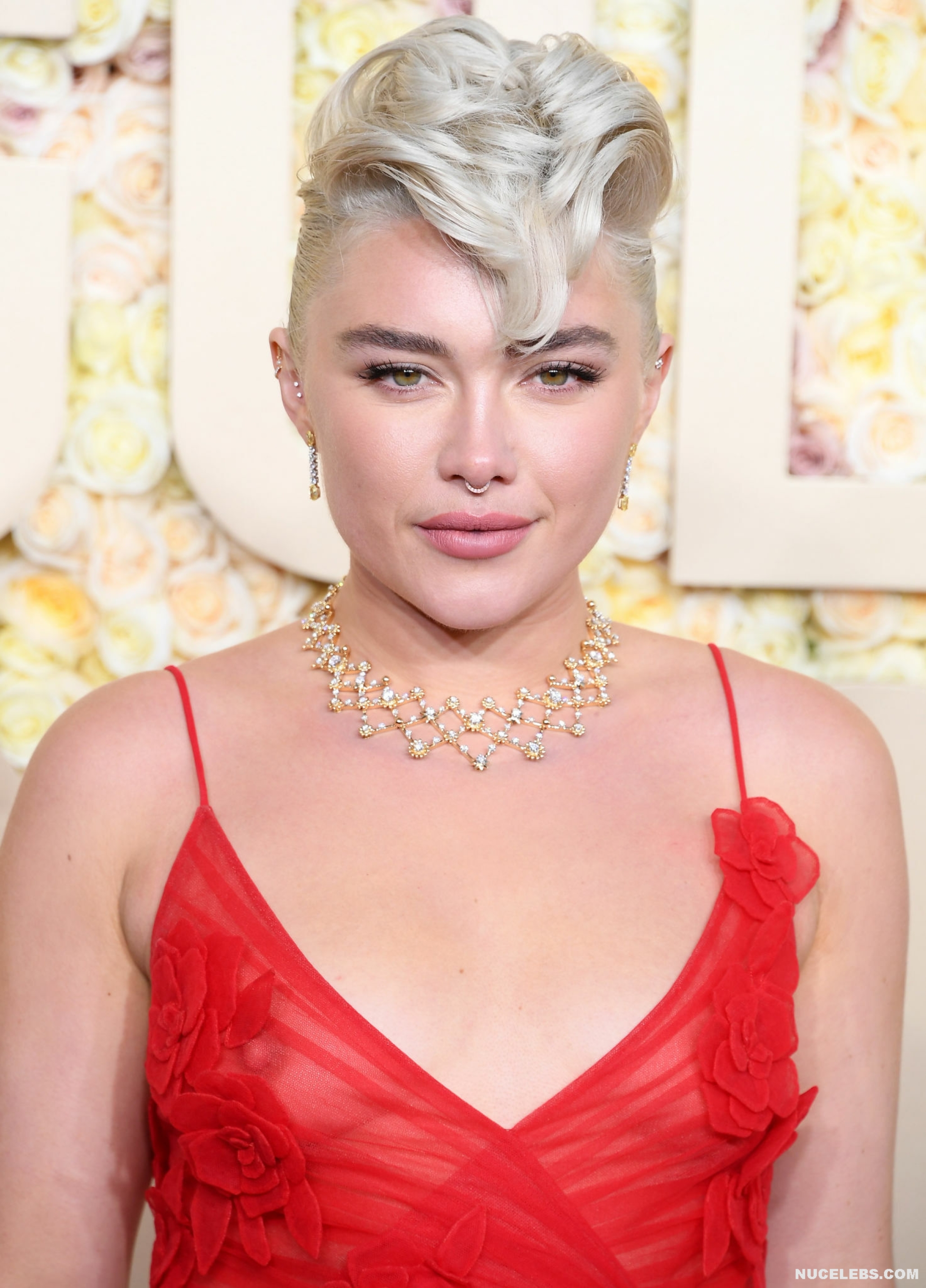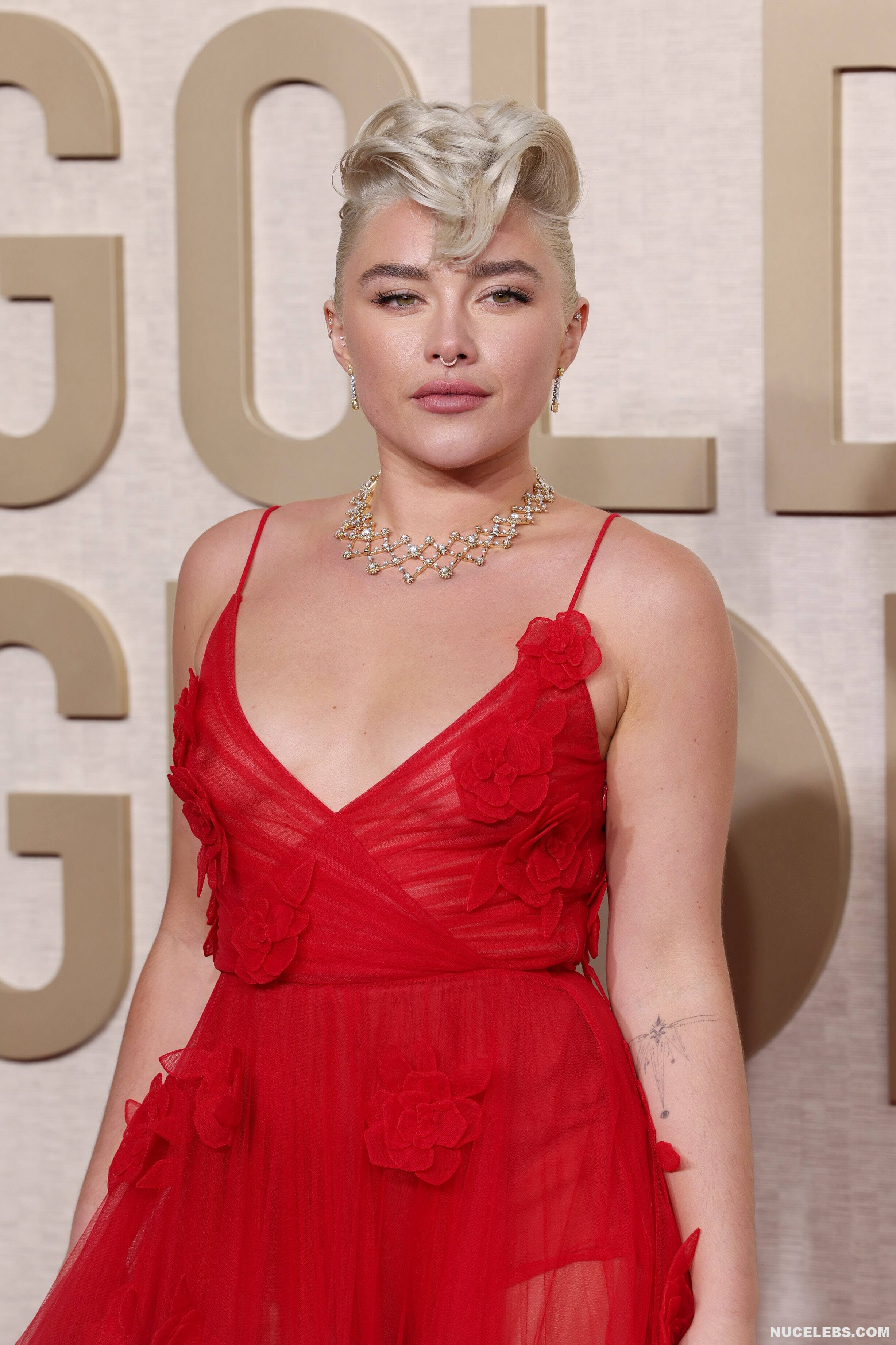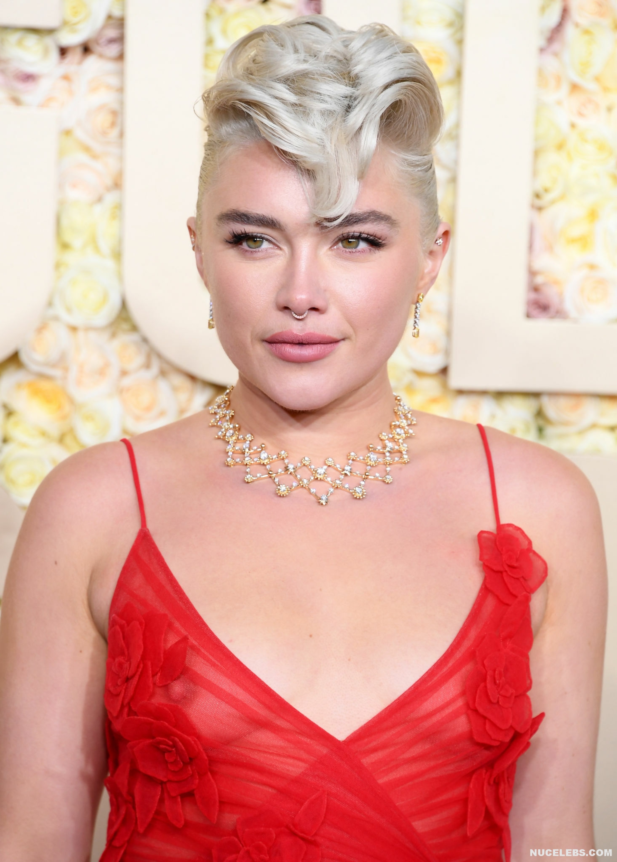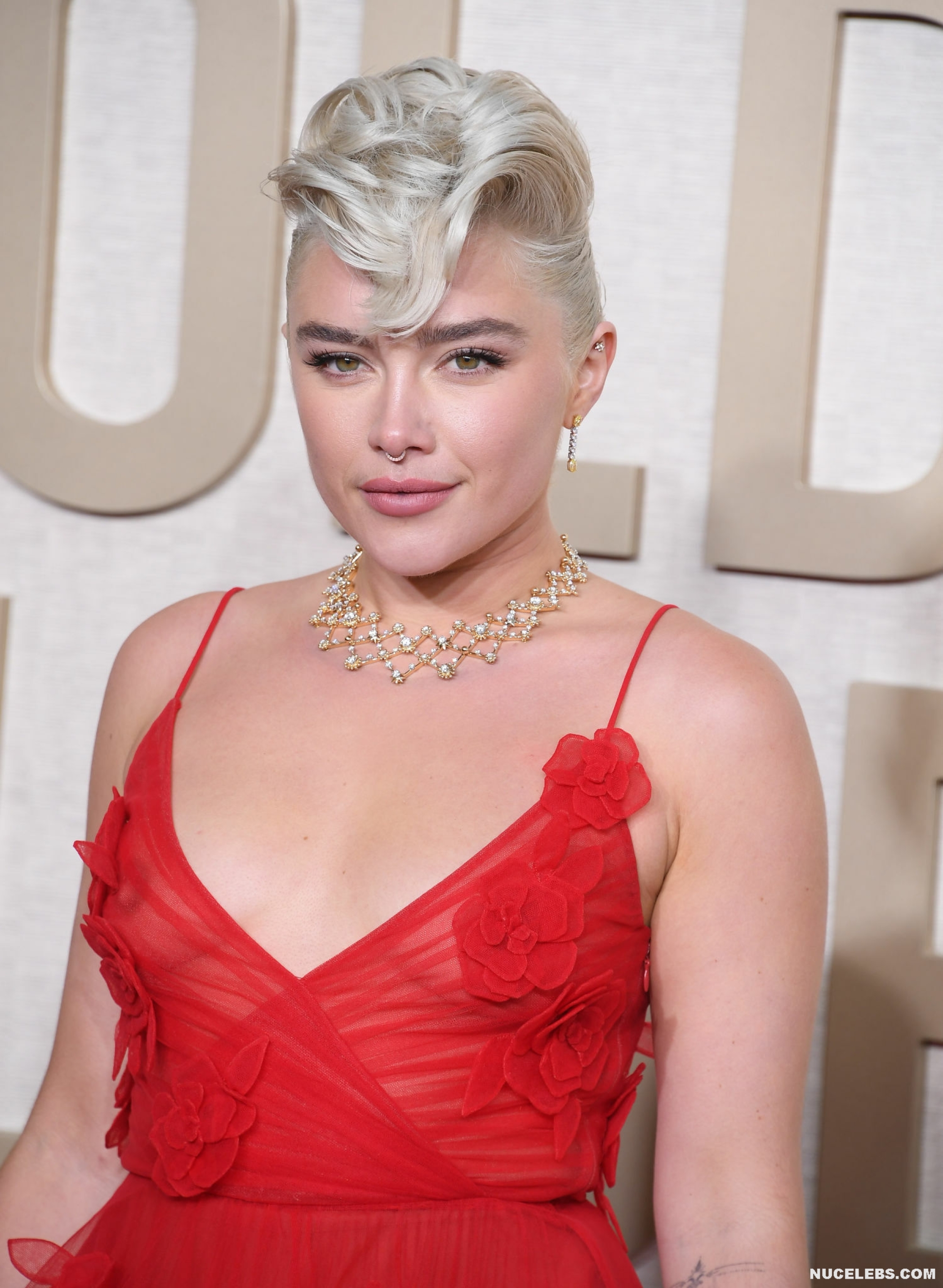 Florence Pugh flashed her nude boobies at the Golden Globe ceremony. This 28-year-old celebrity appeared there in a long red dress, decorated with rose embroidery. This time, this British actress was braless, which opened up great opportunities for the audience. After all, the transparent chiffon fabric did not hide Florence Pugh’s nude tits with brown nipples!