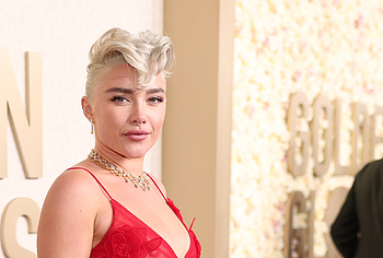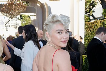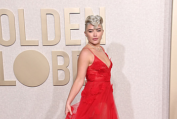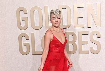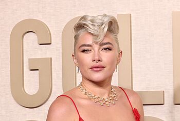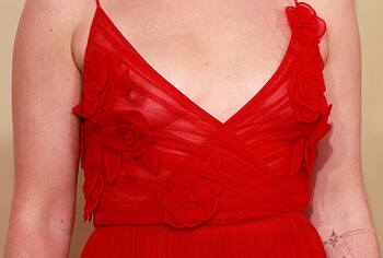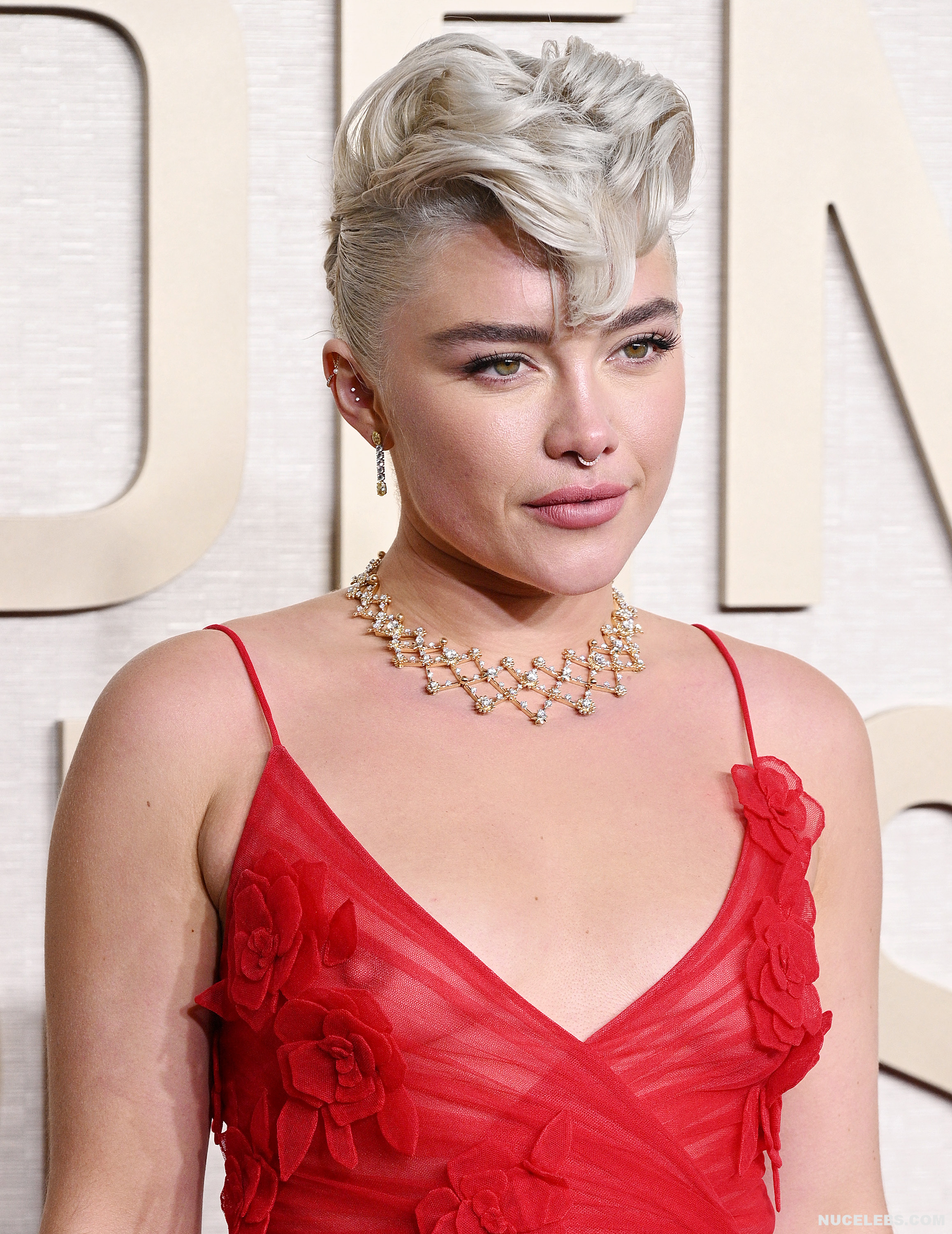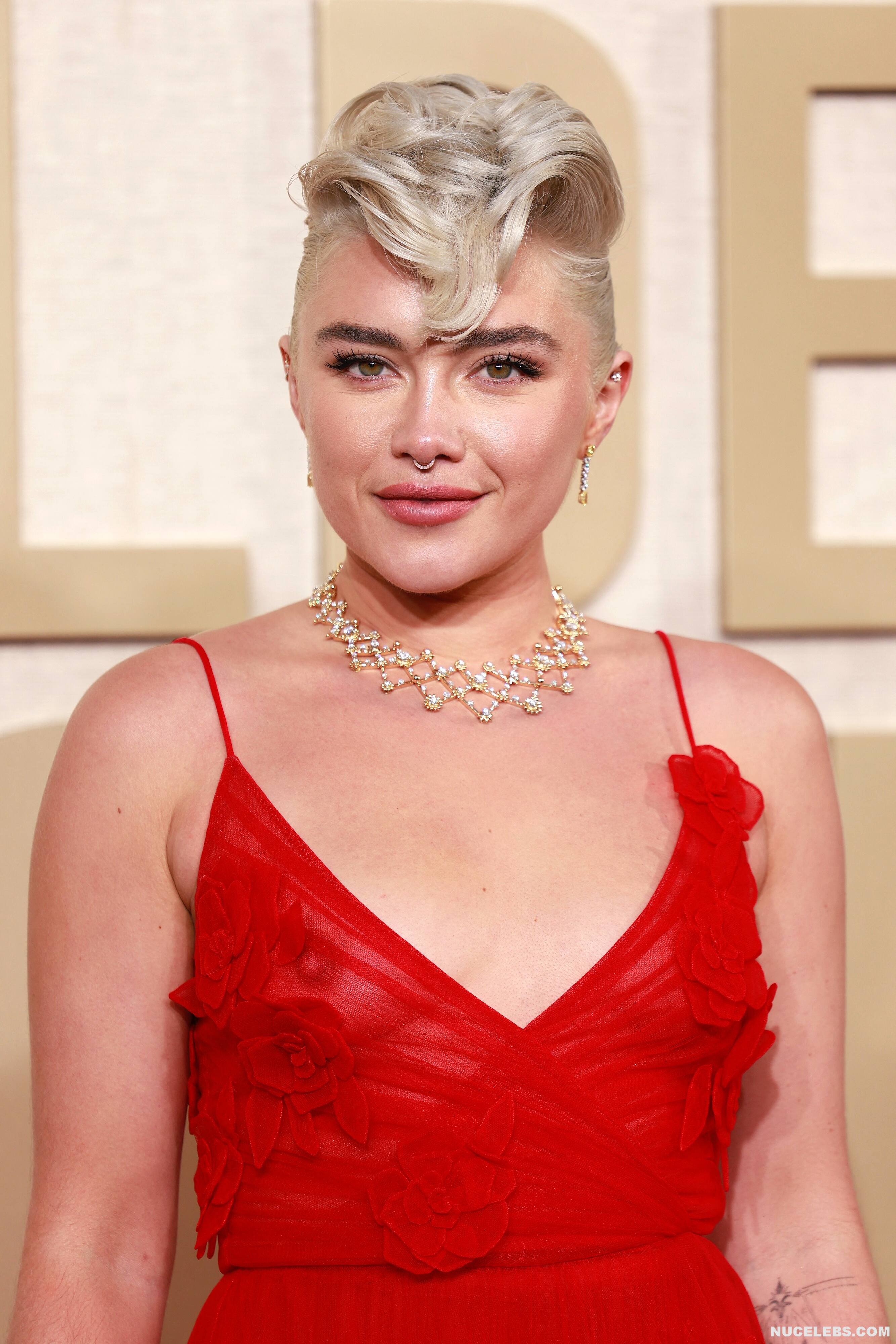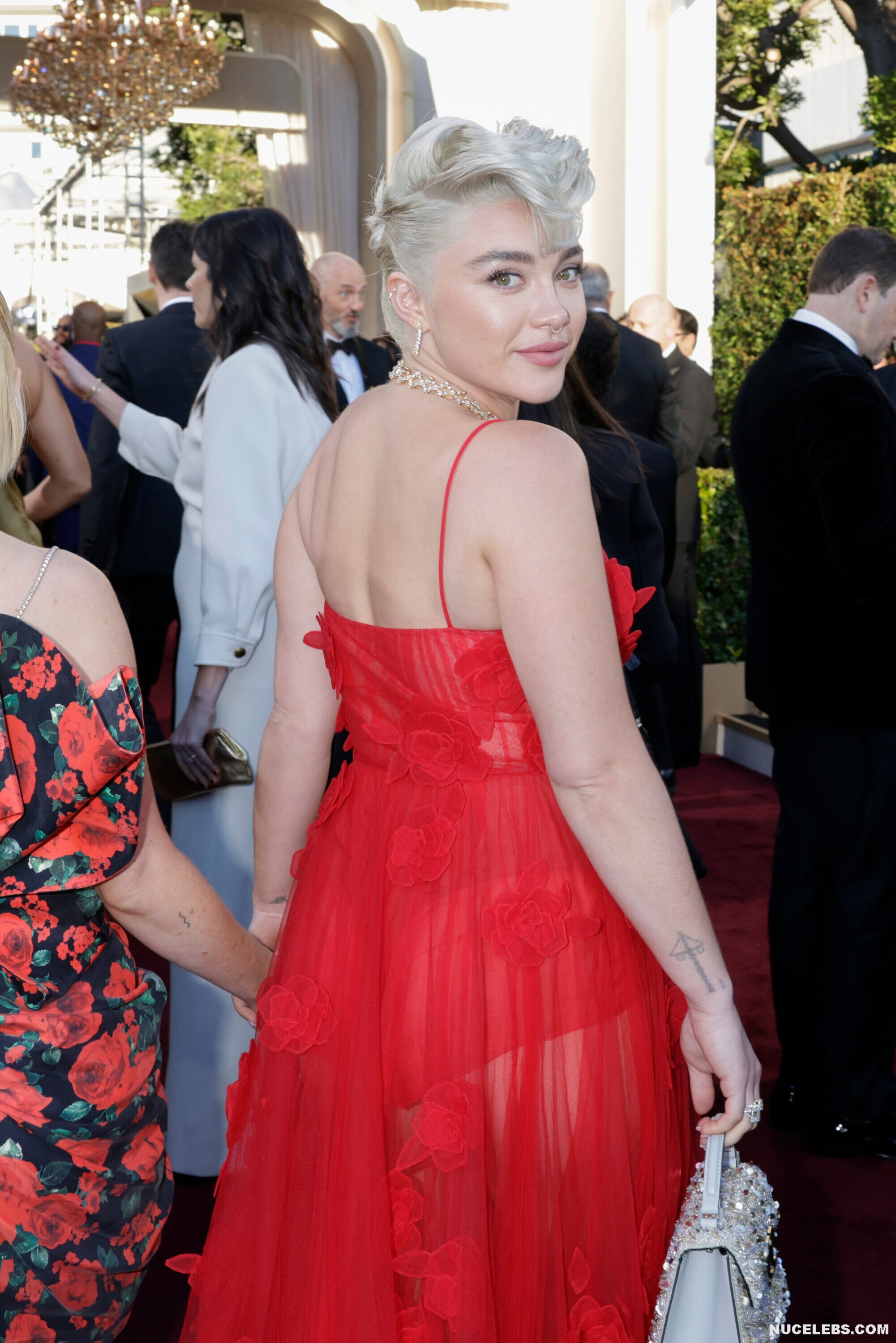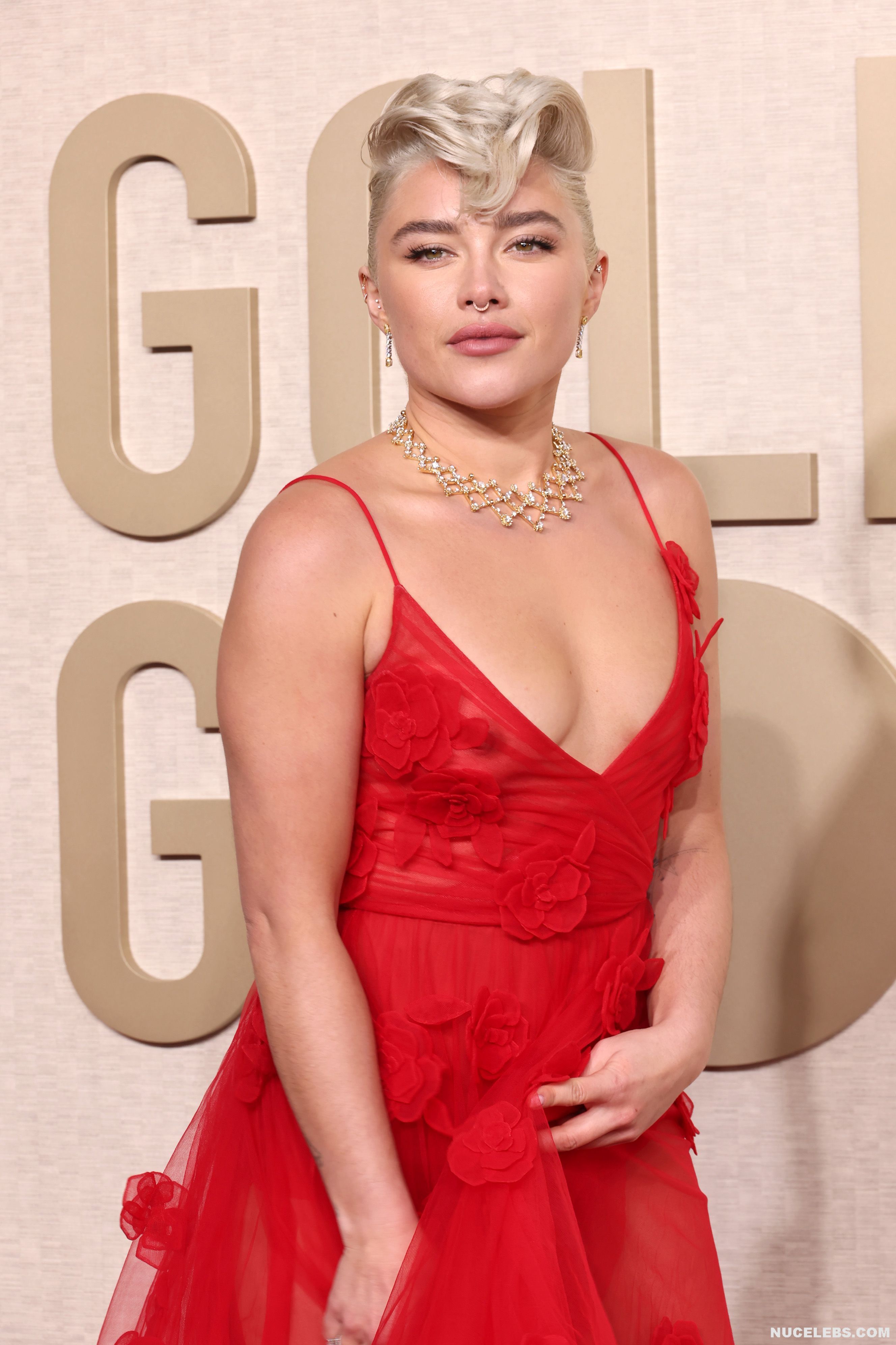 Florence Pugh flashed her nude boobies at the Golden Globe ceremony. This 28-year-old celebrity appeared there in a long red dress, decorated with rose embroidery. This time, this British actress was braless, which opened up great opportunities for the audience. After all, the transparent chiffon fabric did not hide Florence Pugh’s nude tits with brown nipples!