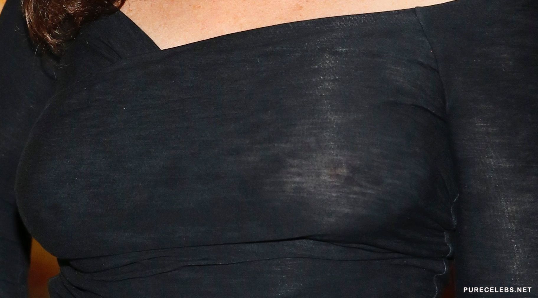 Hit TV show The Nanny made Fran Drescher one of the most popular actresses in the ’90s. Now she is less famous and double her size. This actress was photographed in a long black dress which seemed to provide full coverage, until the camera flashes came on. The bright lights revealed her saggy plump tits and big round nipples. This mature babe is still able to arouse men with her good looks.