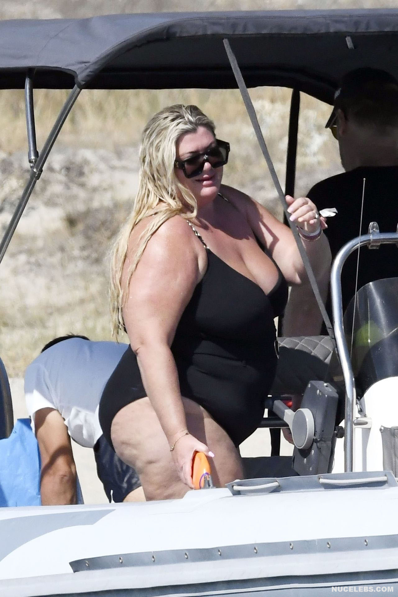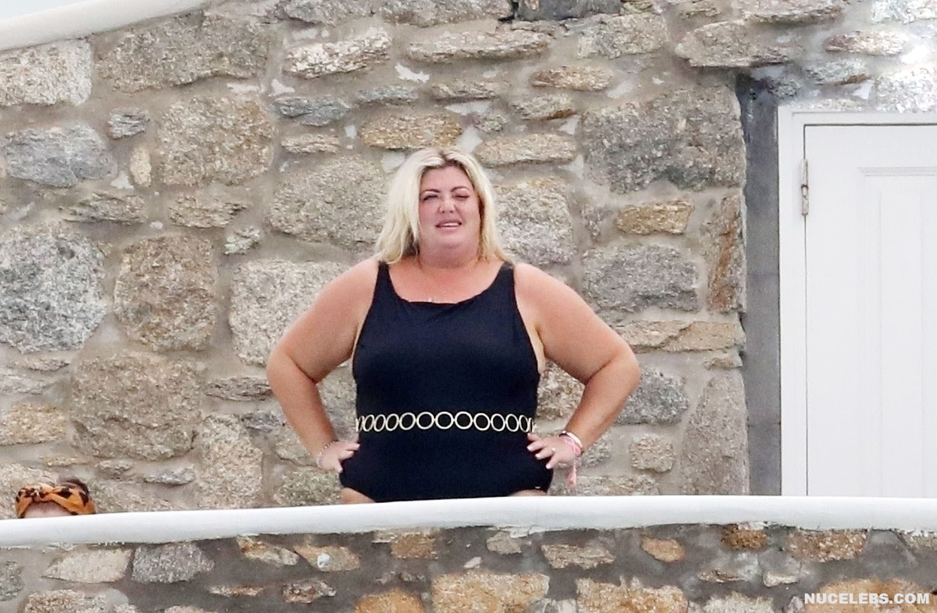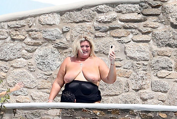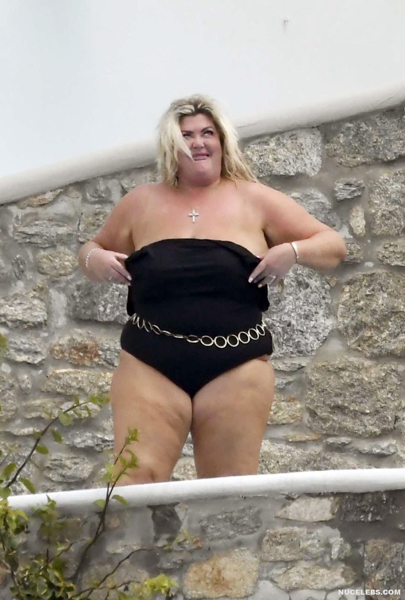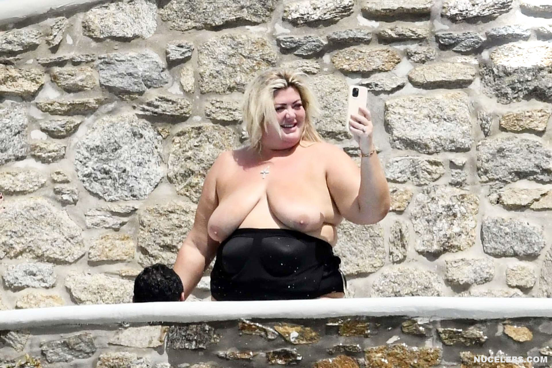 Gemma Collins didn’t hesitate to show off her nude tits on the beach. There, this English media personality no doubt took off her black swimsuit to appear topless in front of everyone. Well, it’s worth noting that Gemma Collins really has something to brag about, because her boobs are just huge! This blonde was smiling sweetly and seemed to be taking a selfie with her phone.