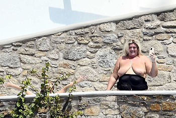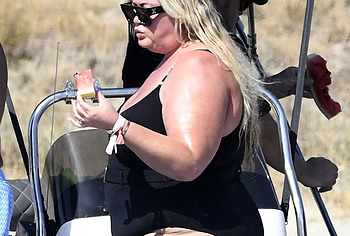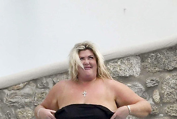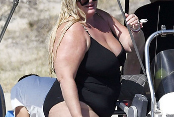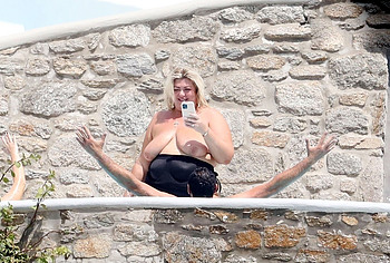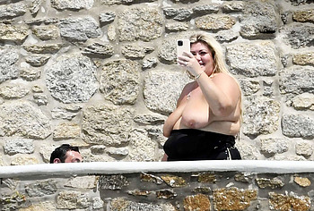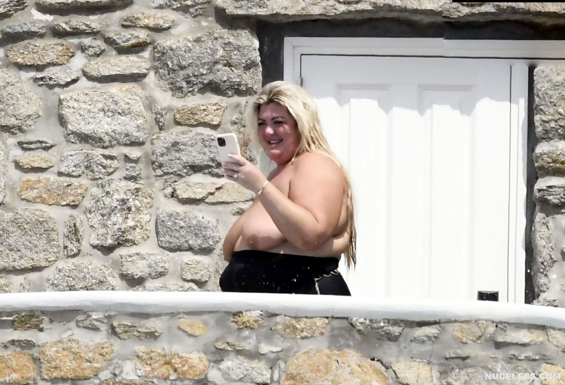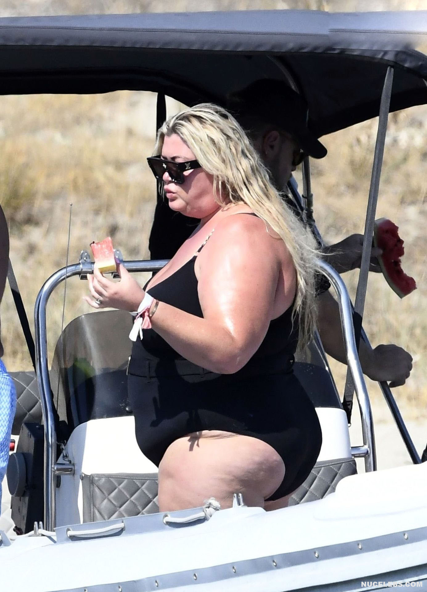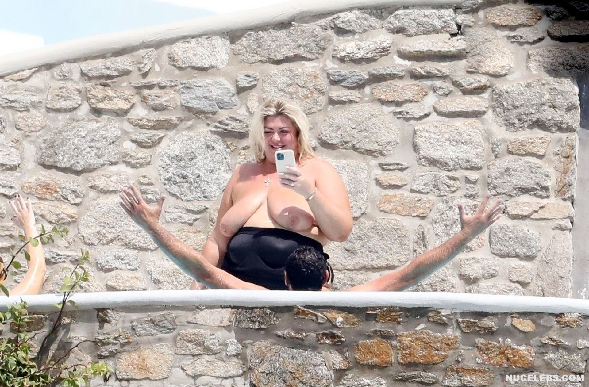Gemma Collins didn’t hesitate to show off her nude tits on the beach. There, this English media personality no doubt took off her black swimsuit to appear topless in front of everyone. Well, it’s worth noting that Gemma Collins really has something to brag about, because her boobs are just huge! This blonde was smiling sweetly and seemed to be taking a selfie with her phone.