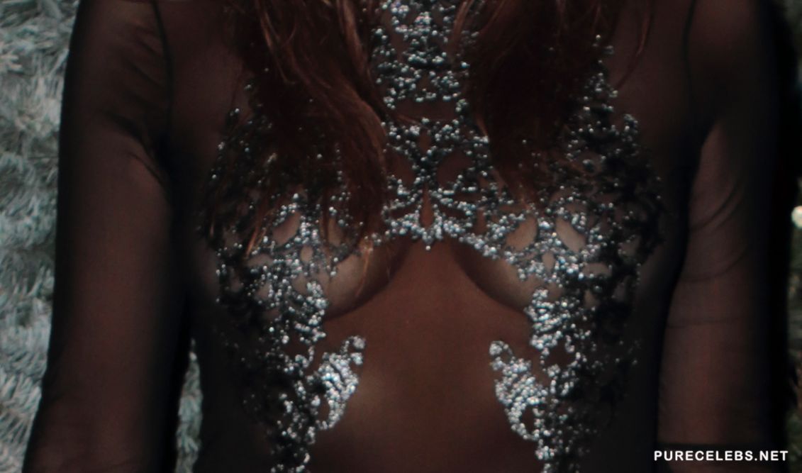 Geo Rushby looked sexy in a black, see through blouse with silver decorations, when she showed up for the New Year’s party and did not miss an opportunity to do some posing and to show off. This sultry brunette had a seductive attitude, kept on hugging a handsome guy who was obviously her date for the occasion and we like that there are even some close- ups of her boobs.