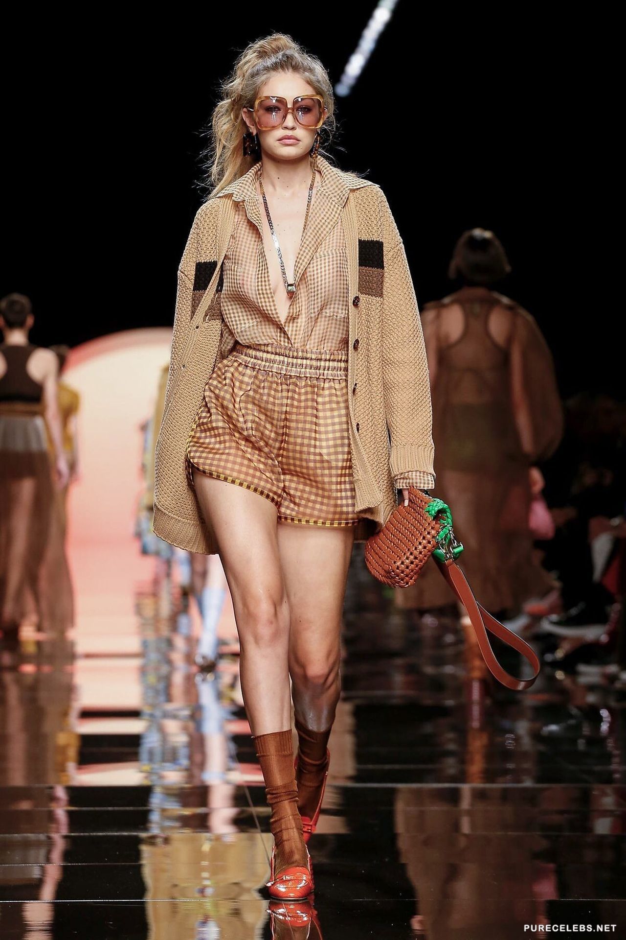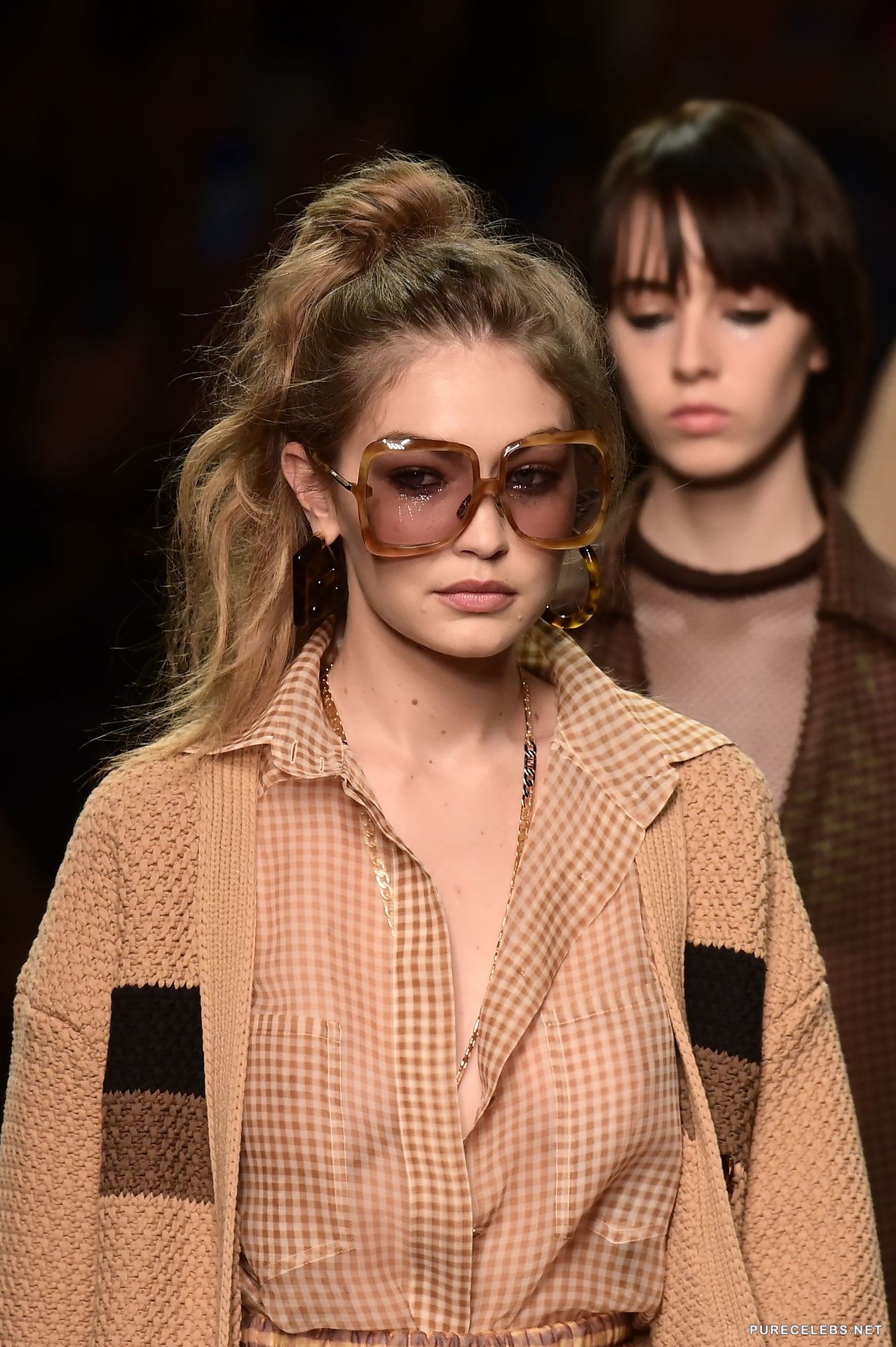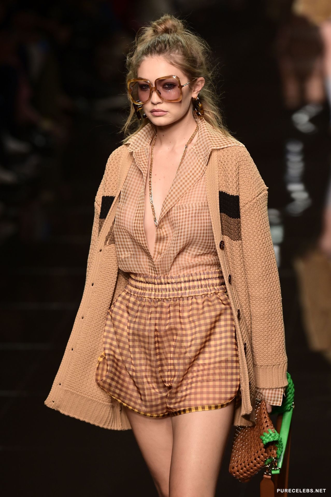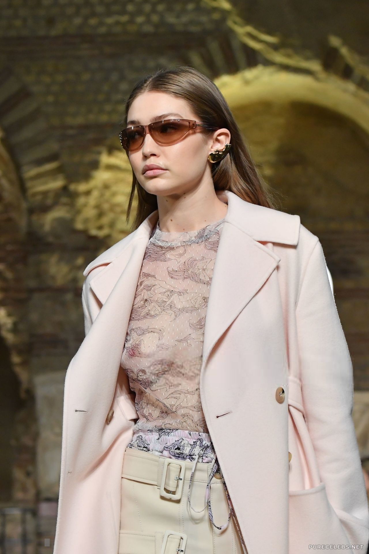 American supermodel Gigi Hadid often has to perform on the podium in very provocative outfits. During the last show, the hot beauty was dressed in white pants with ruffles below, a light golf and a light coat, and complemented her image with brown sunglasses. It is worth noting that the celebrity did not wear a bra and therefore you can clearly see her charming tits with small nipples through a translucent lace fabric.