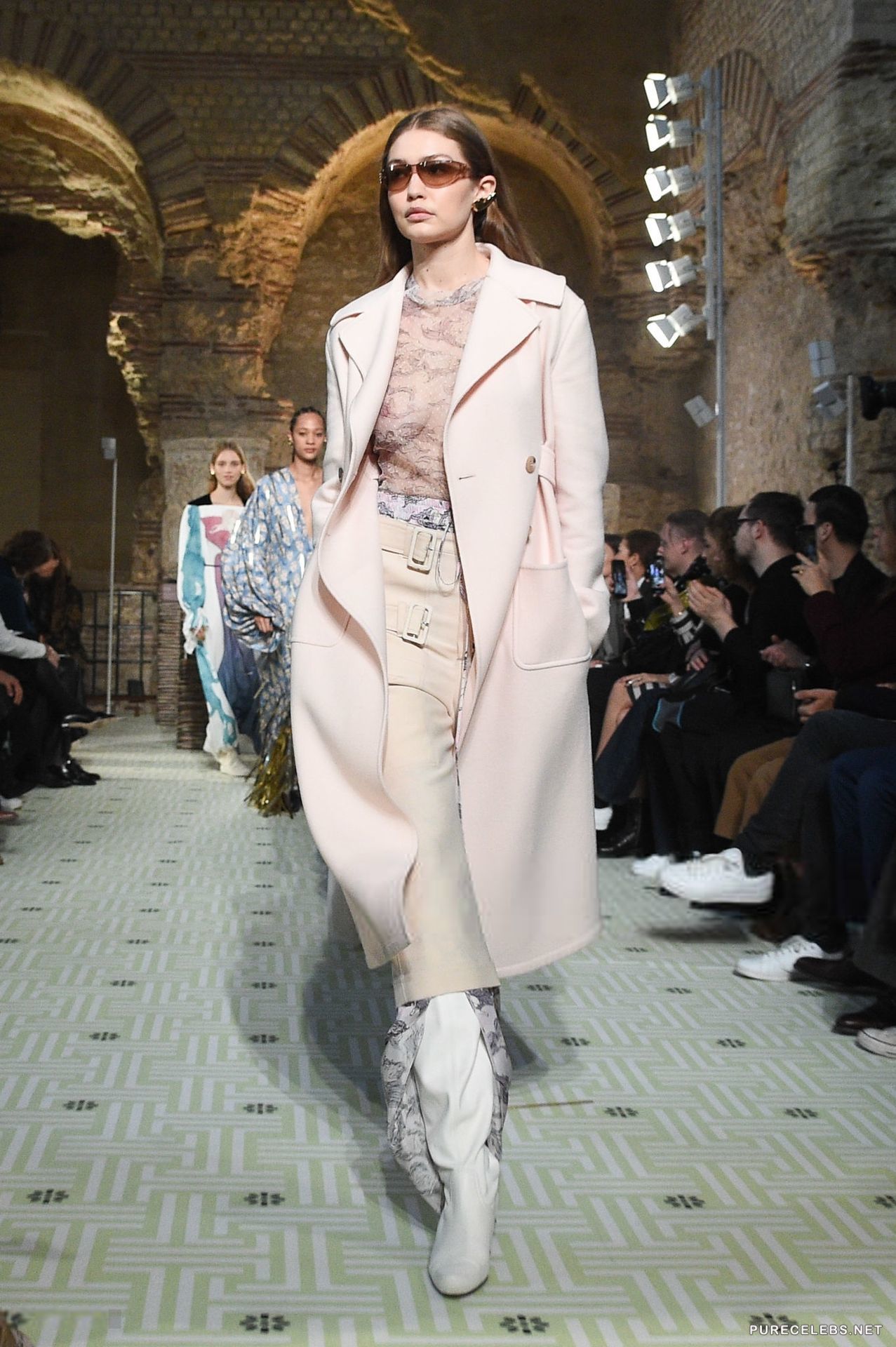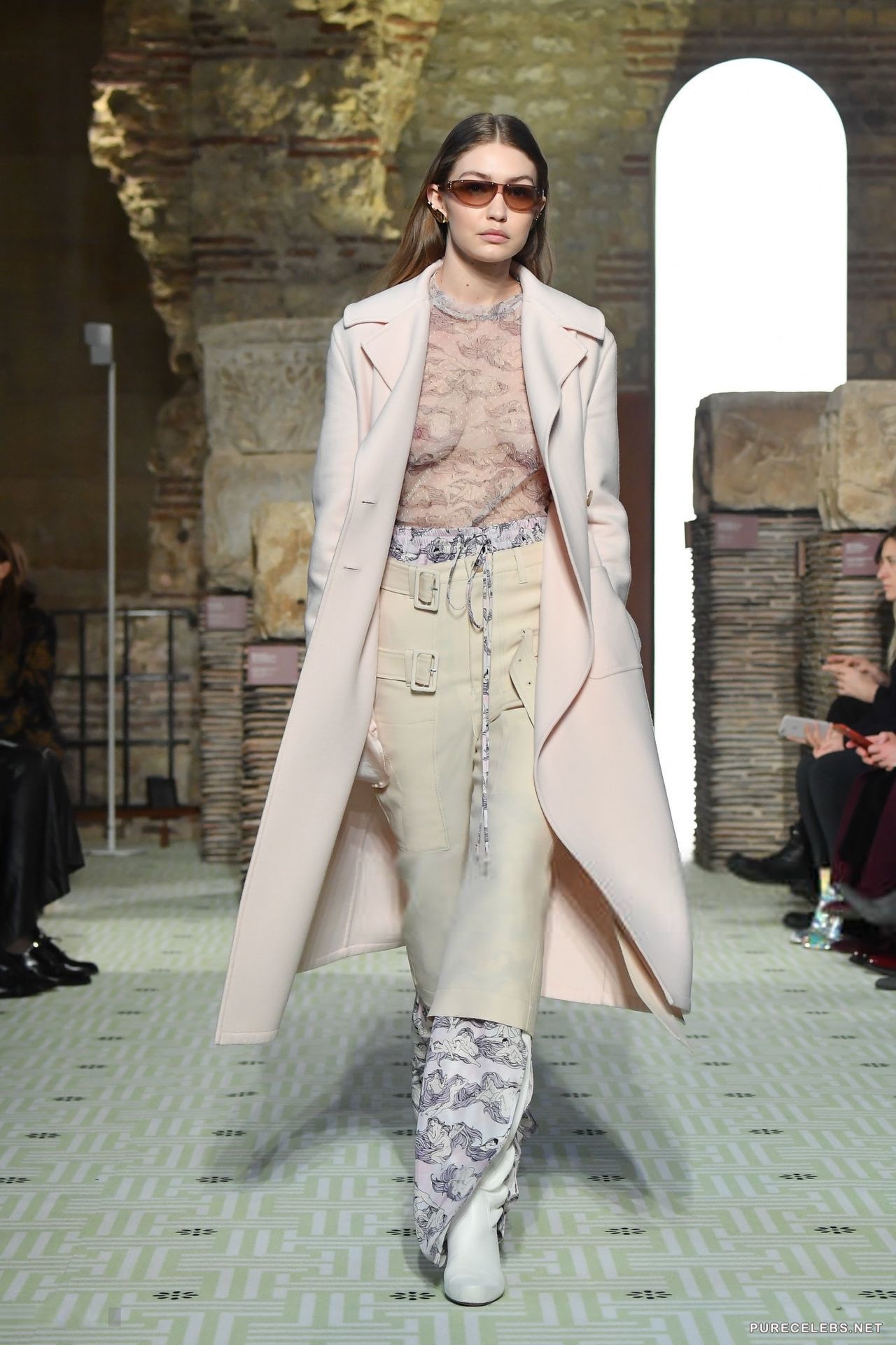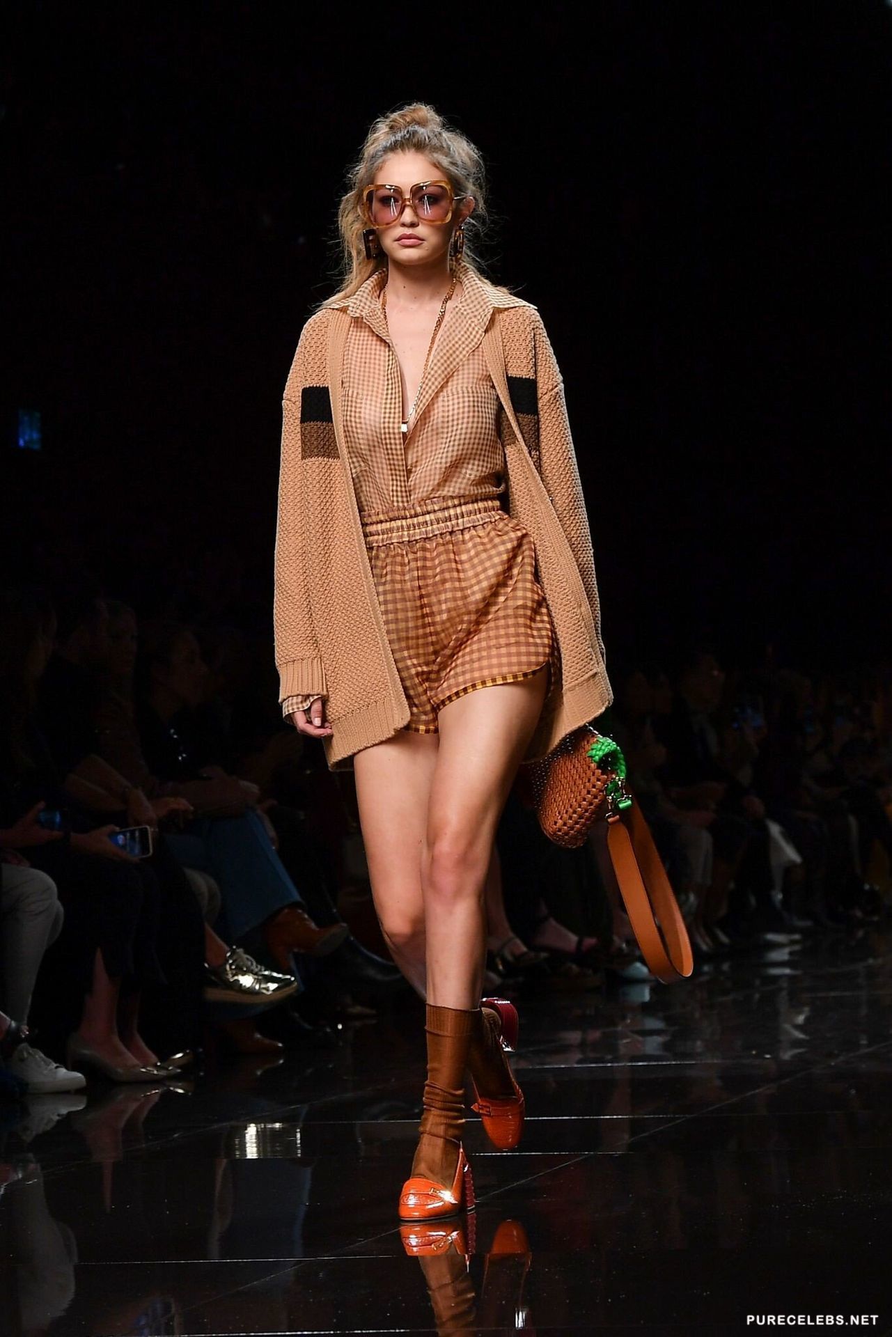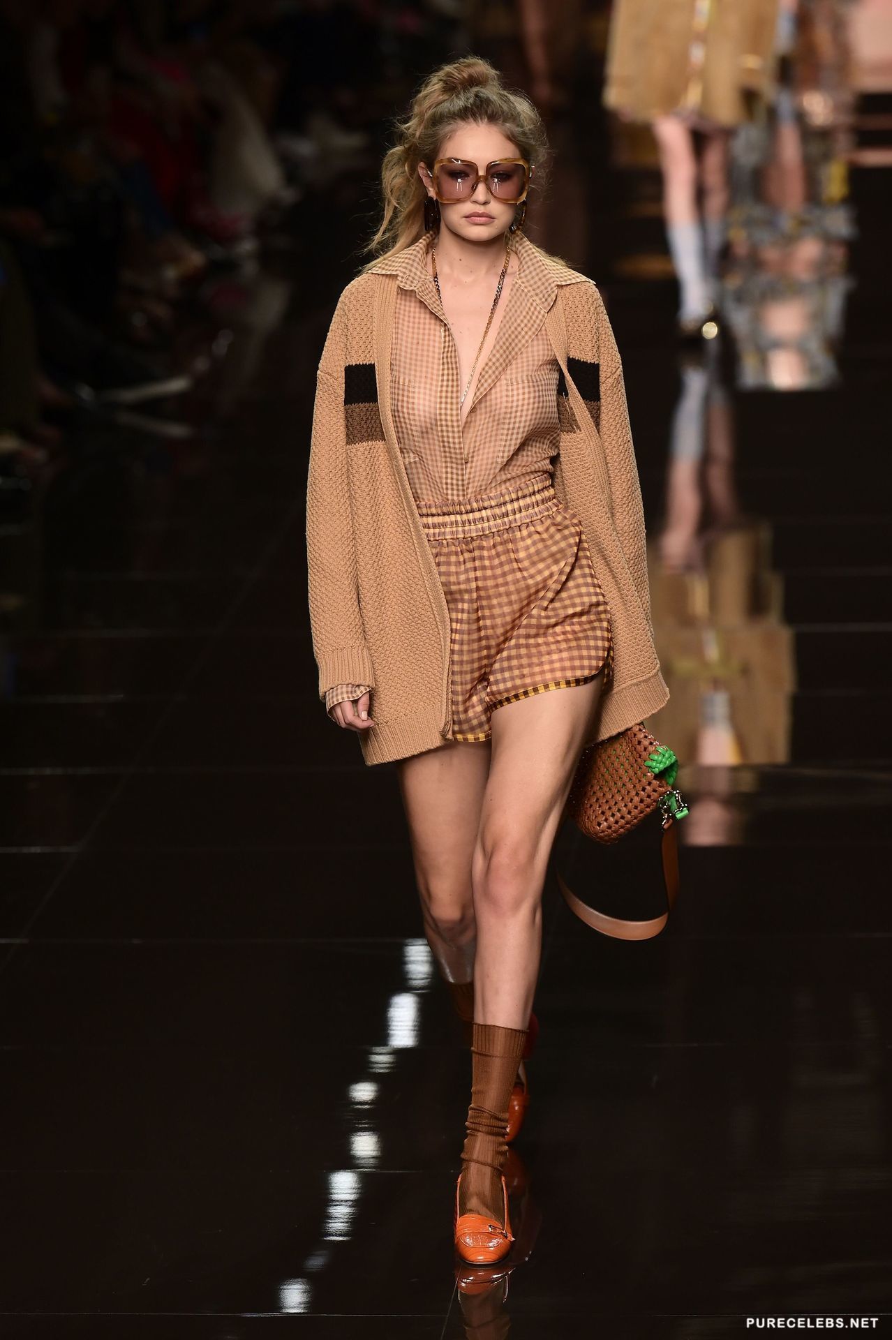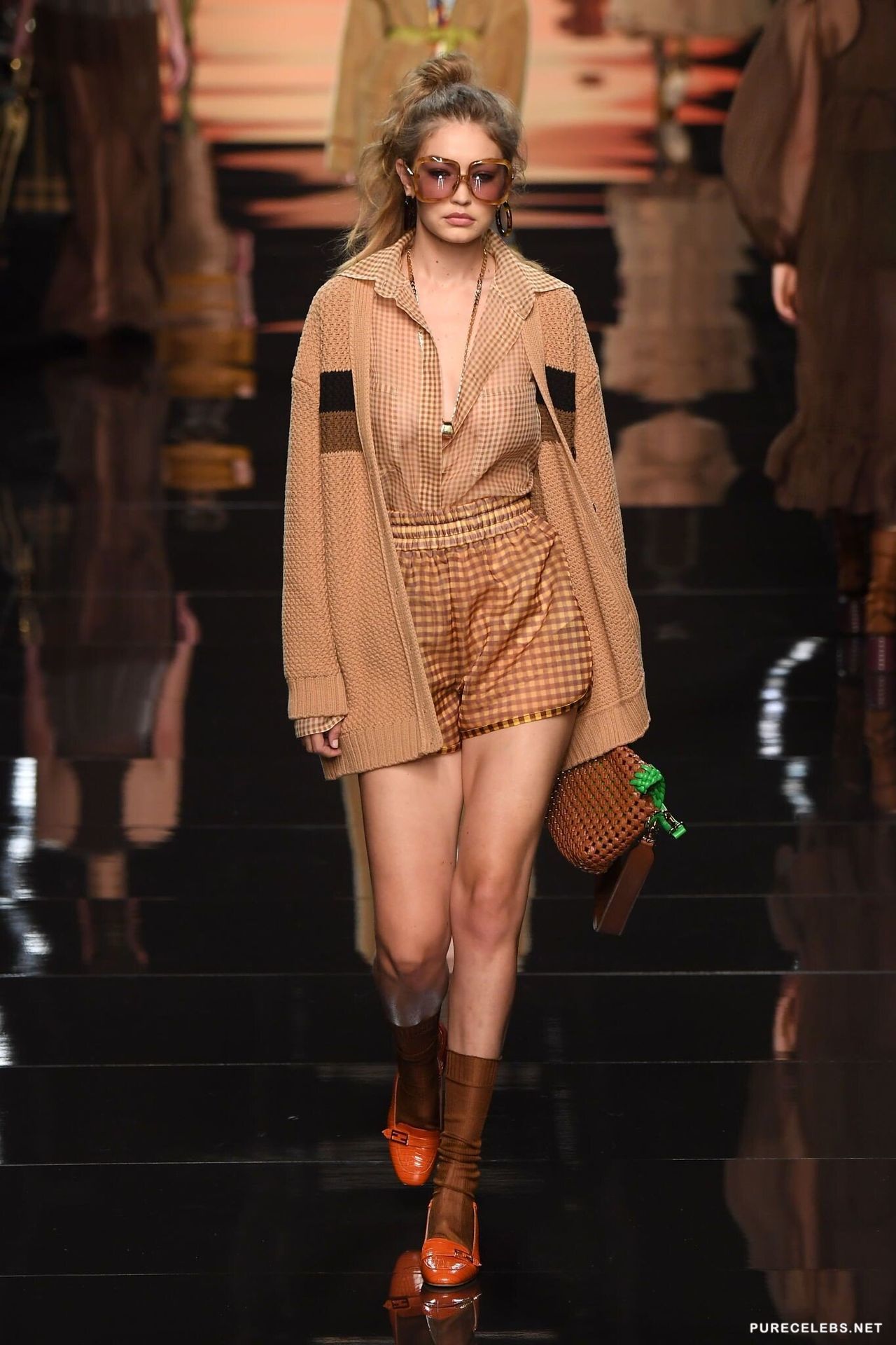 American supermodel Gigi Hadid often has to perform on the podium in very provocative outfits. During the last show, the hot beauty was dressed in white pants with ruffles below, a light golf and a light coat, and complemented her image with brown sunglasses. It is worth noting that the celebrity did not wear a bra and therefore you can clearly see her charming tits with small nipples through a translucent lace fabric.