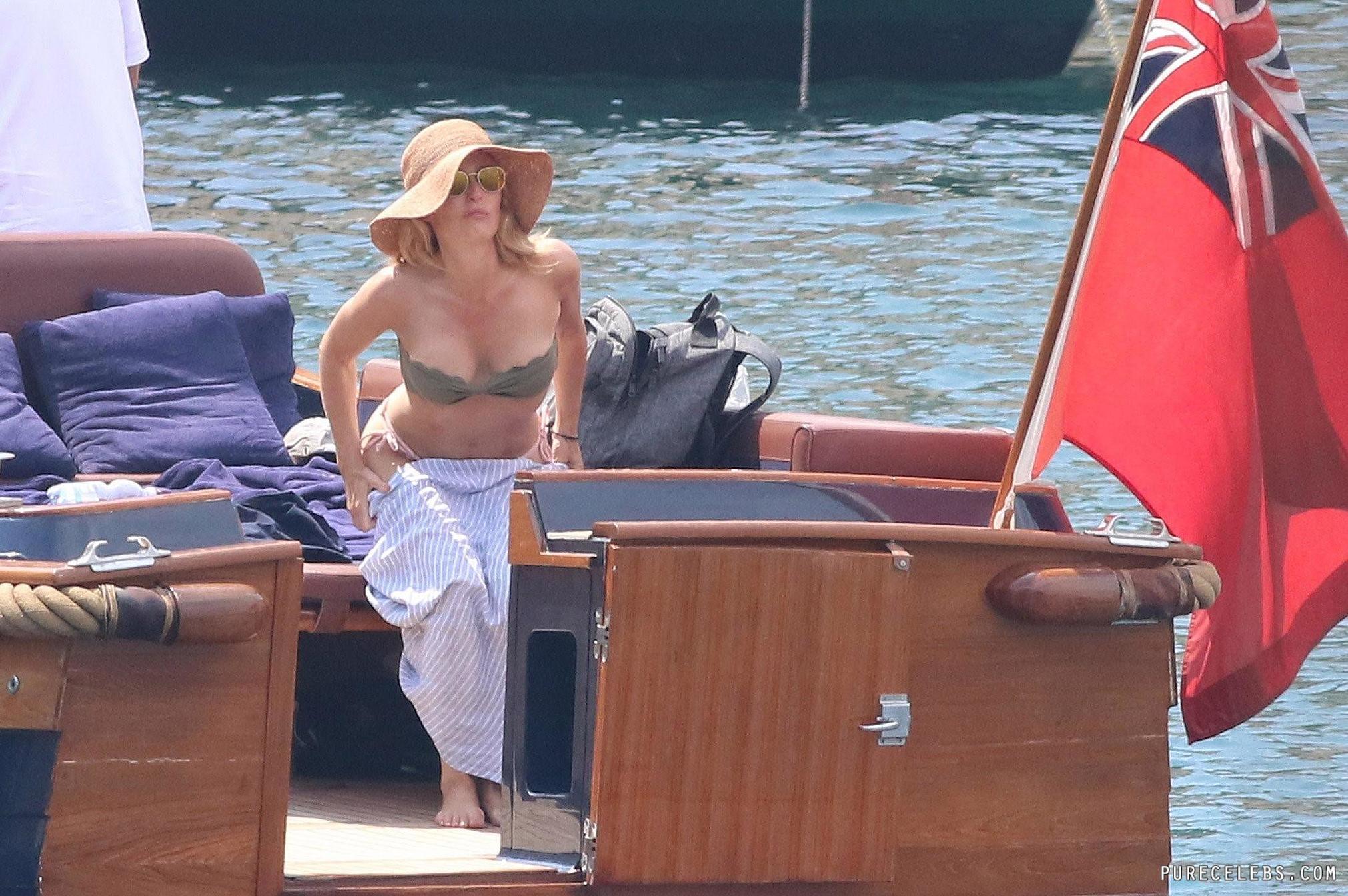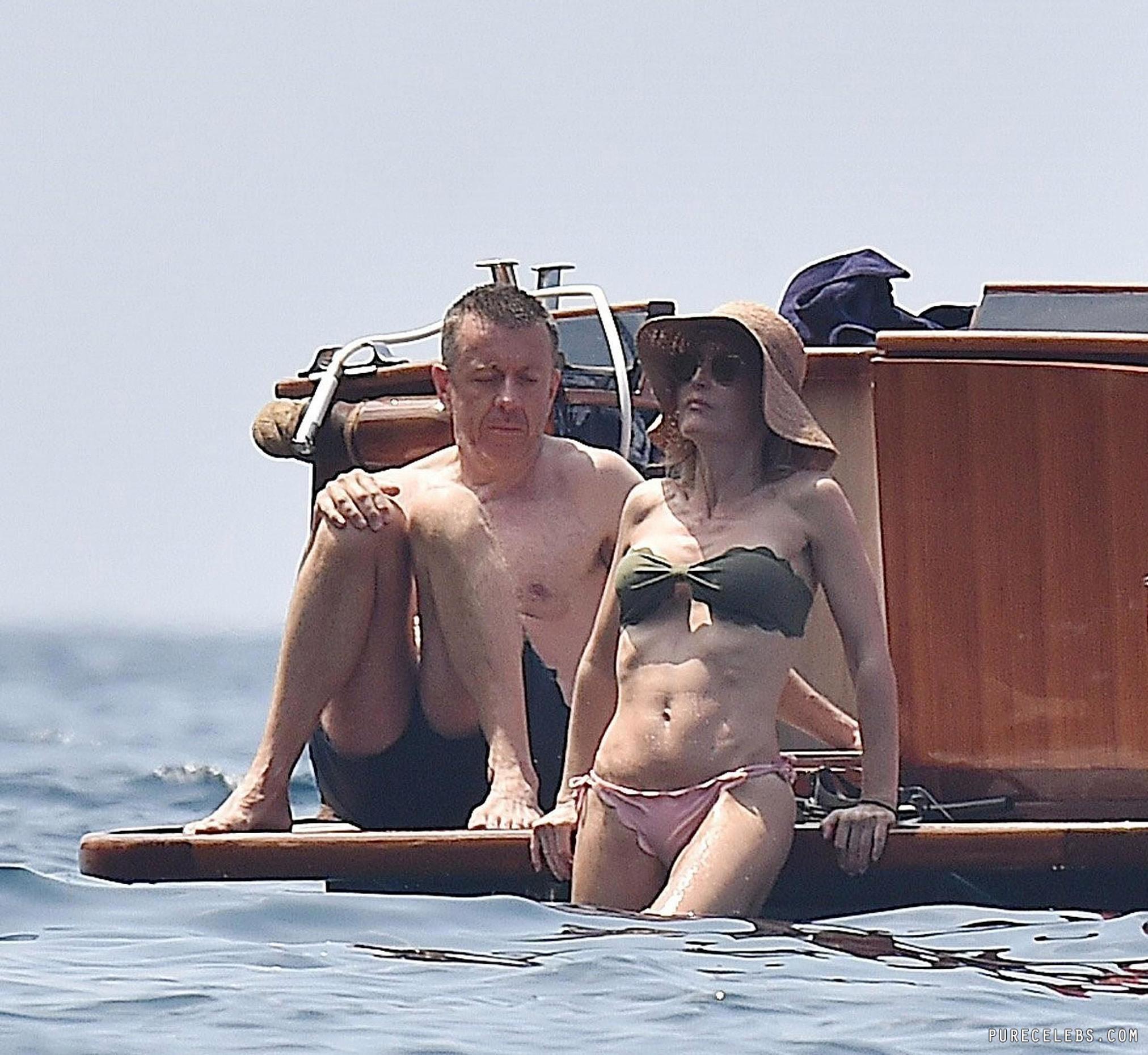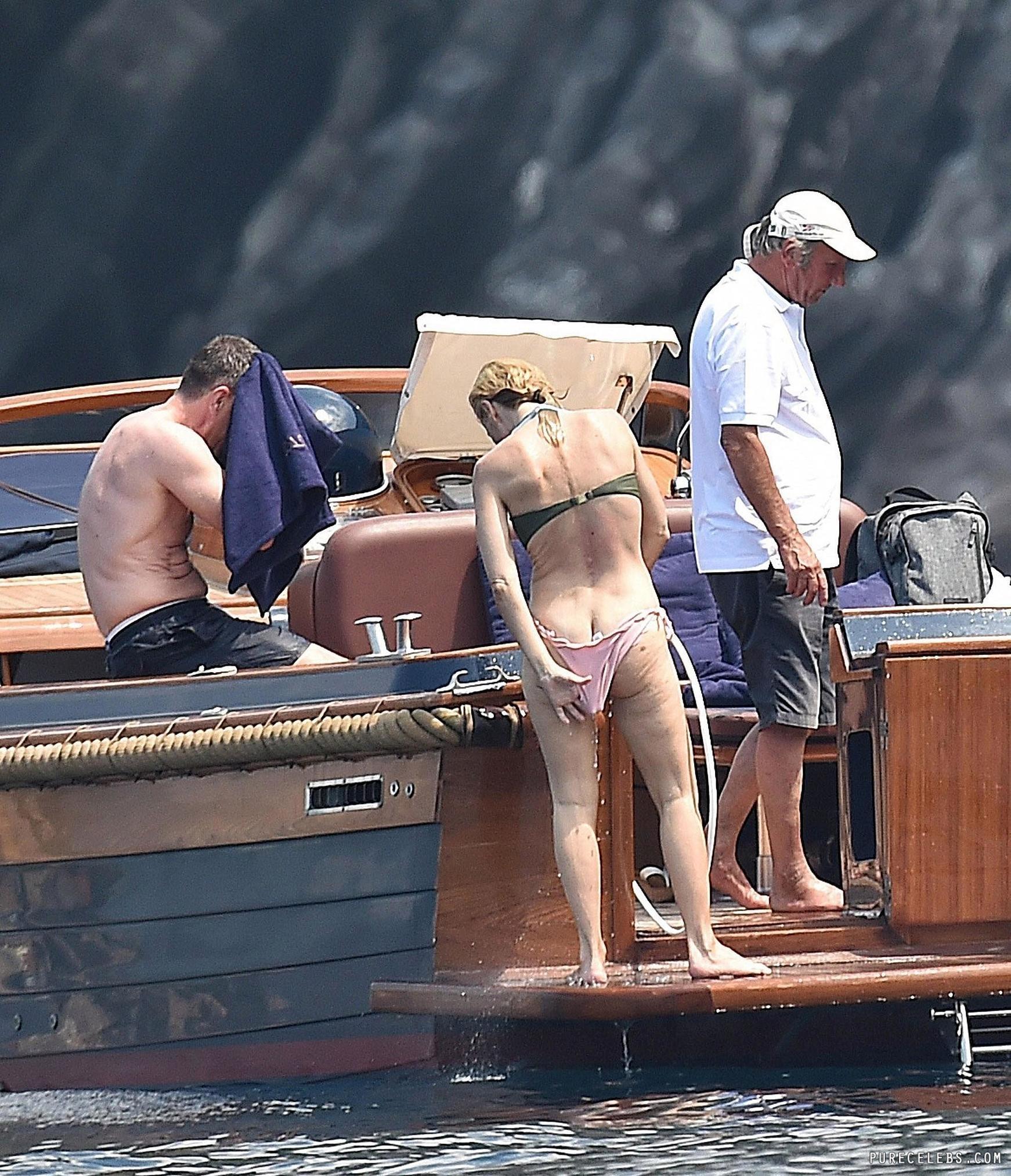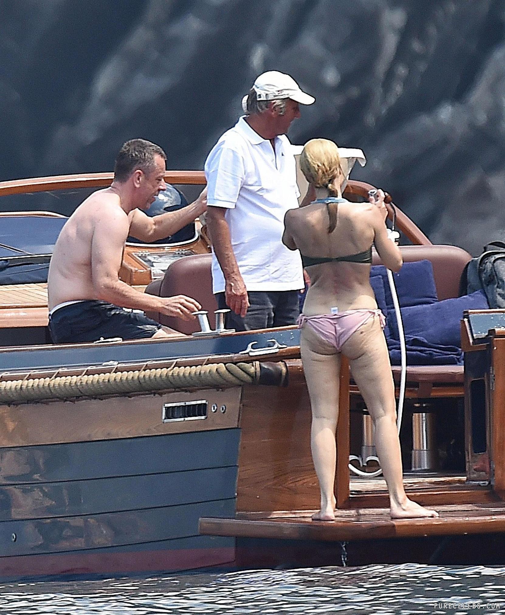 Gillian Anderson, star of the X-Files series, revealed her nude breasts and butt during her beach vacation. Paparazzi photographed the actress while she was standing on a boat and watering herself from the shower. The celebrity wanted to straighten her wet panties, but she overdid it a bit and everyone could see her naked booty. Also, the paparazzi managed to catch the moment when the nude boob of Gillian Anderson slipped out of her striped top.