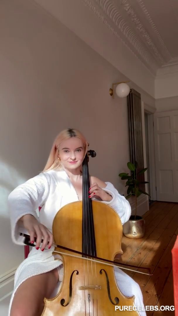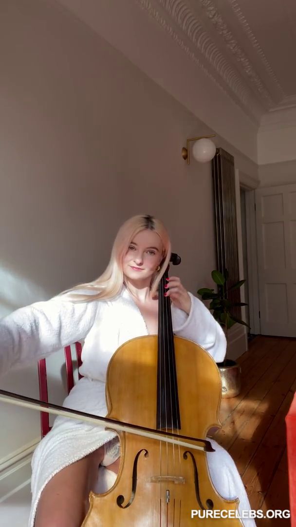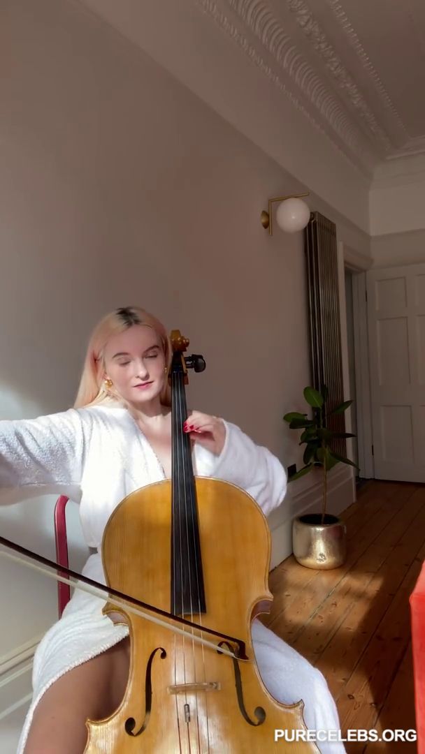 Even during quarantine, stars manage to get into awkward situations. For example, recently the musician Grace Chatto almost flashed her nude pussy during the stream. The girl decided to play the cello. She was dressed in a long white bathrobe. At some point, the robe opened wider and everyone could see the white panties that covered the nude pussy of Grace Chatto.