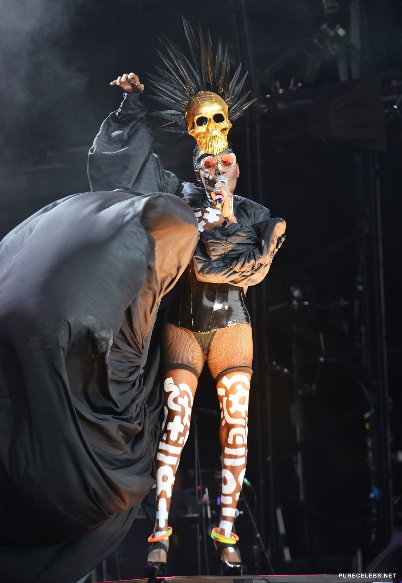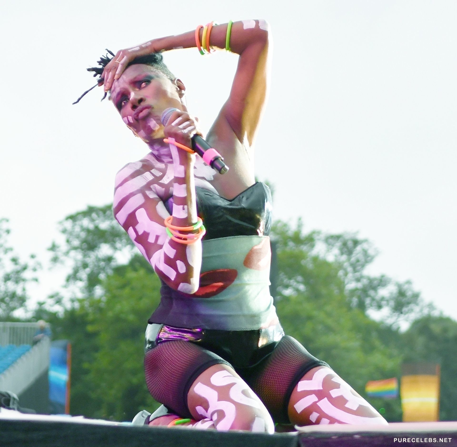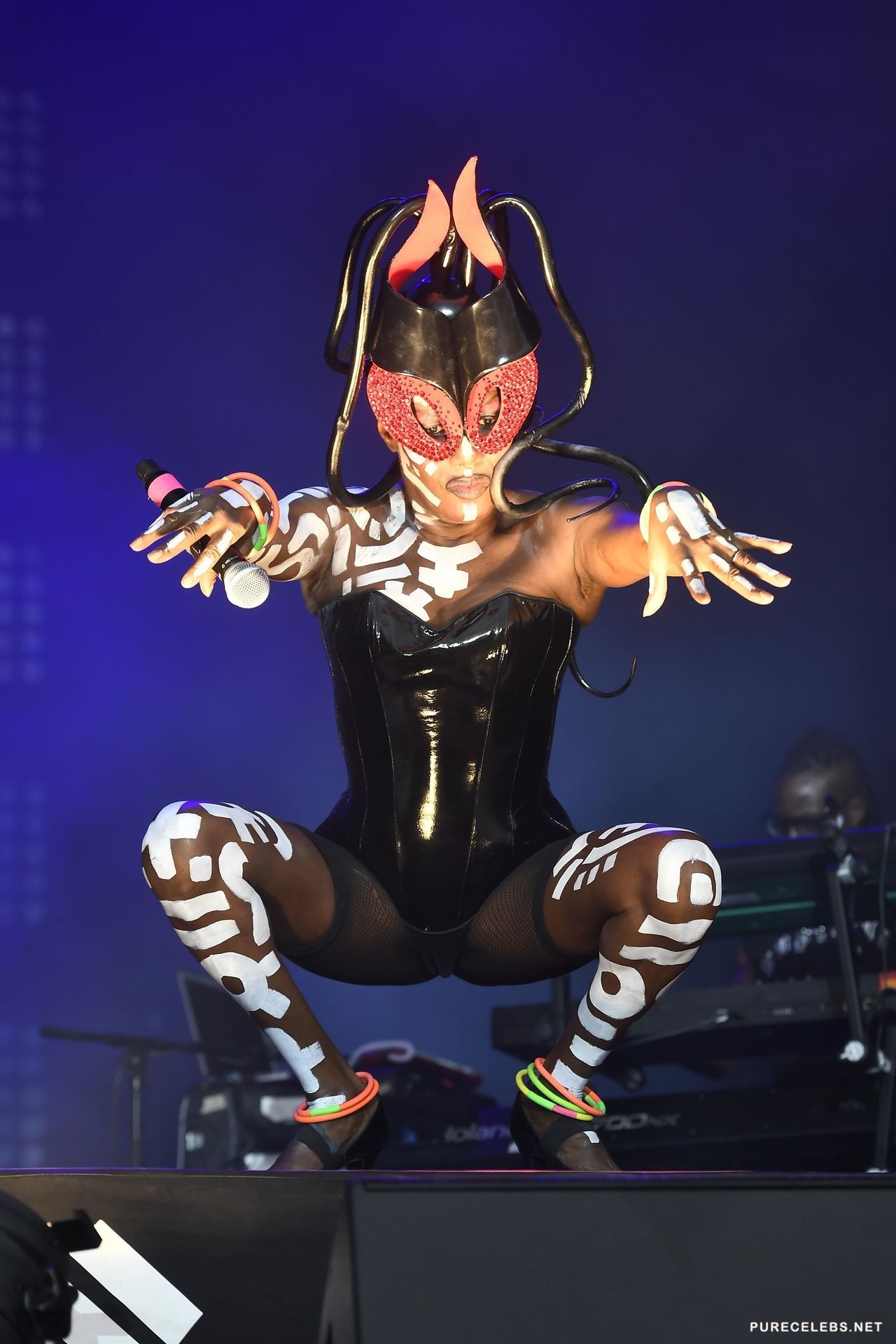 Grace Jones simply loves to perform on stage and chooses very provocative outfits for this. For example, recently a celebrity was wearing a black latex corset, which emphasized her beautiful waist and awesome boobs, as well as black mesh stockings. It is worth noting that her ass looked incredibly seductive in narrow thongs when she leaned on stage. And besides this, you can enjoy the view of her wonderful cameltoe.