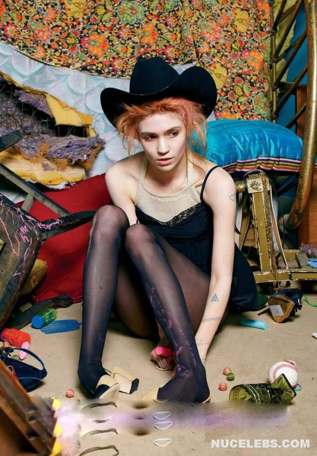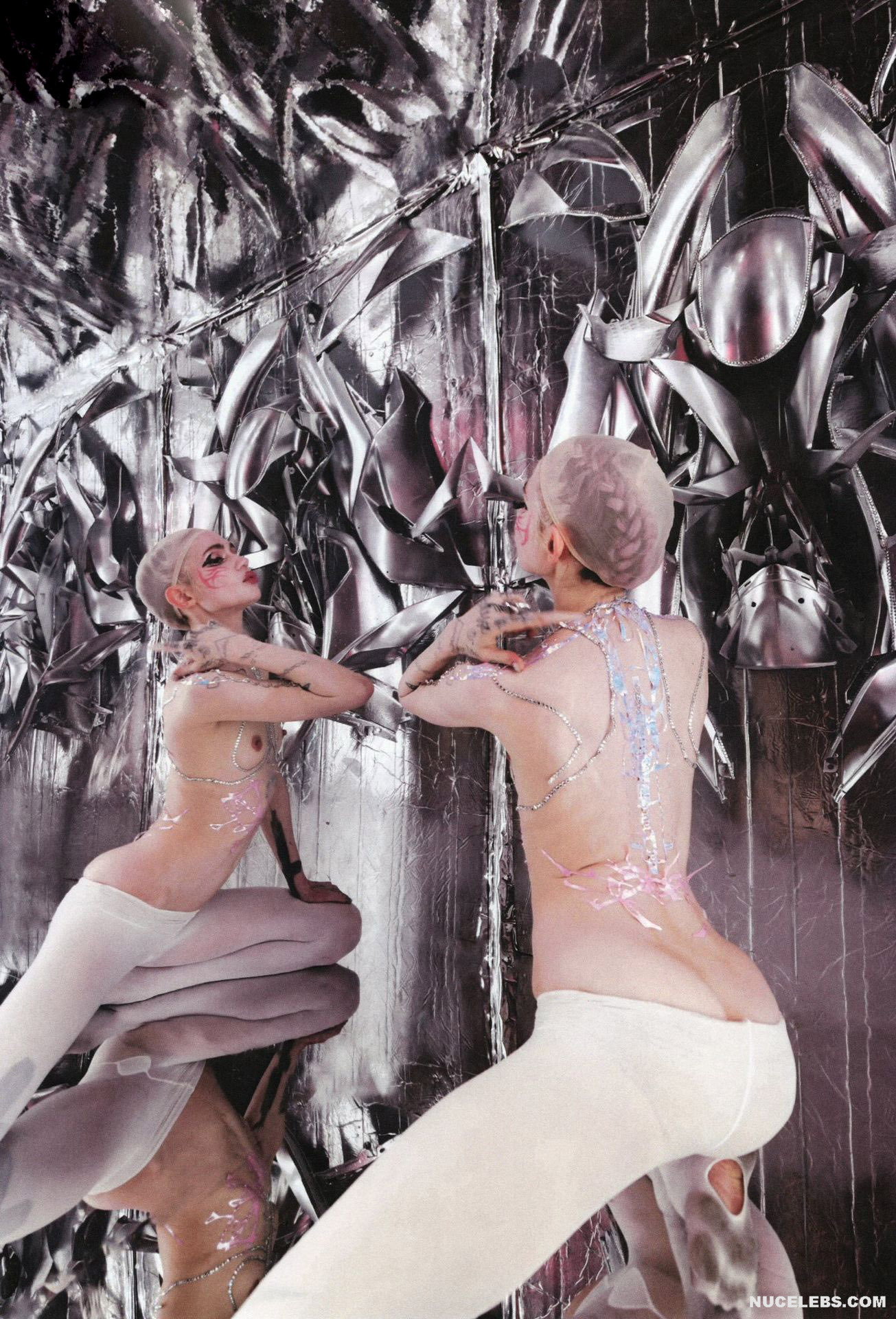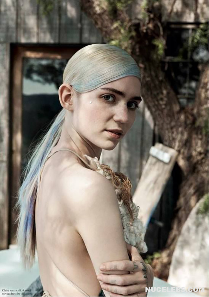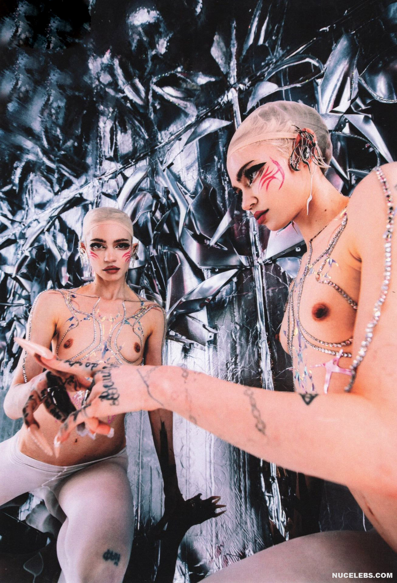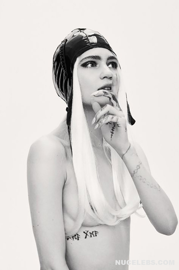 Grimes has a stunning figure that she is not shy about showing off in public. This celebrity is often photographed naked. For example, check out Grimes nude tits with hard nipples, which she showed while sitting on a mirrored floor. Her bare ass peeked out from tight white tights, and silver threads completed her look. And here is another photo in which this Canadian singer poses naked. At the same time, you can see Grimes nude elastic booty in all the details.