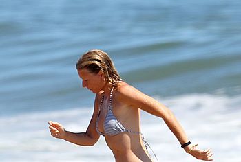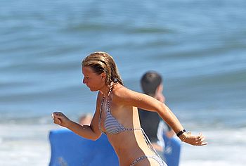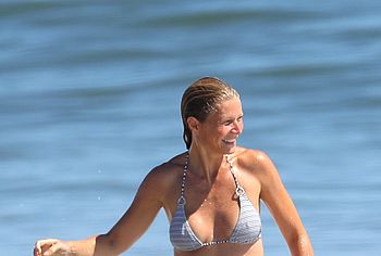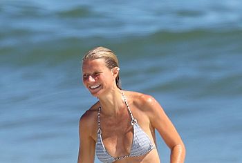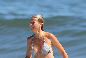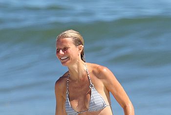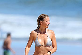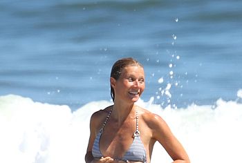 Paparazzi took great photos of Gwyneth Paltrow during her beach vacation. I think they expected to see Gwyneth Paltrow nude tits or booty, but this time they got hot bikini pictures. This American actress decided to tease the audience while having fun on the beach in a wet striped bikini. Needless to say, this celebrity has something to brag about. Her butt in small panties looked very seductive. And Gwyneth Paltrow’s nude boobies were trying to slip out of a small bra.