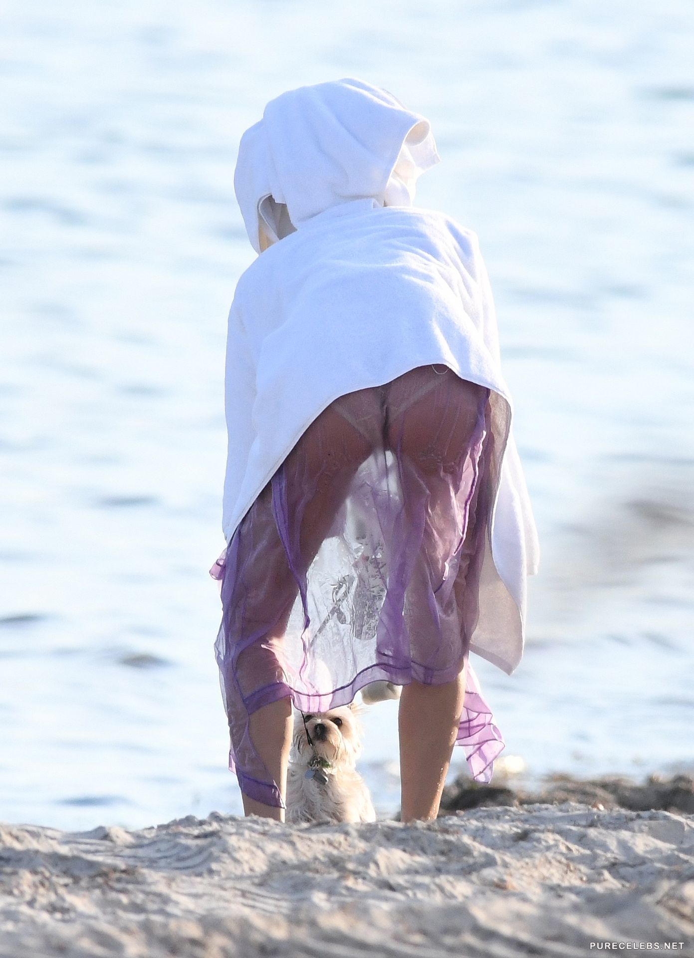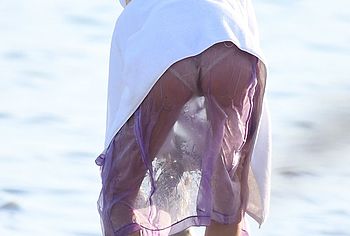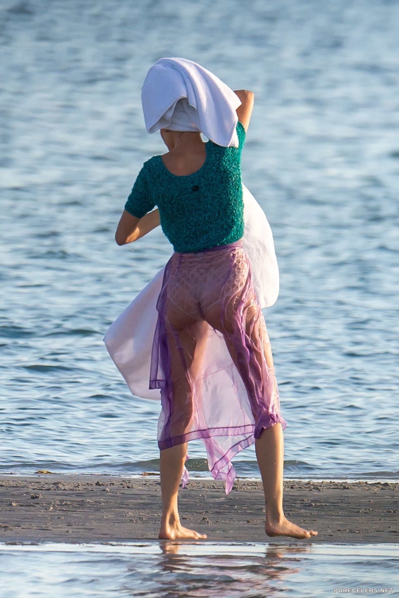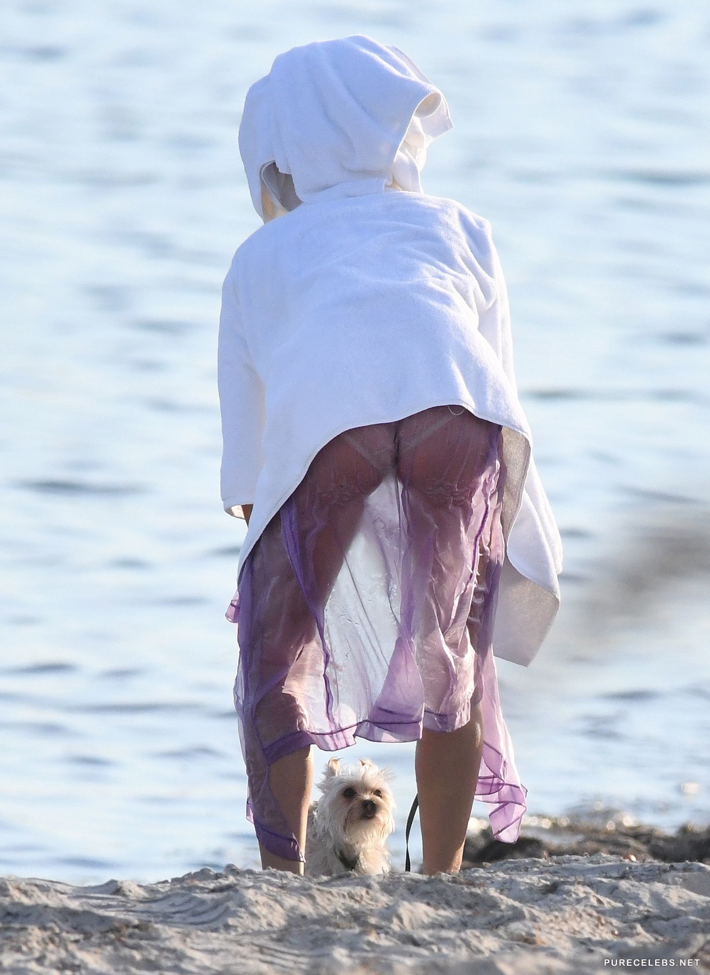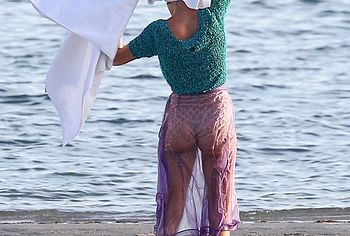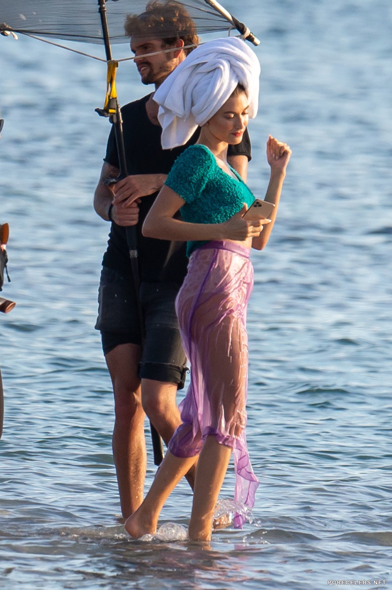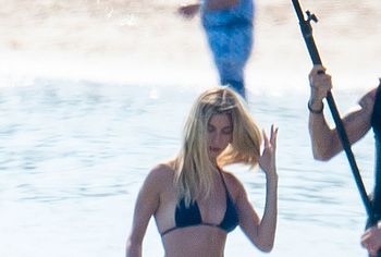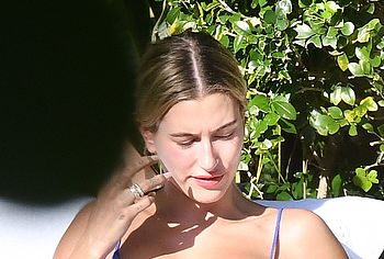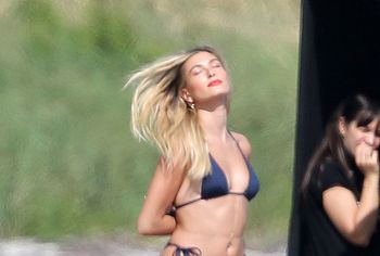 Hailey Bieber-Baldwin often takes part in beach photo shoots, and it is worth noting that this hot blonde looks very seductive in small wet bikinis. For example, when she posed in front of cameras in a blue bikini, and her awesome tits threatened to jump out of the small bra at any time. Also, you are definitely impressed with the photo of this celebrity in narrow thongs, which almost did not cover her amazing booty!