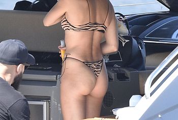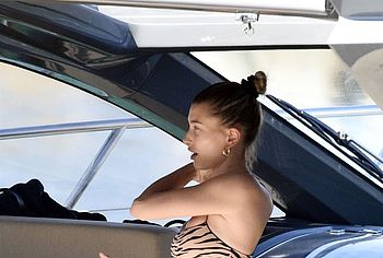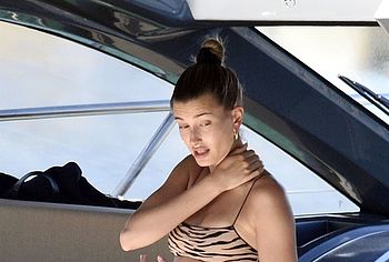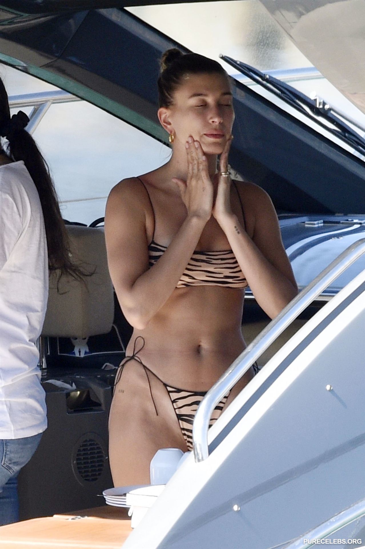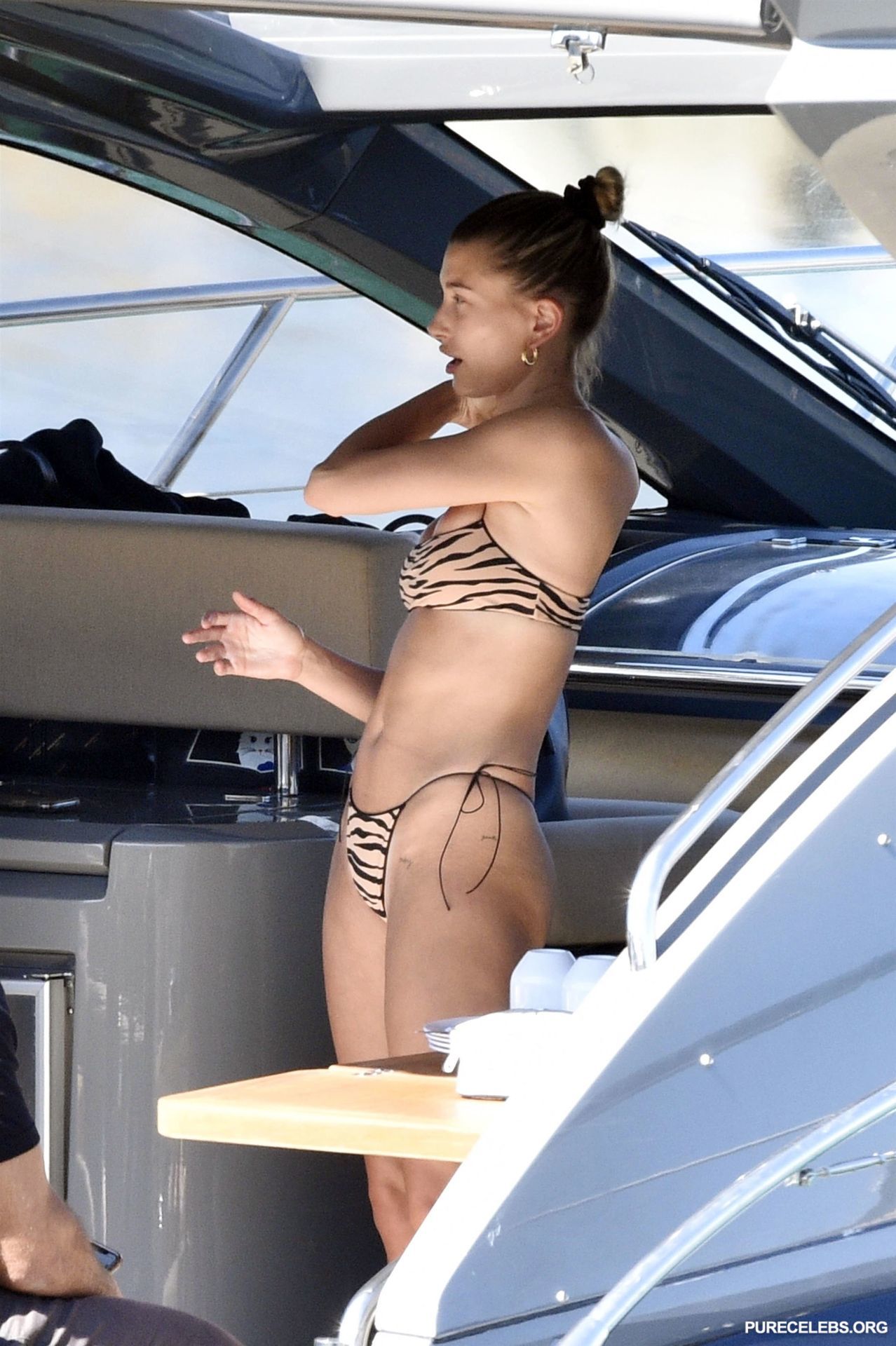 Hot babe Hailey Rhode Bieber nearly flashed her nude ass while relaxing. Paparazzi photographed this American model when she had a great time on the yacht. The girl was wearing a zebra print bikini, the top of which barely covered her juicy boobies. It is also worth noting that her thongs were very tiny. So when Hailey Rhode Bieber corrected them, at some point it seemed that her chic rounded butt became completely nude!