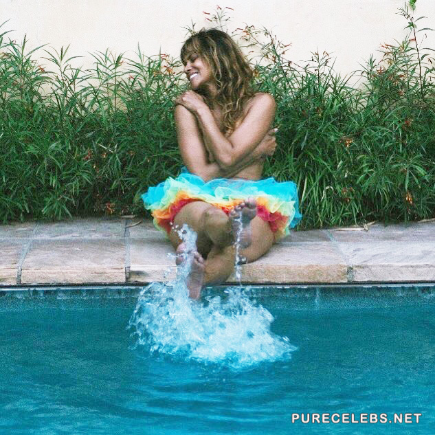 Halle Berry feels like getting naked and jumpin in the pool and so she takes off her top and gets her feet wet in front of the camera. The hottie has not lost her looks with age and she is looking so passionate while she is smiling and shaking her boobs around with a kinky and alluring look in her eyes that seems to be craving cock.