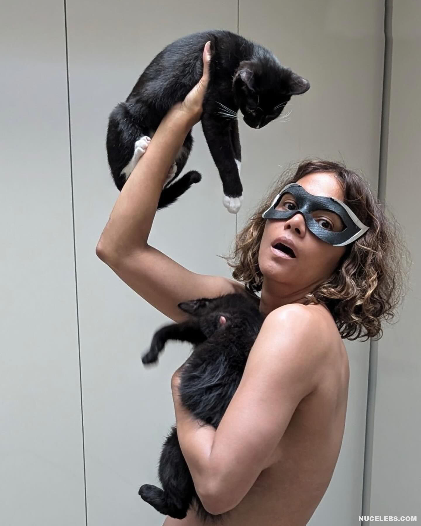 Charming Halle Berry decided to confirm her status as a catwoman and starred in a hot photo shoot. This American actress posed topless, in black panties and a black mask over her eyes. At the same time, she had cute fluffy cats sitting on her hands, which skillfully disguised Halle Berry’s nude boobs. Also, this celebrity was spotted on the balcony with a glass in her hand. And again topless, as you can see!