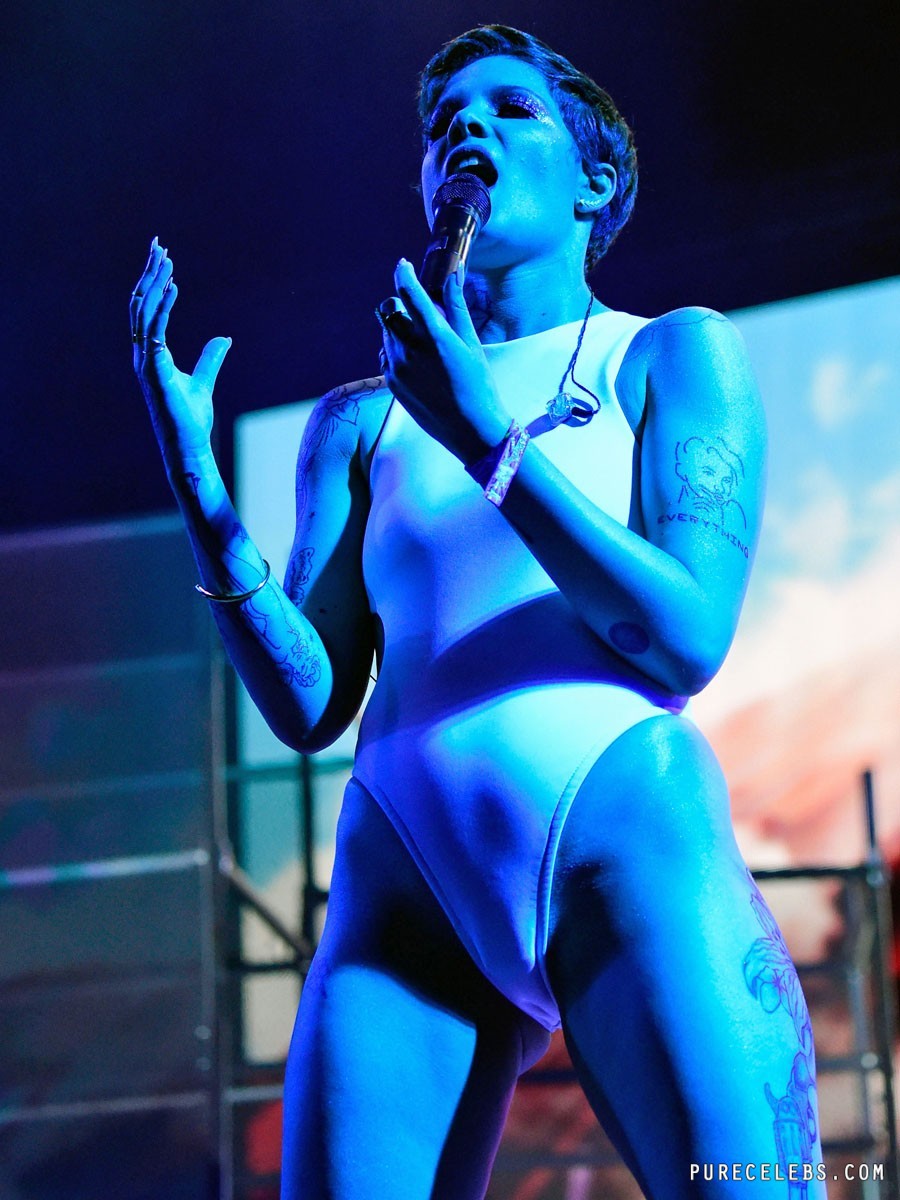 American singer and songwriter Halsey had a little accident while she was exiting a limo. Her dress was too short and when she started leaving her vehicle she revealed her sexy skin color panties. That wasn’t the only moment she unintentionally revealed her body parts. When she was performing she also showed her cameltoe in a latex body suit. Also, she shows her small breasts in a white see-through dress.
