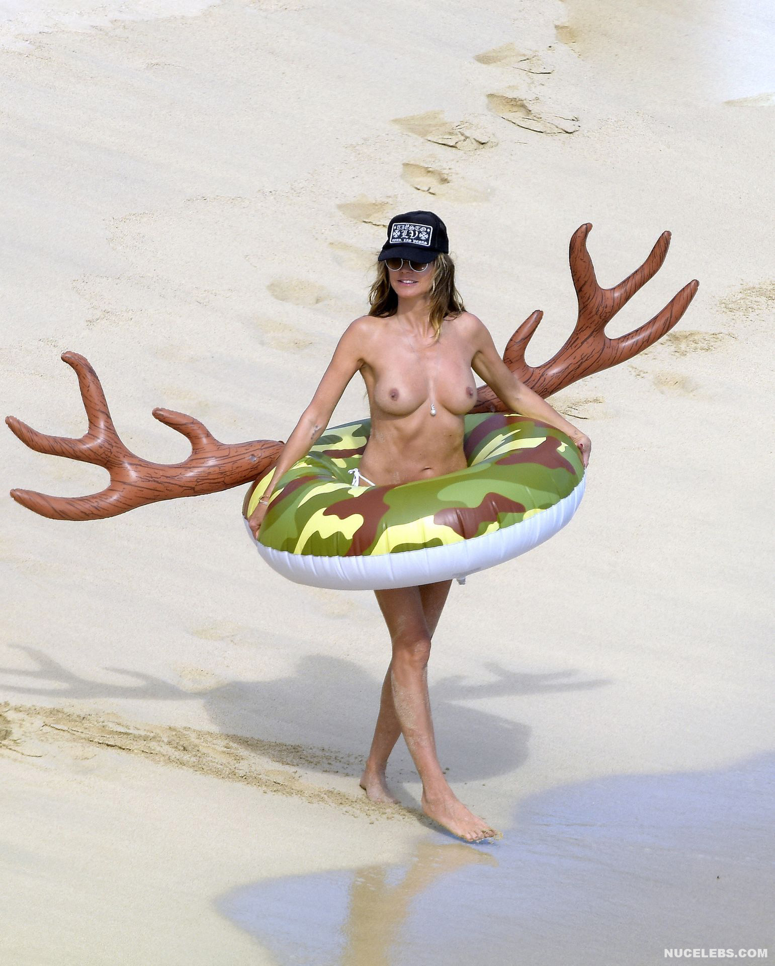Heidi Klum drives the crowd crazy on the beach with her nude tits! This German supermodel, despite her age, still boasts a magnificent figure. Therefore, this celebrity felt confident topless, swimming in the sea, and sunbathing. Heidi Klum nude titties with small nipples looked so sexy! It was also impossible to take your eyes off her nice booty in the tight, wet white thong.